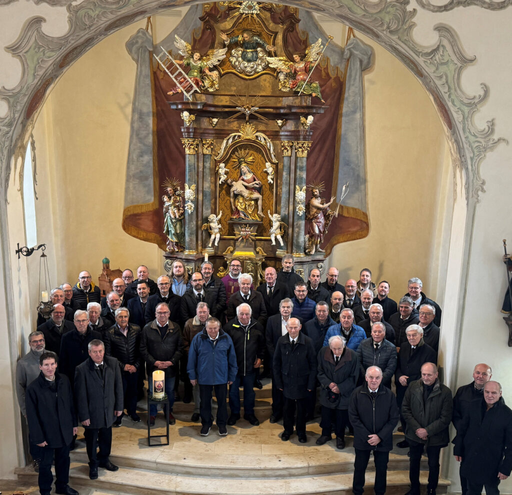 Osterhofen – Letztmals hatte sich die Jüngere Marianische Bruderschaft am 14. Dezember 2017 in der Kapelle Mariä Opferung in Osterhofen zu ihrem Bruderschaftstag getroffen. Seitdem hatte die Kapelle – über mehr als 300 Jahre die Heimstatt der 1718 gegründeten Gebetsgemeinschaft (wie auch der bereits 1702 gegründeten Älteren Marianische Bruderschaft) – für die traditionsreiche Zusammenkunft nicht mehr zur Verfügung gestanden. Beide Gebetsgemeinschaften waren in der Zwischenzeit in die Pfarrkirche Haisterkirch ausgewichen, weil ihre Stammkapelle baupolizeilich gesperrt war und sich die Renovation über Jahre hinzog. Nach der Wiedereröffnung am vergangenen Sonntag, 7. Dezember 2025, konnte die Jüngere Marianische Bruderschaft jetzt, am 11. Dezember 2025, erstmals wieder in „ihrer“ Kapelle die Heilige Messe feiern. Die Freude war groß, das war allen anzumerken. Die Ältere Marianische Bruderschaft wird ihre Rückkehr in die Kapelle am 12. Februar 2026 feiern.