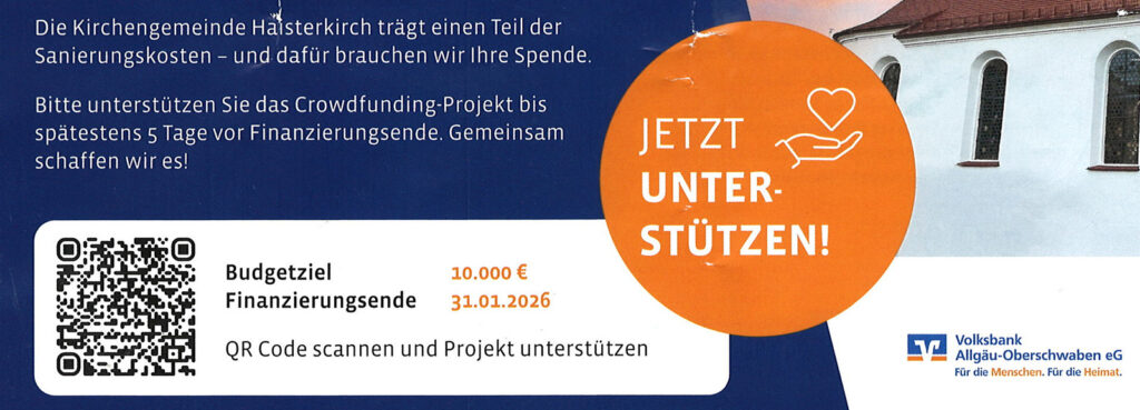 Zum Schluss wies Pfarrer Werner noch auf die laufende Spendenaktion der Kirchengemeinde Haisterkirch zugunsten der Osterhofener Kapelle hin. In Zusammenarbeit mit der Volksbank Allgäu-Oberschwaben erfolgt diese als sogenanntes Crowdfunding. Bis 31. Januar 2026 geht die Aktion, bei der die Bank zu jeder 10-€-Spende ihrerseits noch 10 € dazugibt. Man könne auch mehr geben, schmunzelte Stefan Werner, die Zugabe von Seiten der Bank sei aber auf 10 € pro Spender beschränkt. Bis Ende Januar geht diese Aktion, nicht bloß bis Ende Dezember, wie von der Bildschirmzeitung fälschlicherweise gemeldet.