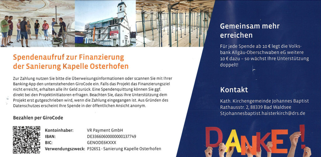 Infos zur Spendenaktion gibt es bei Rolf Heber, dem Gewählten Vorsitzenden der Kirchengemeinde Haisterkirch, und bei Kirchenpflegerin Waltraud Ruf. Dort bekommt man auch das oben abgebildete Faltblatt; es liegt auch in der Kapelle in Osterhofen sowie in der Pfarrkirche Haisterkirch aus.