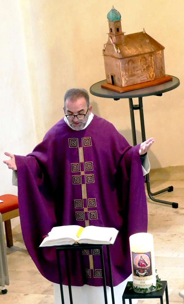 Pfarrer Stefan Werner war Zelebrant bei der Bruderschaftsmesse in der Osterhofener Kapelle Mariä Opferung. Hinter ihm ist das Kemmler-Modell der Kapelle zu sehen, vorne rechts die Bruderschaftskerze.