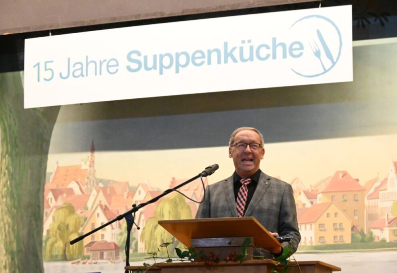 Nach seiner Begrüßung rief er Mitvorständler Wolfgang Pfefferle auf die Bühne. Zusammen erzählten sie die Entstehungsgeschichte der Suppenküche vor 15 Jahren. Wolfgang Pfefferle als Ideengeber fand in Rudi Heilig einen kongenialen Mitstreiter und so fing alles an. Heute arbeiten 35 Ehrenamtliche dafür, dass es in der Suppenküche das ganze Jahr von Montag bis Freitag für Bedürftige eine warme Mahlzeit gibt. Die Mahlzeiten werden im Kloster gekocht und von den Ehrenamtlichen liebevoll ausgegeben.