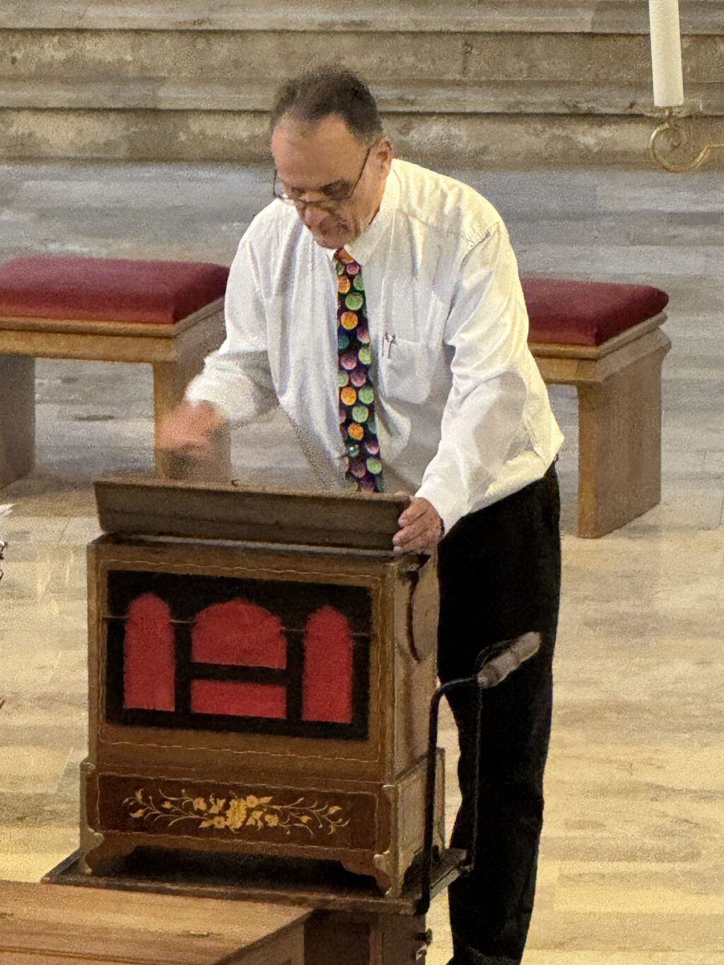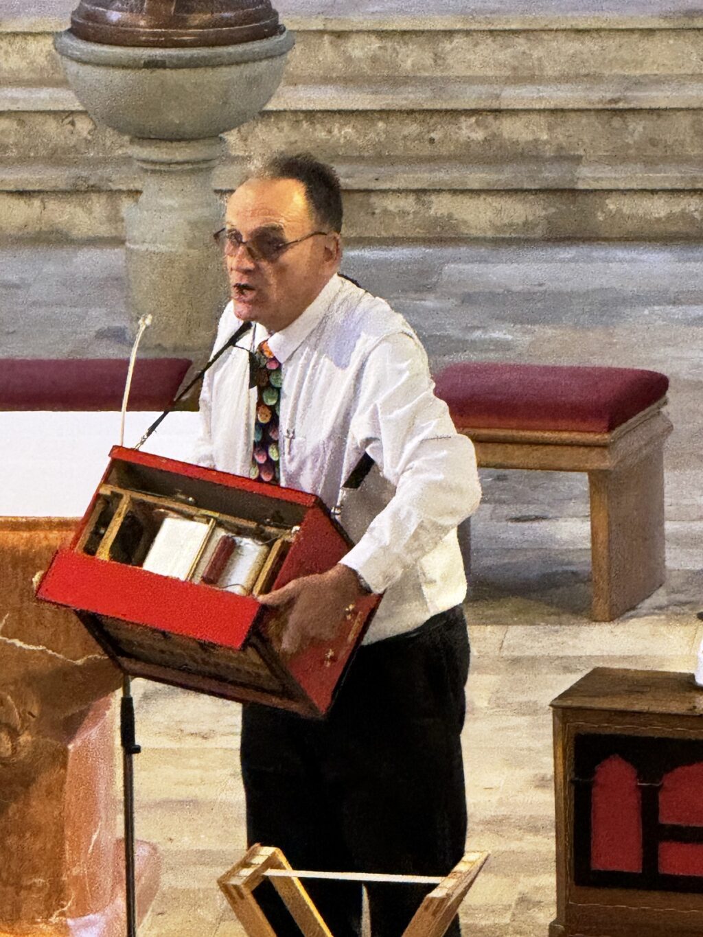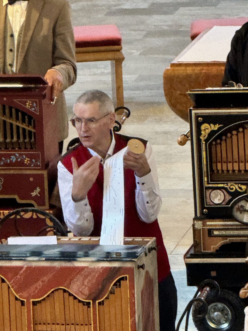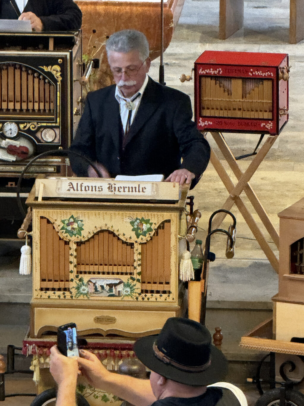 Auf der Orgel und den Drehorgeln kamen insgesamt 18 Musikwerke verschiedenster Stilrichtungen zu Gehör. Manche bekannten Stücke animierten zum Mitsingen, so auch bei der Präsentation der kleinen Orgel mit den Choralweisen „Nun danket all …“ oder „Ich bete an die Macht der Liebe“. Die Zuhörer wurden überrascht von dem Gebotenen und staunten über die Vielzahl an Tönen und Klangfarben verschiedenster Instrumentengattungen, die aus so einer Drehorgel entlockt werden können. Die Funktionsweise der Drehorgeln erklärte Edi Hofmann.