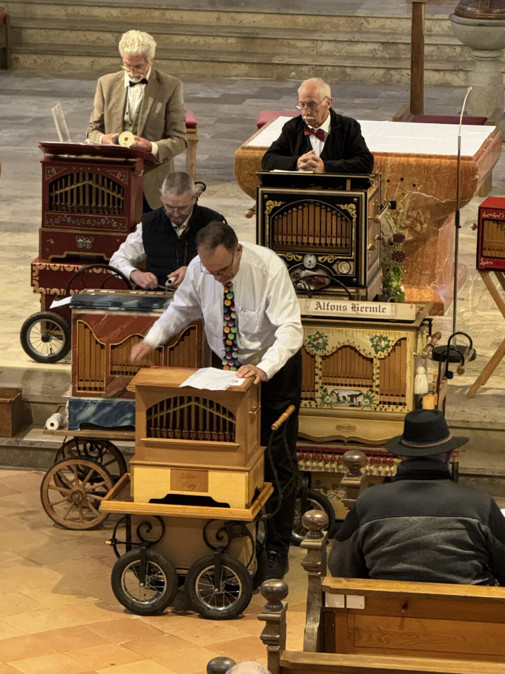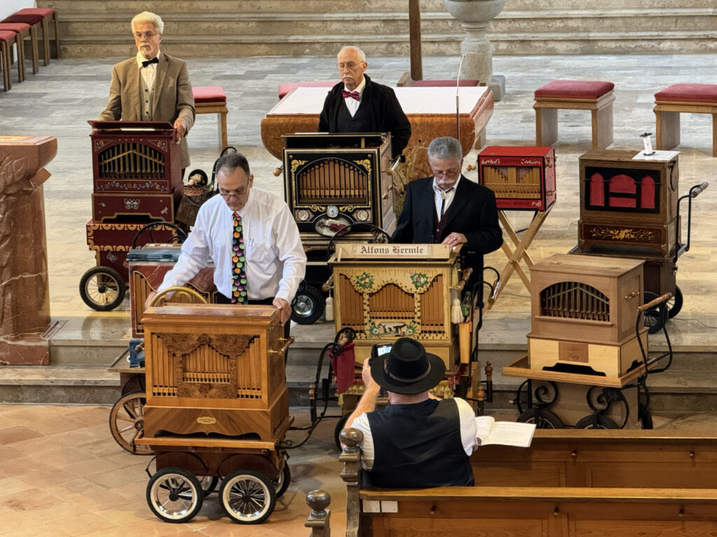 Mitgebracht hatten die Drehorgelspezialisten insgesamt neun Drehorgeln verschiedenster Größen. Alle sechs Könner mit den Vornamen Alfons, Edi, Johann, Helmut, Roberto und Walter verbindet Talent und die Freude am Drehorgelspiel und alle gehören dem Seniorenalter an und nahmen zum Teil weite Fahrwege auf sich, sogar aus der rätoromanischen Schweiz. Nach der Begrüßung durch Edi Hofmann nahm dieser Platz an der allseits gelobten Haisterkircher Wiedemann-Orgel und interpretierte klangvoll und harmonisch mit Roberto an der blauen Drehorgel „Morgenstimmung“ (E. Grieg).