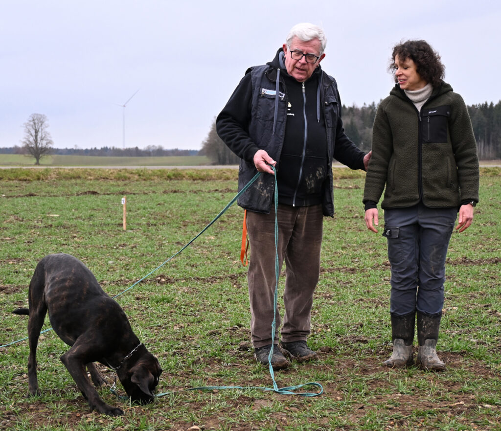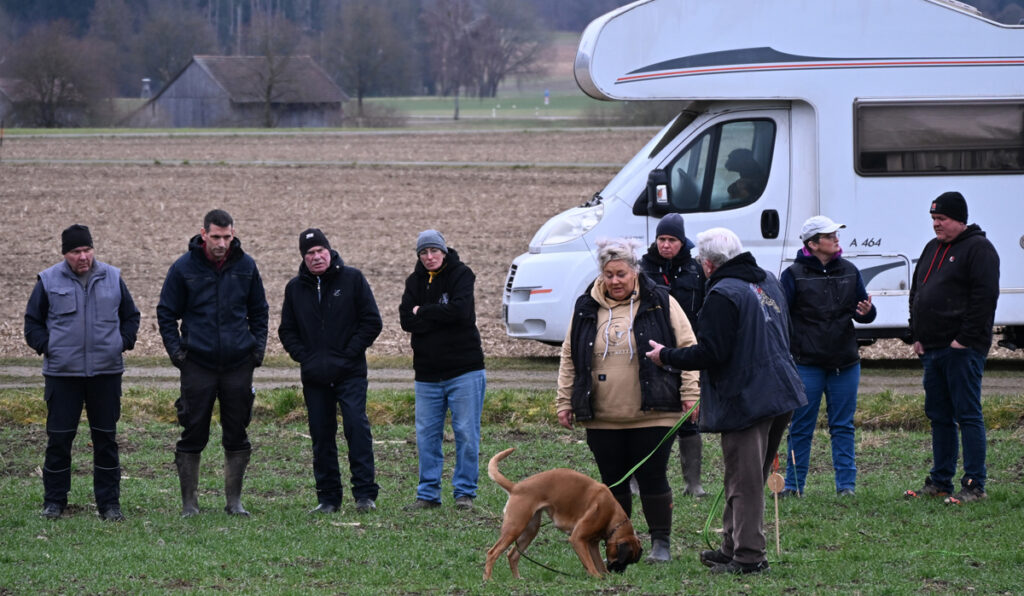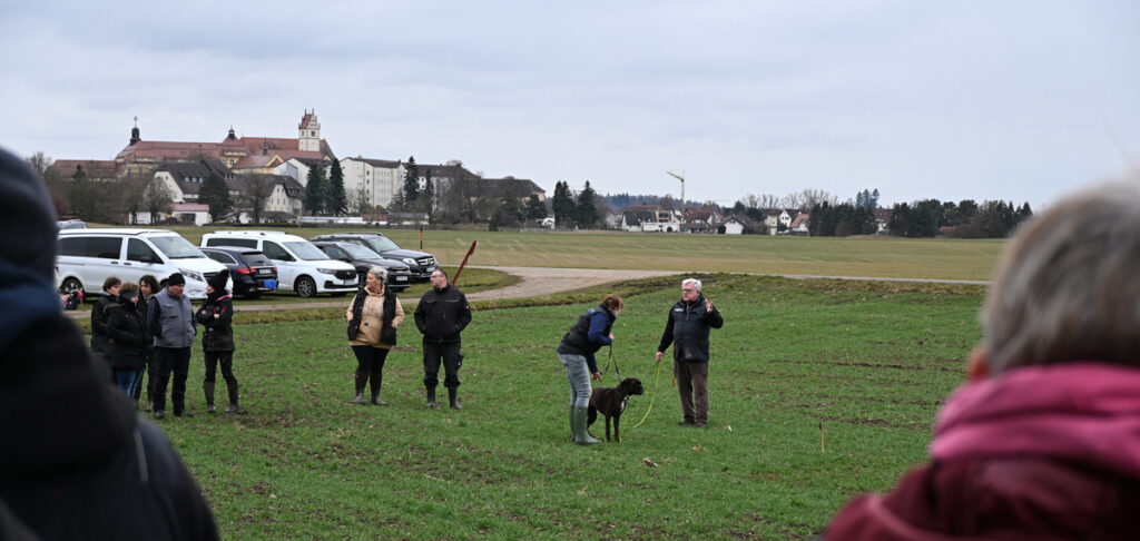 Daniel Theurer zeigte, wie er eine Fährte Tritt für Tritt anlegt, mit Futter und dem Verweisen der Gegenstände umgeht, wie er die Leine händelt (mal stramm, mal locker) und die Winkel ausarbeitet – eine „Lehrstunde“ vom Feinsten.