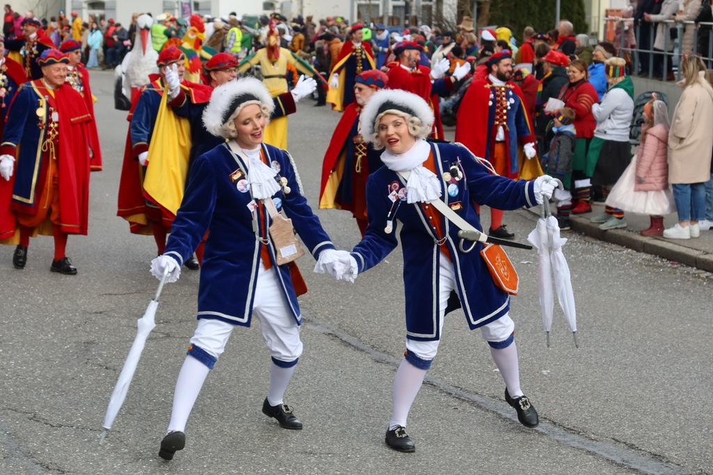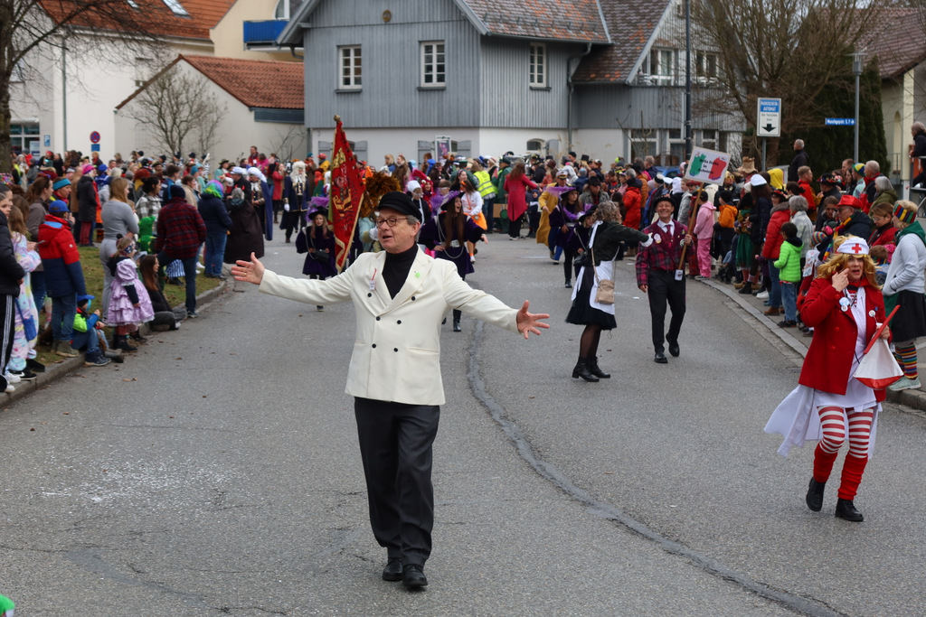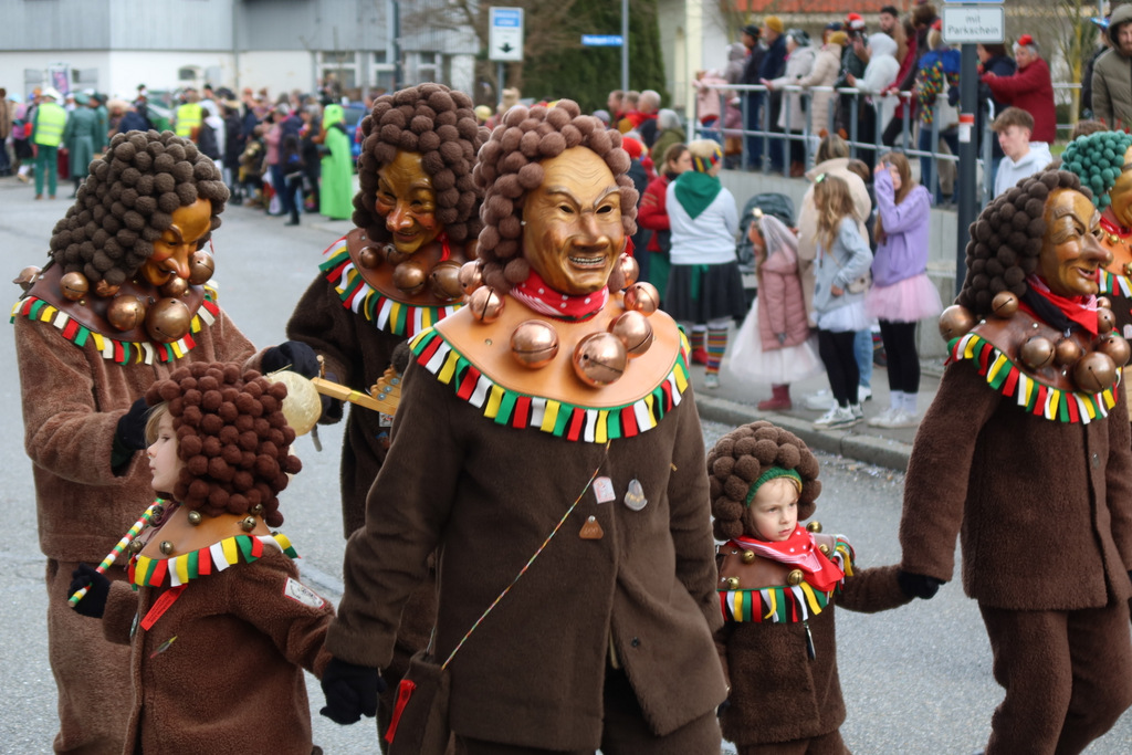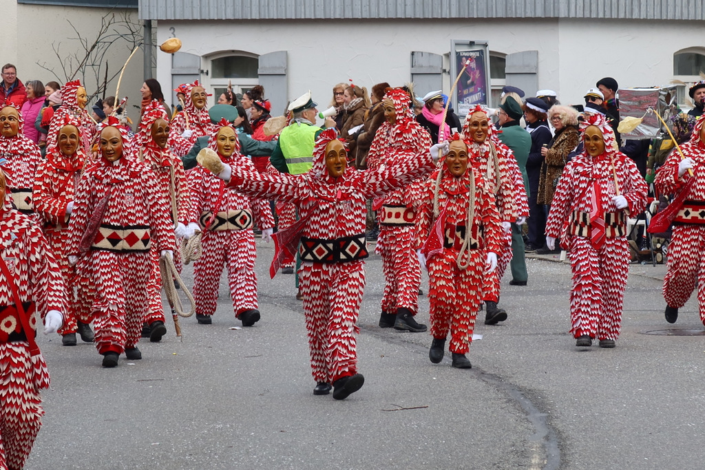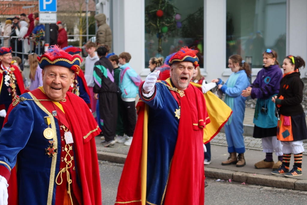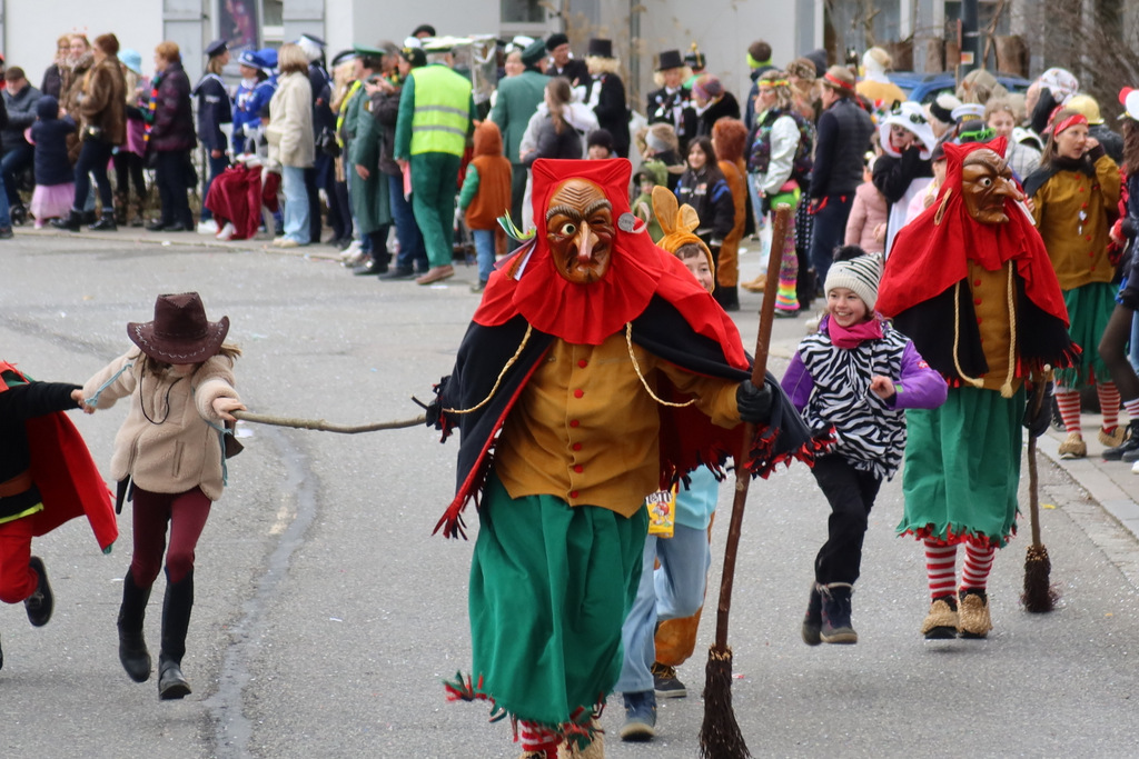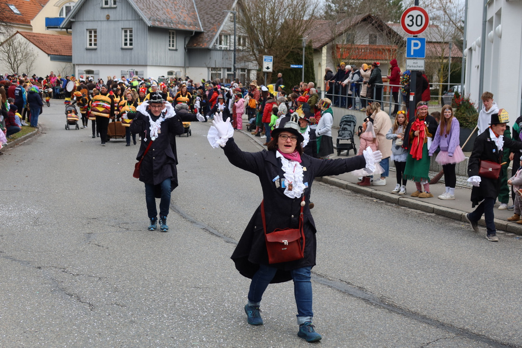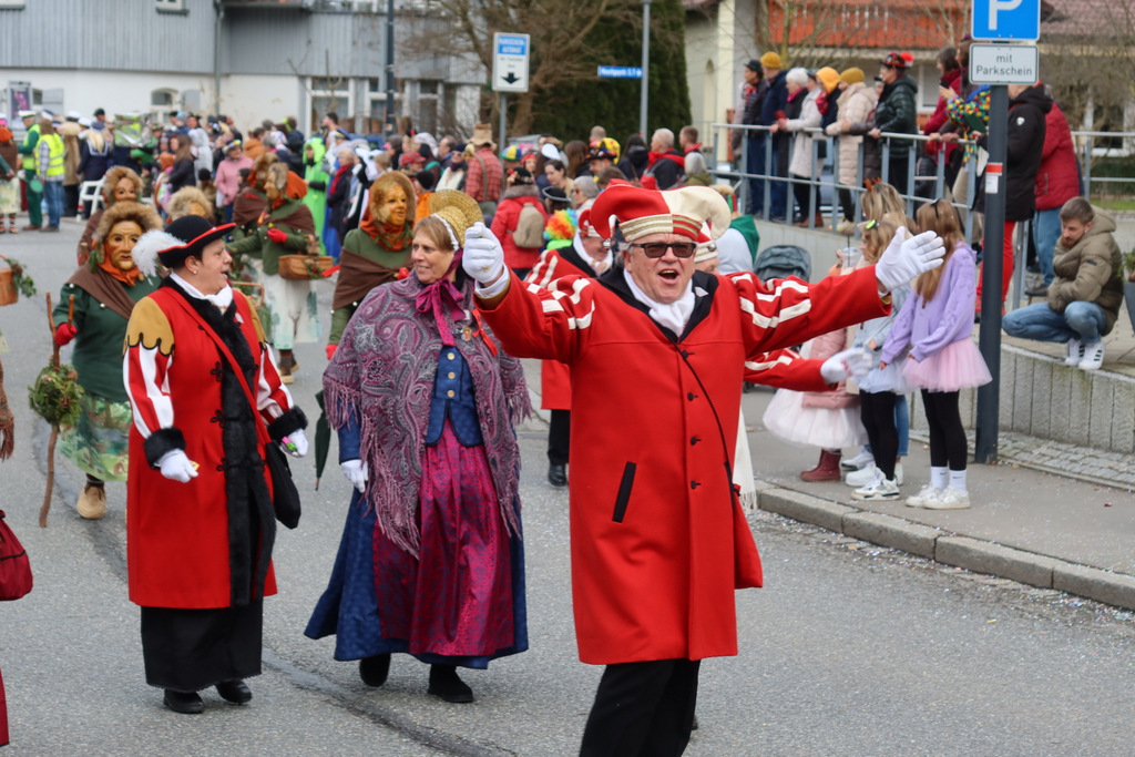 Auffallend viele Maskenträgerinnen und Maskenträger der hiesigen wie auch der befreundeten Zünfte beteiligten sich am Umzug. Auch erfreulich viele närrische Gruppierungen aus der Stadt glänzten nicht nur durch die Buntheit der Kostüme, sondern durch ihr närrisches Tun mit viel Bewegungsfreude und kräftigen AHA-Rufen. Allseits erkennbar war die freundliche, frohmachende Zuwendung zu all den Menschen, ob groß oder klein, an derUmzugsstrecke.