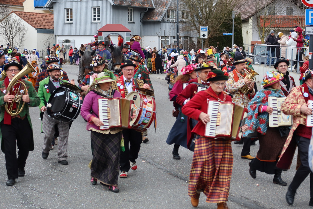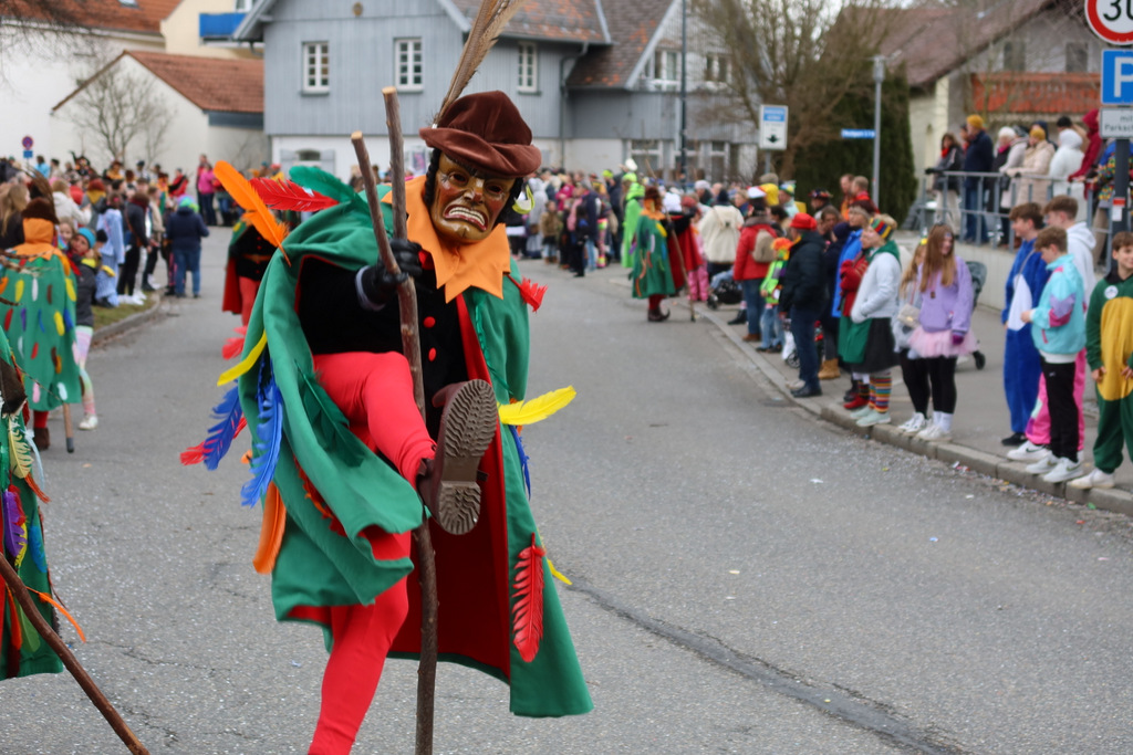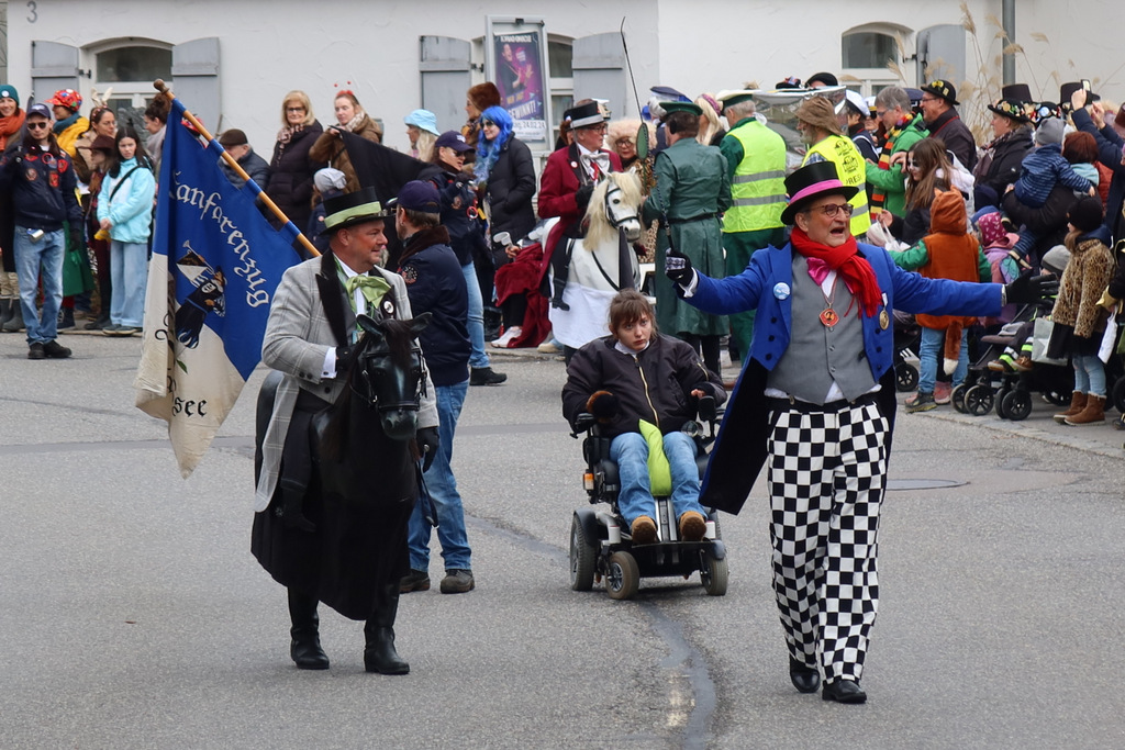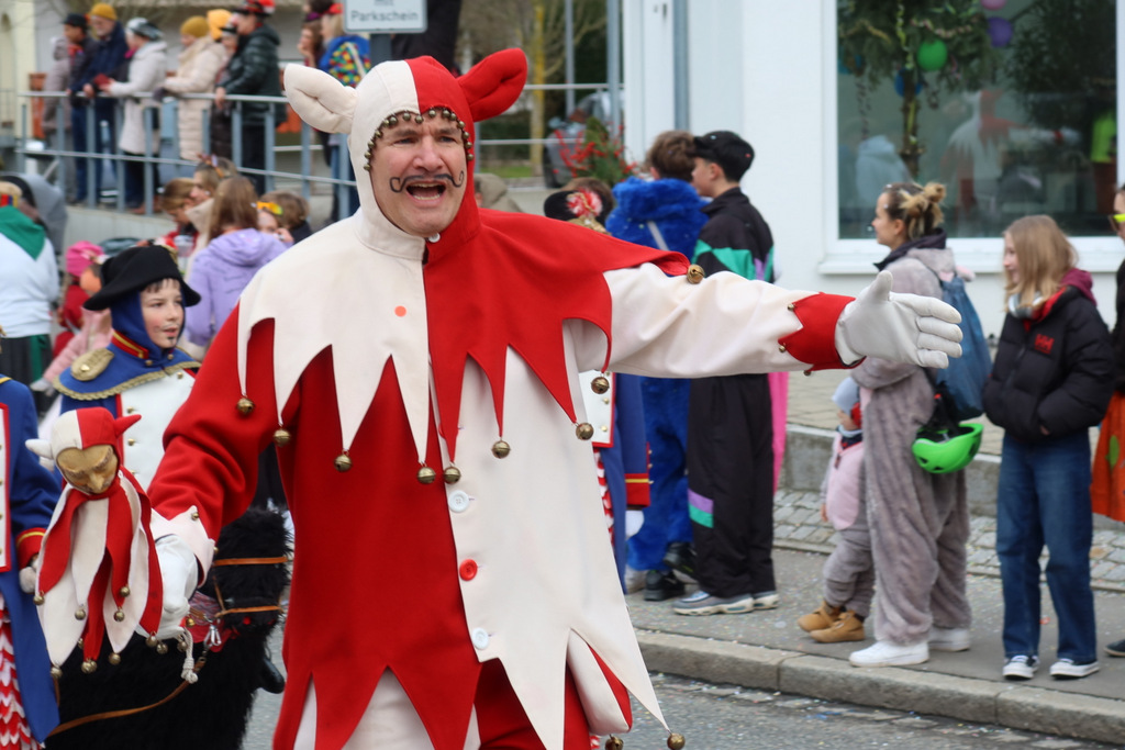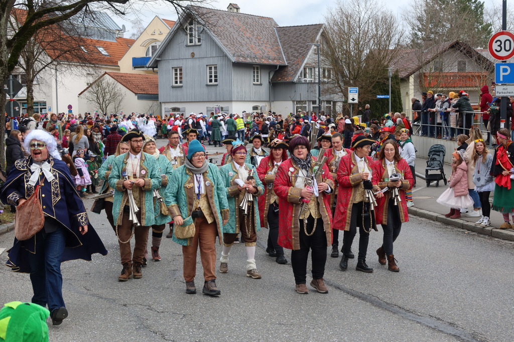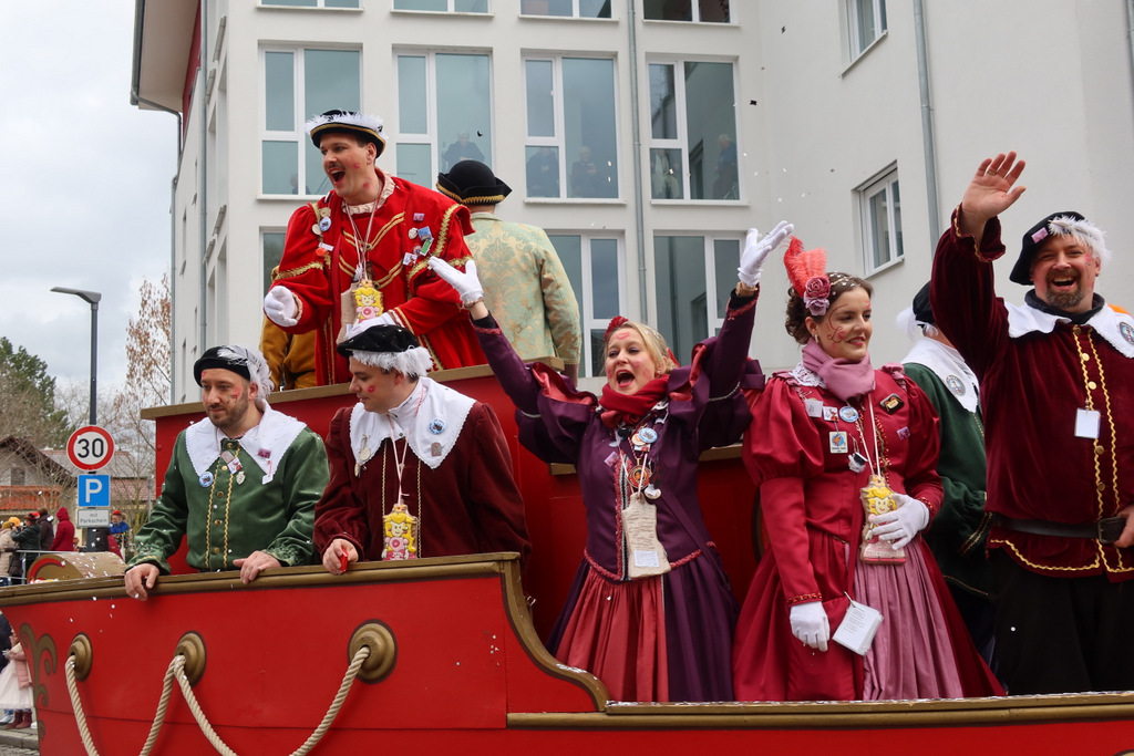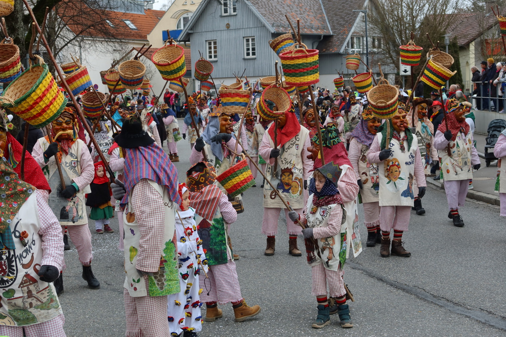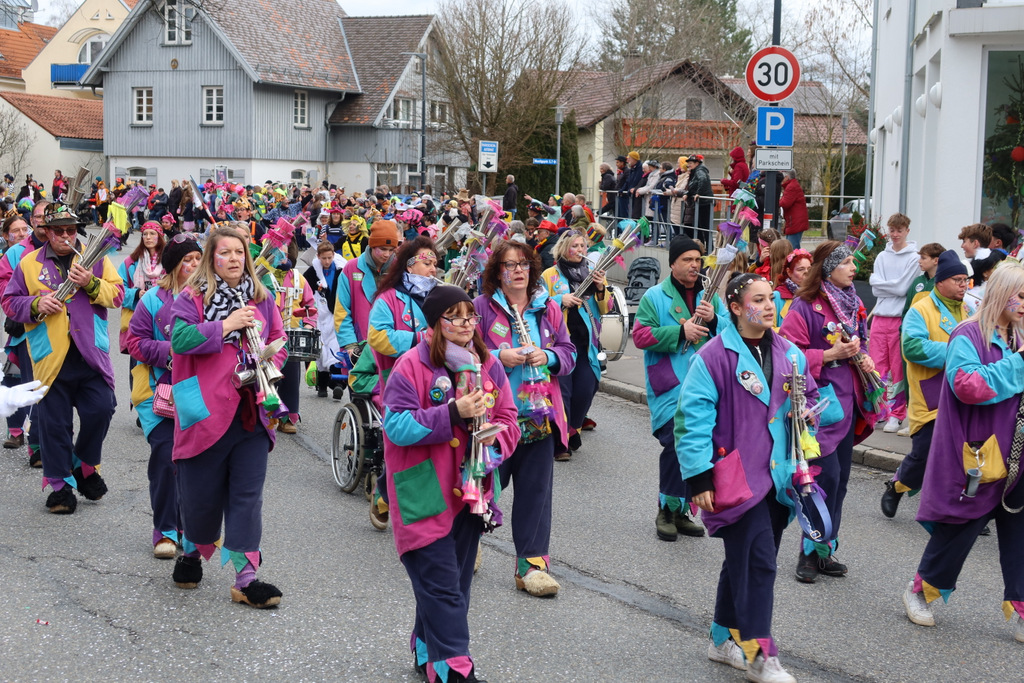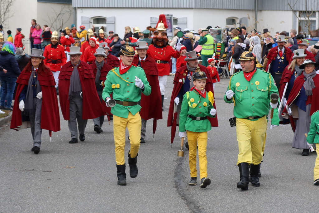 Auffallend viele Maskenträgerinnen und Maskenträger der hiesigen wie auch der befreundeten Zünfte beteiligten sich am Umzug. Auch erfreulich viele närrische Gruppierungen aus der Stadt glänzten nicht nur durch die Buntheit der Kostüme, sondern durch ihr närrisches Tun mit viel Bewegungsfreude und kräftigen AHA-Rufen. Allseits erkennbar war die freundliche, frohmachende Zuwendung zu all den Menschen, ob groß oder klein, an derUmzugsstrecke.