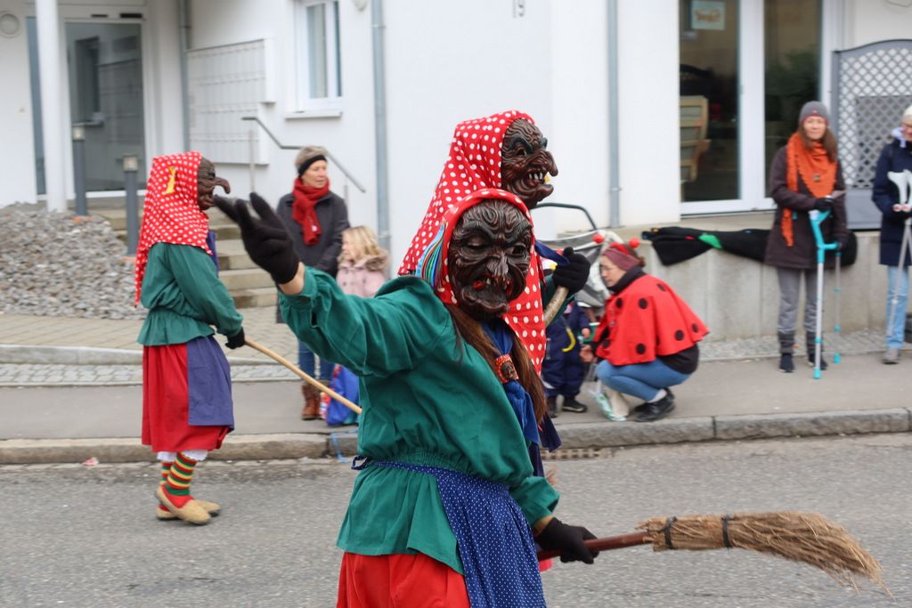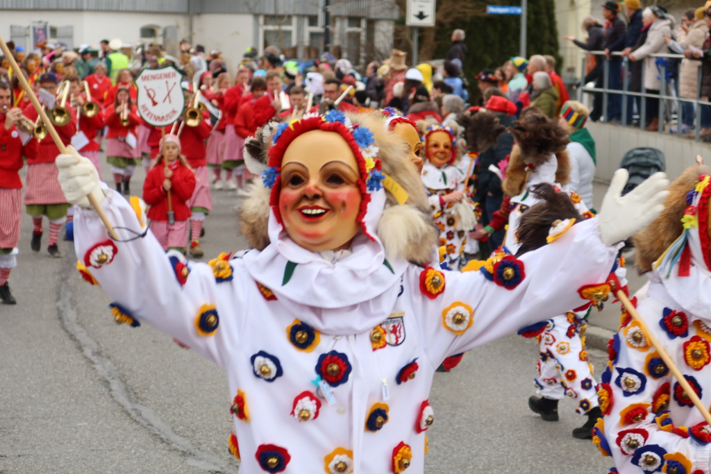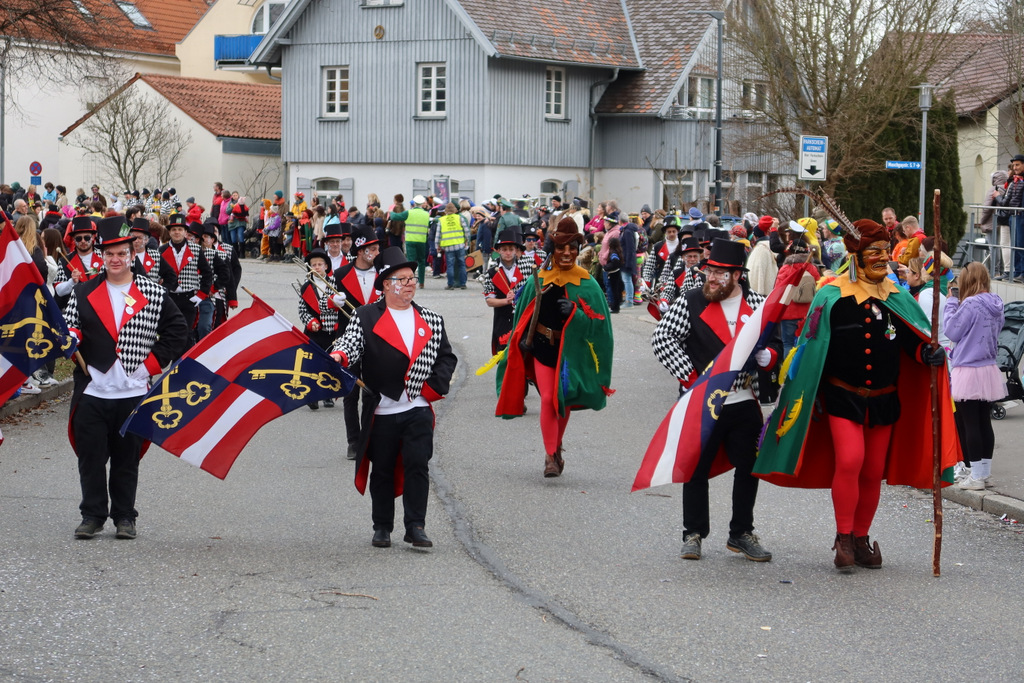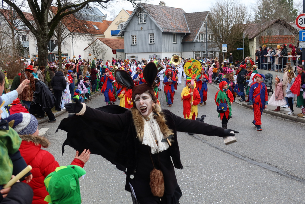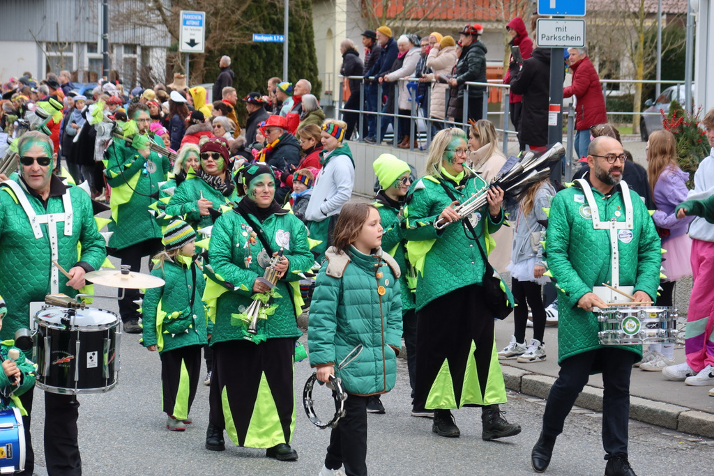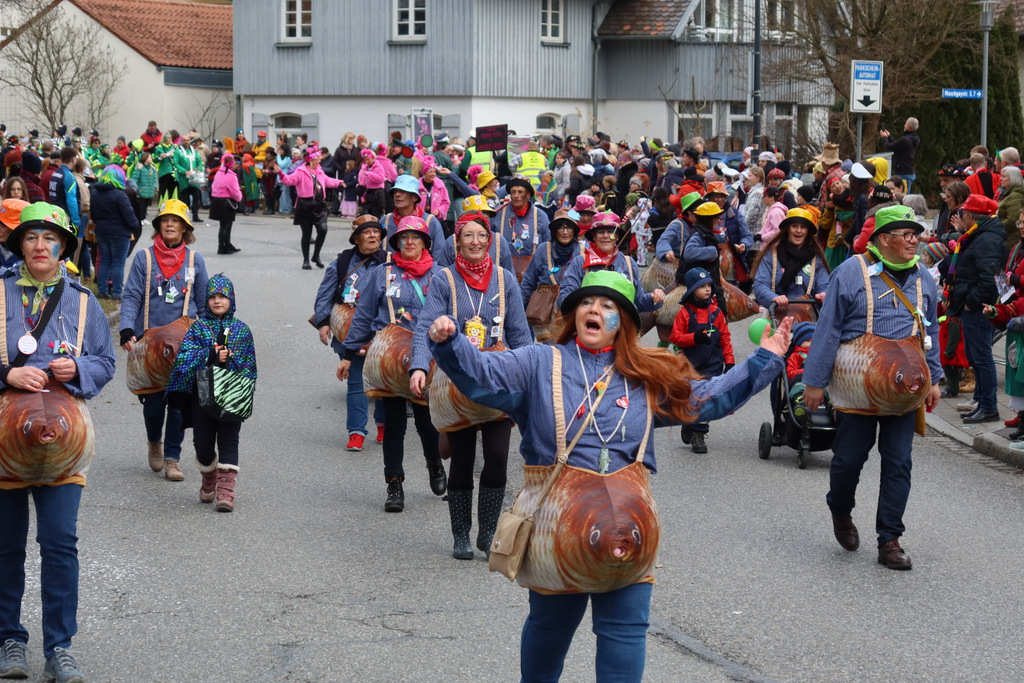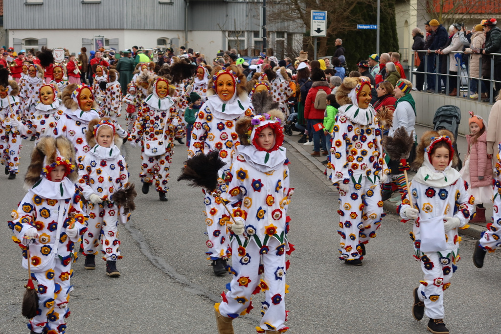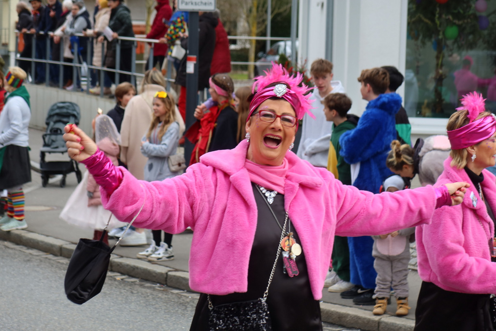 Auffallend viele Maskenträgerinnen und Maskenträger der hiesigen wie auch der befreundeten Zünfte beteiligten sich am Umzug. Auch erfreulich viele närrische Gruppierungen aus der Stadt glänzten nicht nur durch die Buntheit der Kostüme, sondern durch ihr närrisches Tun mit viel Bewegungsfreude und kräftigen AHA-Rufen. Allseits erkennbar war die freundliche, frohmachende Zuwendung zu all den Menschen, ob groß oder klein, an derUmzugsstrecke.
