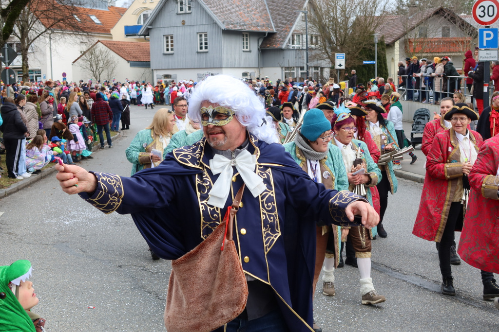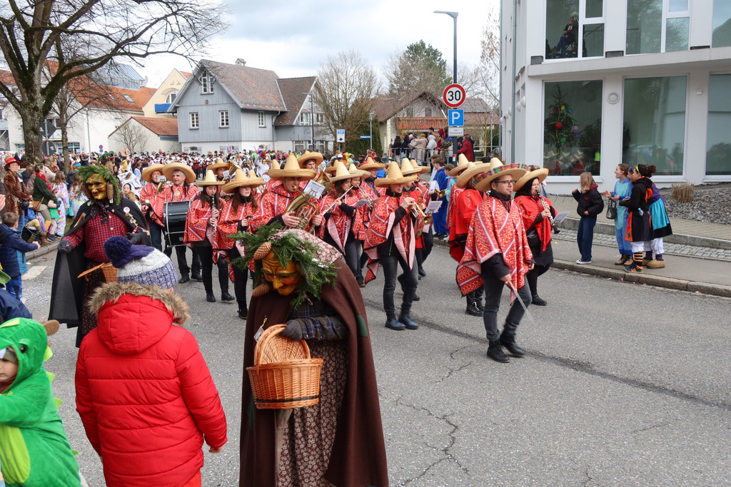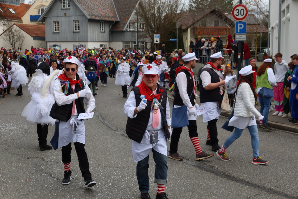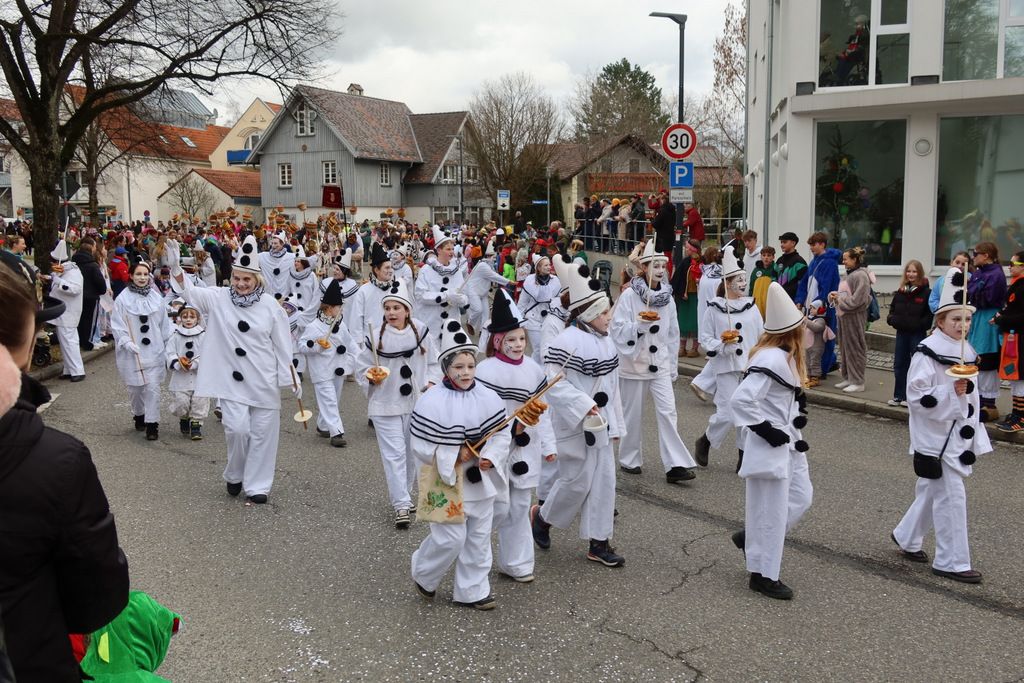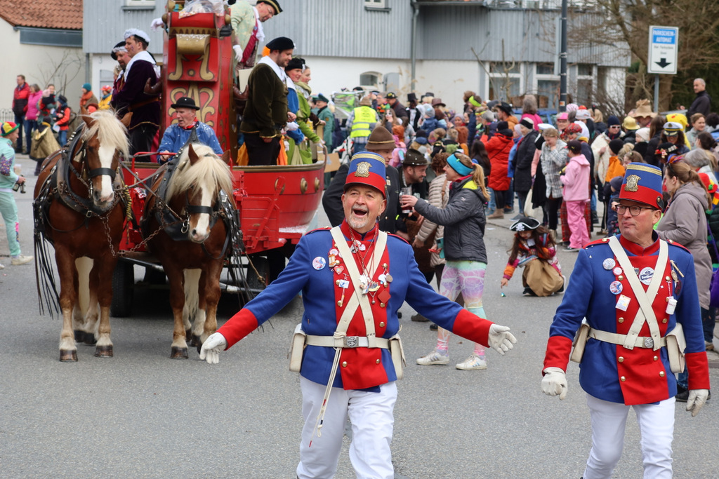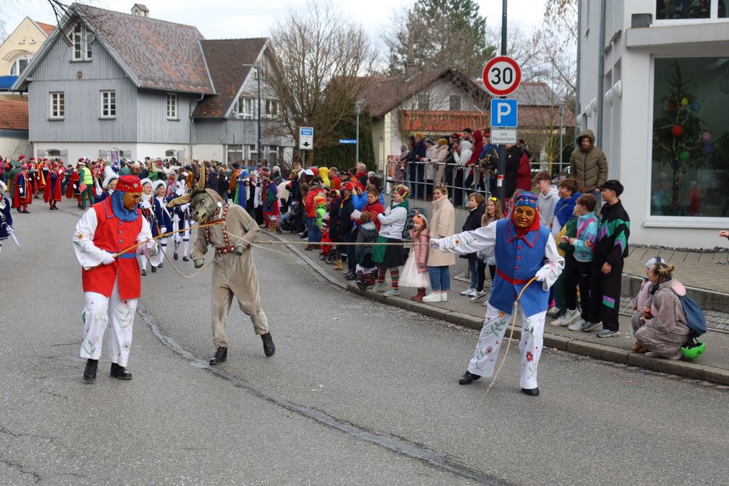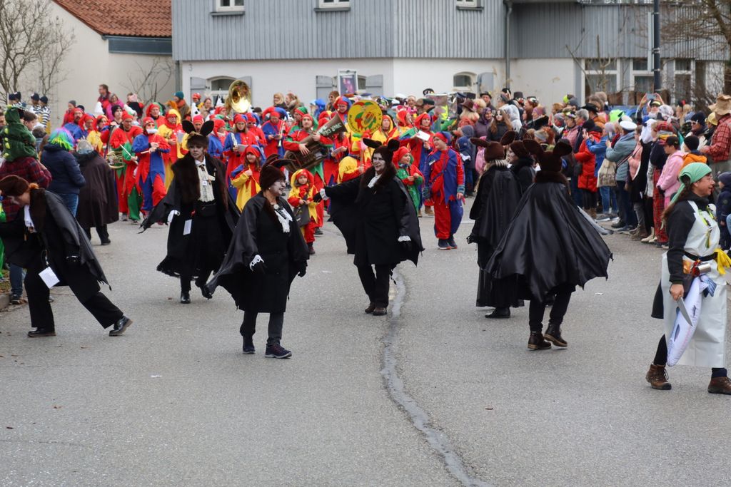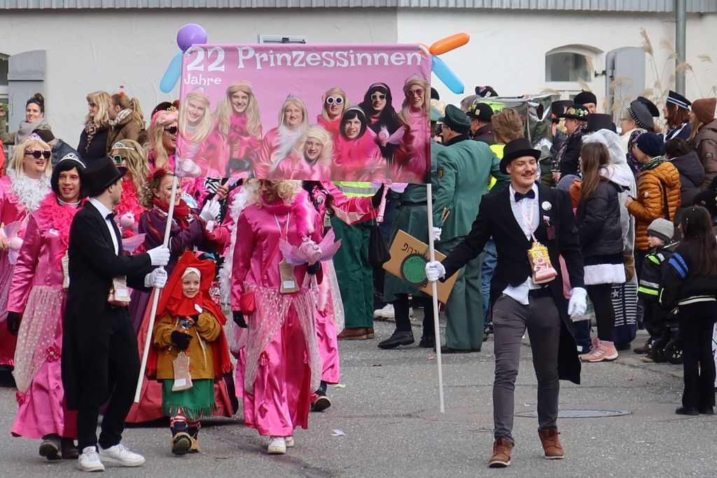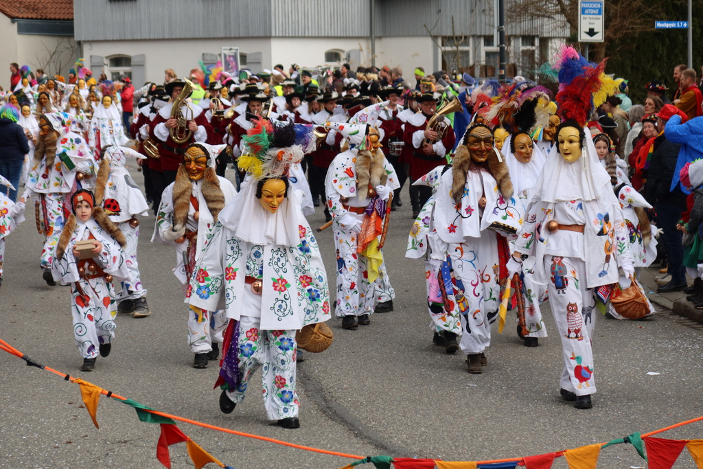 Auffallend viele Maskenträgerinnen und Maskenträger der hiesigen wie auch der befreundeten Zünfte beteiligten sich am Umzug. Auch erfreulich viele närrische Gruppierungen aus der Stadt glänzten nicht nur durch die Buntheit der Kostüme, sondern durch ihr närrisches Tun mit viel Bewegungsfreude und kräftigen AHA-Rufen. Allseits erkennbar war die freundliche, frohmachende Zuwendung zu all den Menschen, ob groß oder klein, an derUmzugsstrecke.