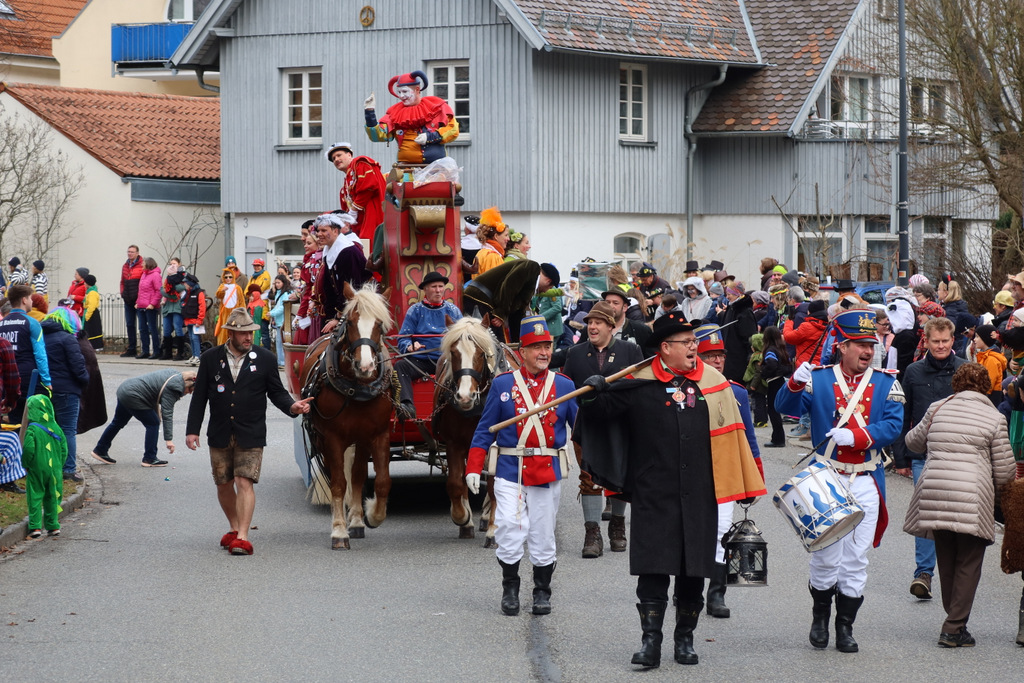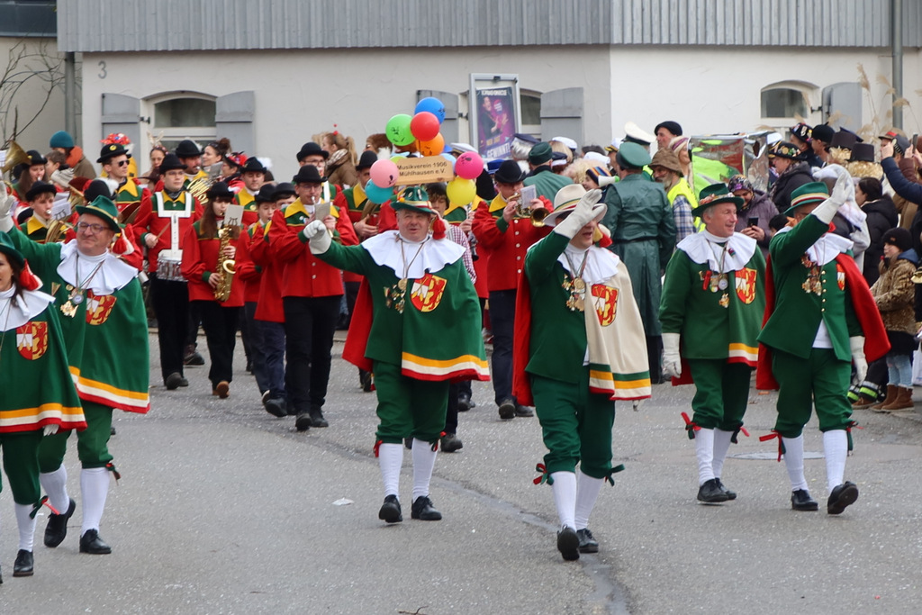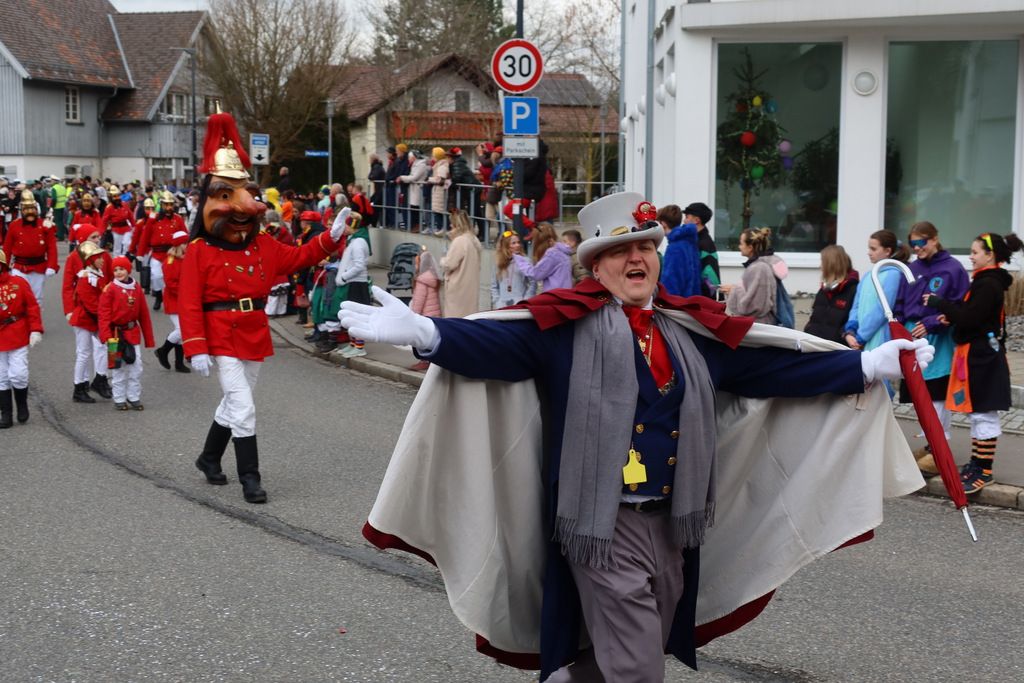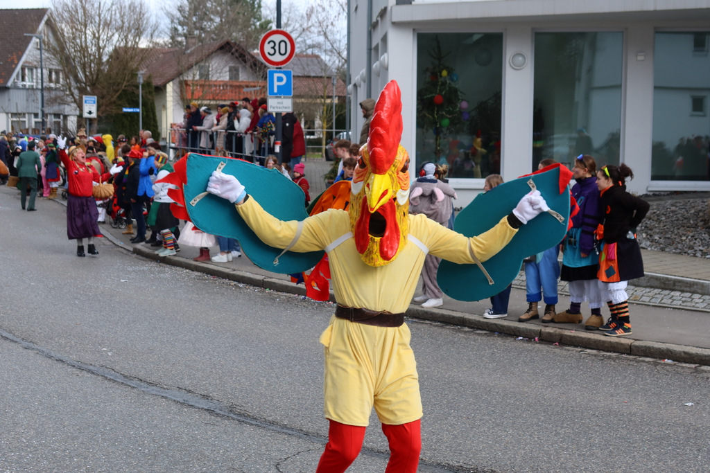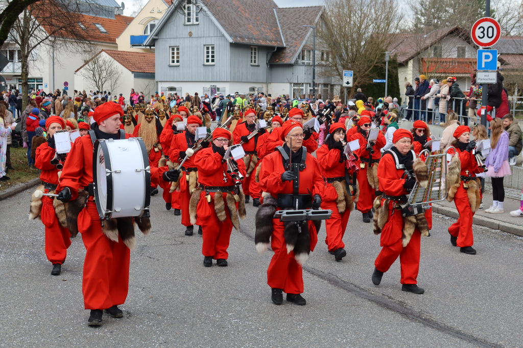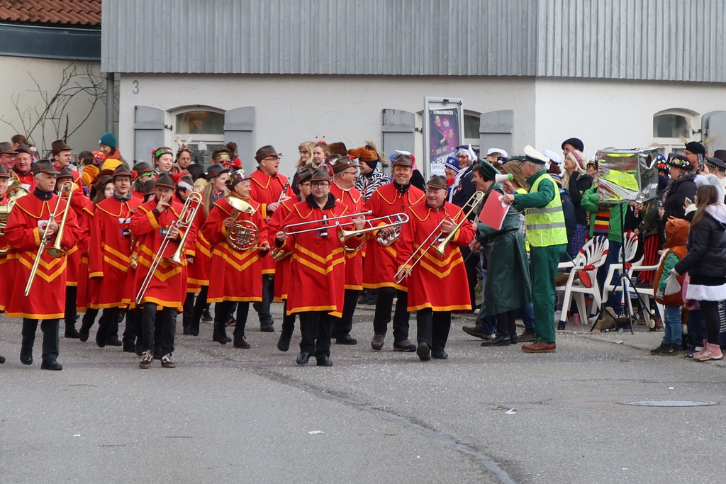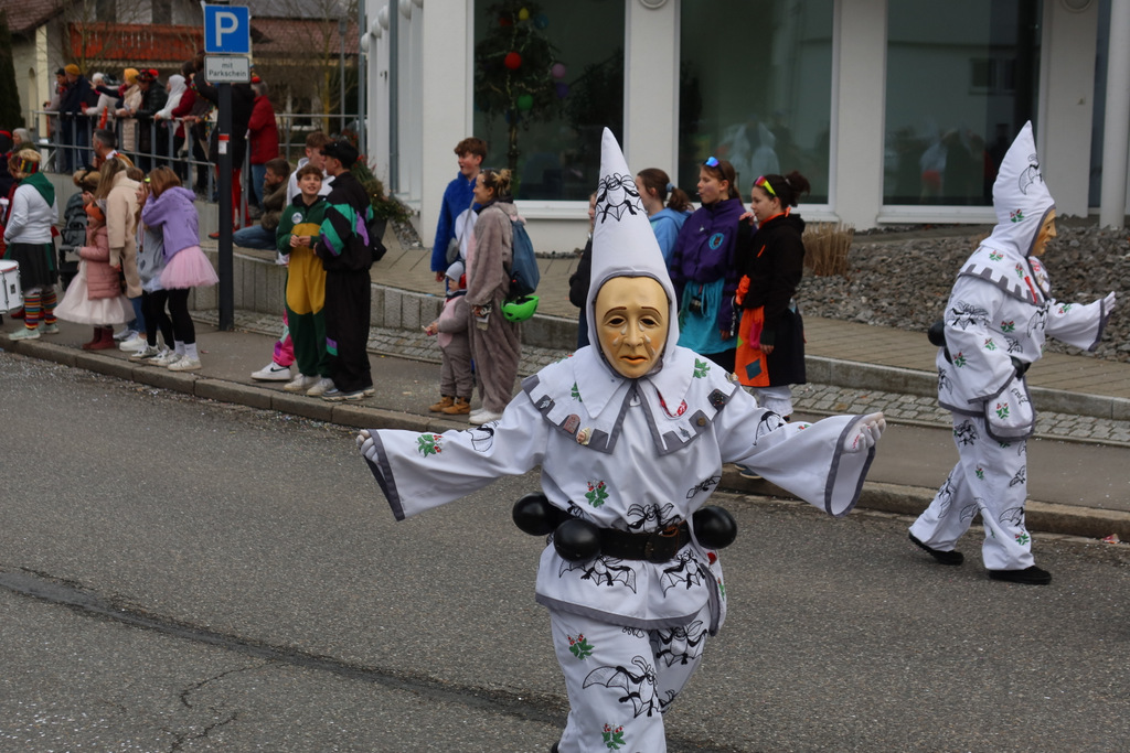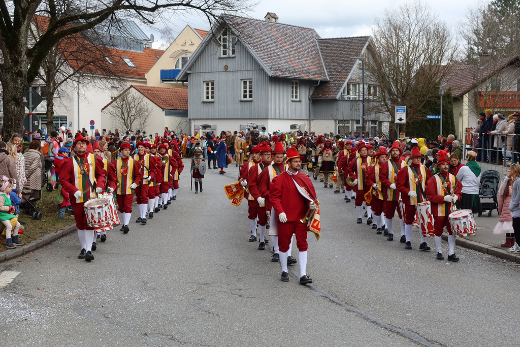 Auffallend viele Maskenträgerinnen und Maskenträger der hiesigen wie auch der befreundeten Zünfte beteiligten sich am Umzug. Auch erfreulich viele närrische Gruppierungen aus der Stadt glänzten nicht nur durch die Buntheit der Kostüme, sondern durch ihr närrisches Tun mit viel Bewegungsfreude und kräftigen AHA-Rufen. Allseits erkennbar war die freundliche, frohmachende Zuwendung zu all den Menschen, ob groß oder klein, an derUmzugsstrecke.