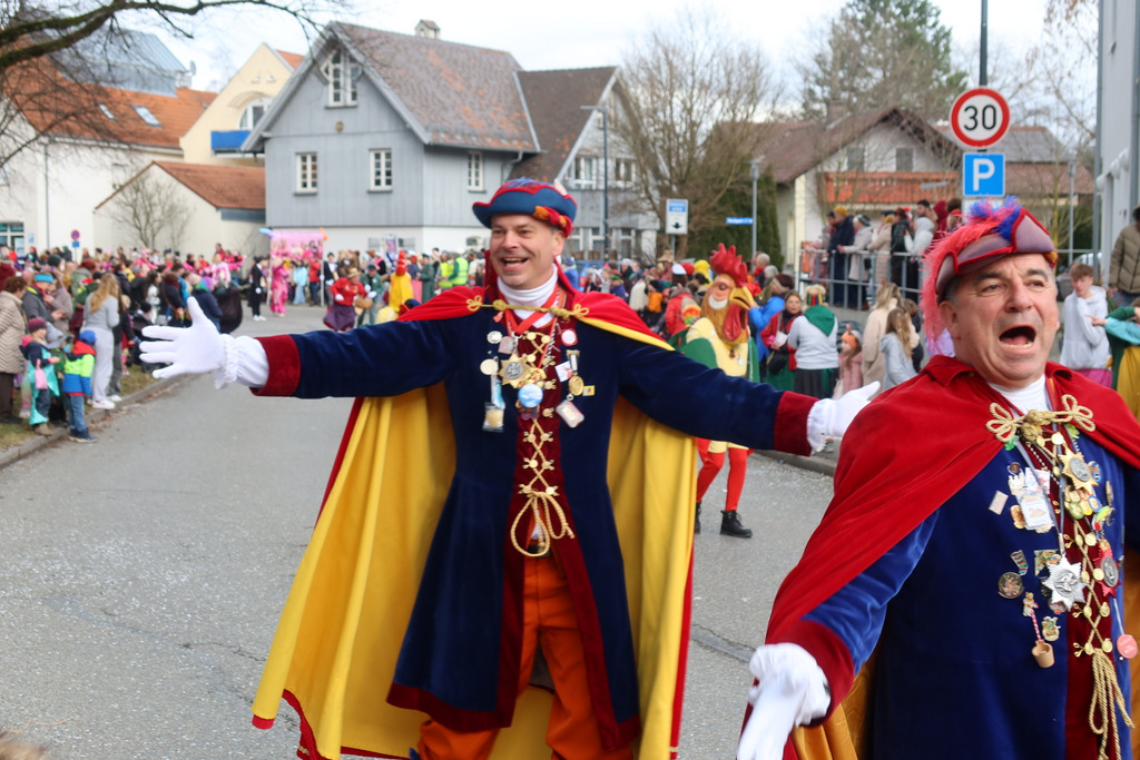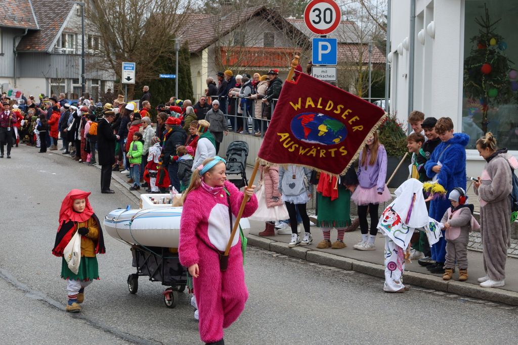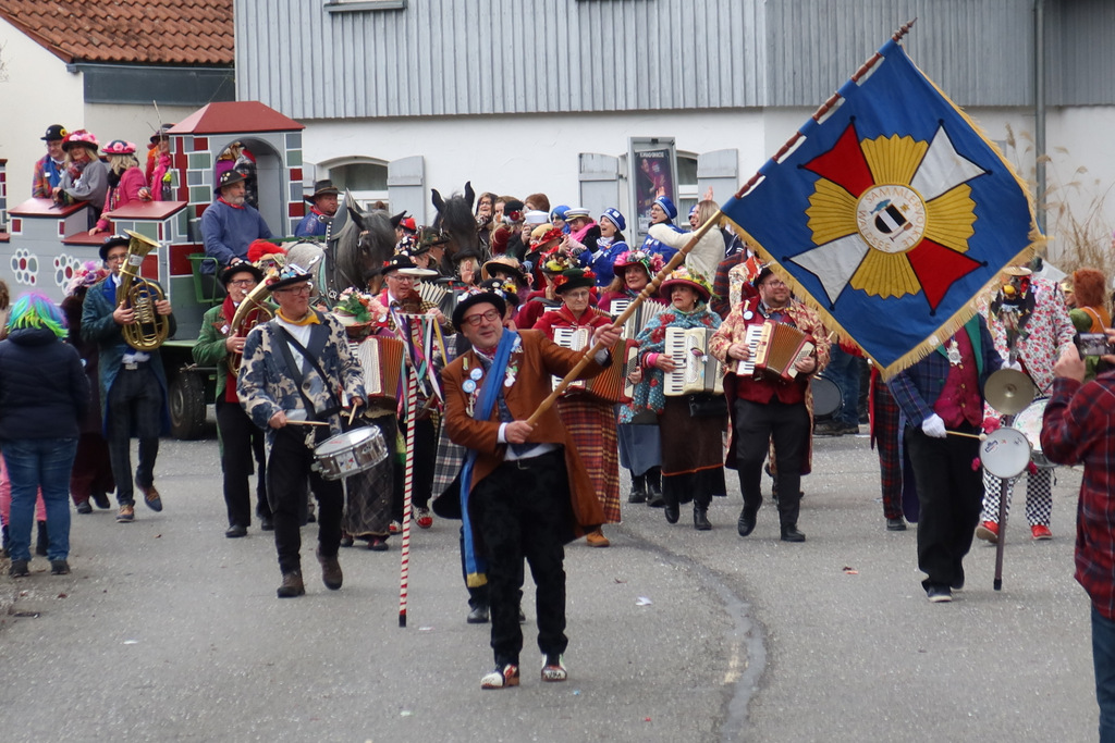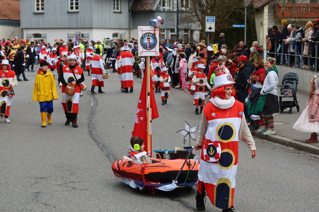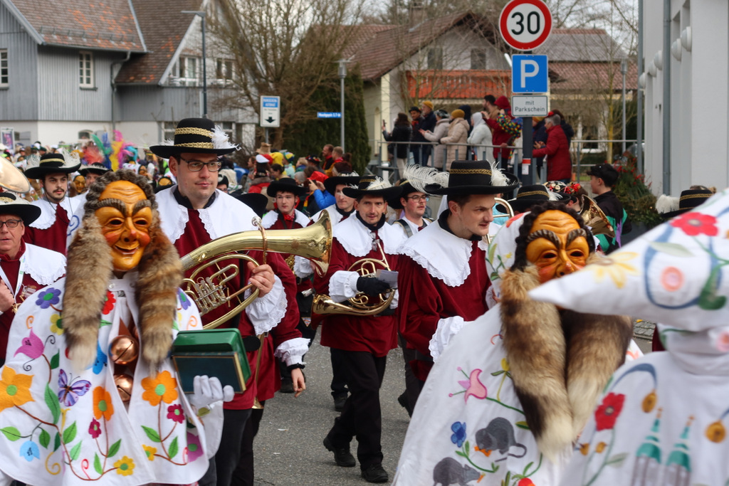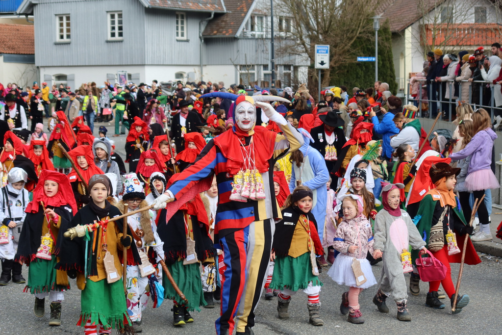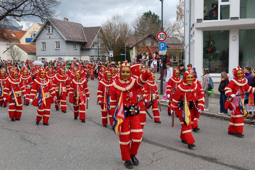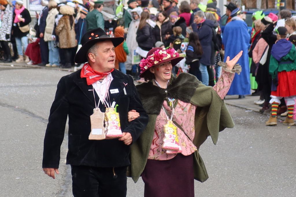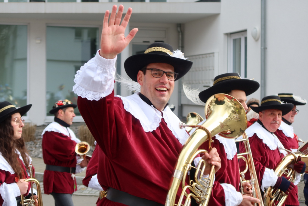 Auffallend viele Maskenträgerinnen und Maskenträger der hiesigen wie auch der befreundeten Zünfte beteiligten sich am Umzug. Auch erfreulich viele närrische Gruppierungen aus der Stadt glänzten nicht nur durch die Buntheit der Kostüme, sondern durch ihr närrisches Tun mit viel Bewegungsfreude und kräftigen AHA-Rufen. Allseits erkennbar war die freundliche, frohmachende Zuwendung zu all den Menschen, ob groß oder klein, an derUmzugsstrecke.