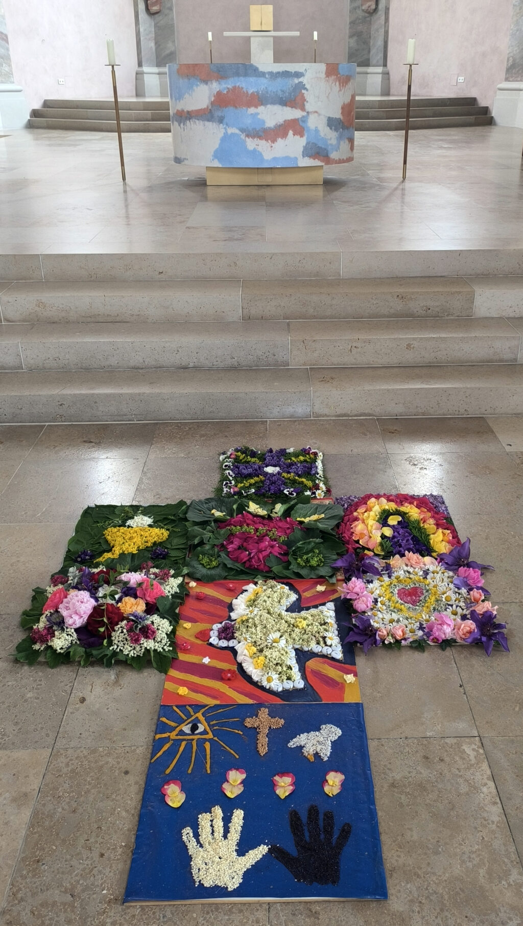 Vor dem Chorraum schmückten wieder zahlreiche kleine Blumenteppiche, liebevoll gestaltet von Gemeindemitgliedern, unsere Kirche und fügten sich gemeinsam zu einem schönen Gesamtbild. Das vorwiegende Thema der Tafeln waren Symbole des Friedens und Zeichen der Gemeinschaft in der Welt. Dabei zeigt die farbige Vielfalt der Blüten, wie bunt und friedvoll unsere Welt sein könnte.