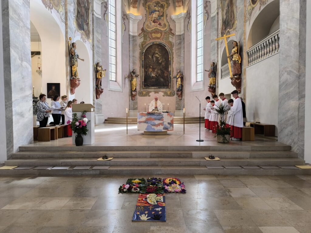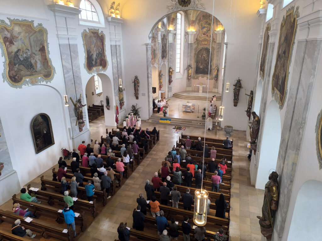 Die ausgefallene Prozession wurde ersetzt durch eine an den Hauptgottesdienst anschließende Segensfeier. Diese wurde gestaltet von Marion Bucher und Franziska Tessling vom Kirchengemeinderat als Zeichen für den Frieden. Zur mahnenden Erinnerung an den Krieg in der Ukraine wurde eine blau-gelbe Flagge mit einer Friedenstaube ausgebreitet.