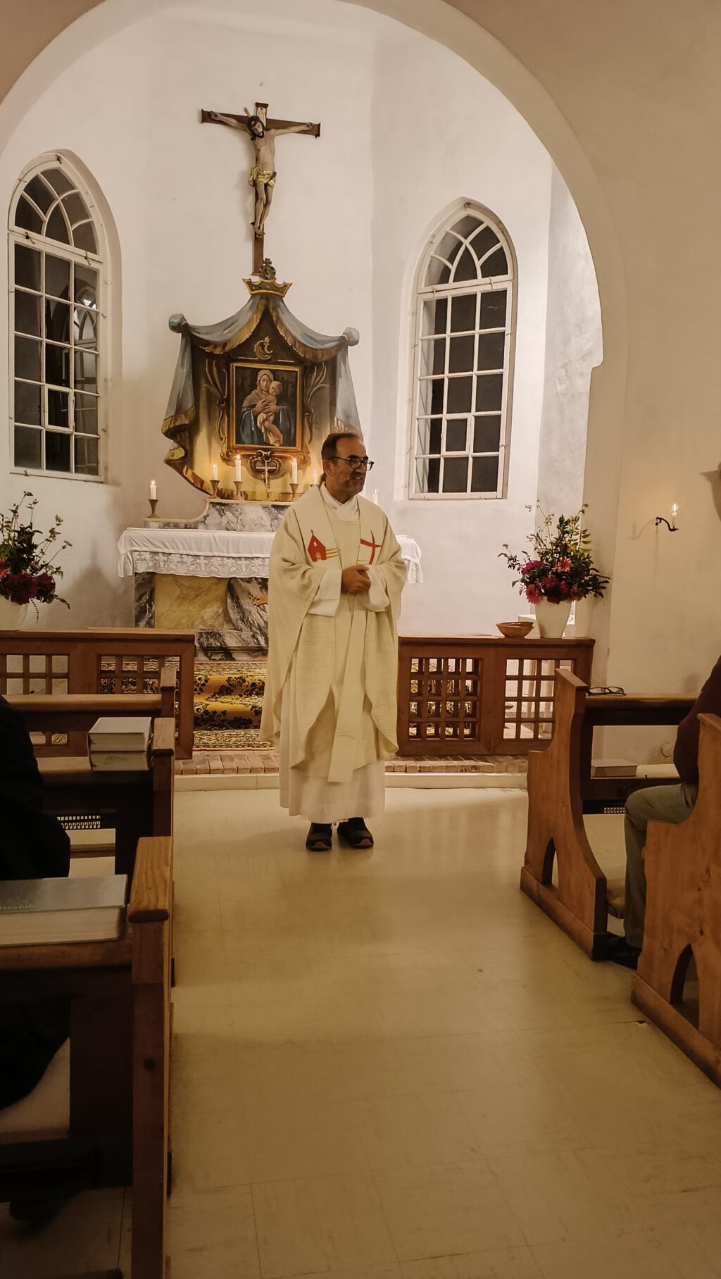 Die Predigt von Pfarrer Stefan Werner stand noch ganz im Zeichen der Portugal-Wallfahrt vor einer Woche. 26 Gläubige gingen hier etwa 200 Kilometer den Jakobusweg nach Santiago de Compostela. Mit bei den Wallfahrern waren auch Andrea und Norbert Burkhardt aus Weißenau. „Pilgern heißt loslassen“, Hören, Dienen, Durchhalten und Vertrauen – diese Eigenschaften können dem Leben der Gottesmutter Maria entnommen werden. Mit dem Rosenkranzgebet „Jesus, der mit uns unterwegs ist“, wurde der festliche Gottesdienst beendet.