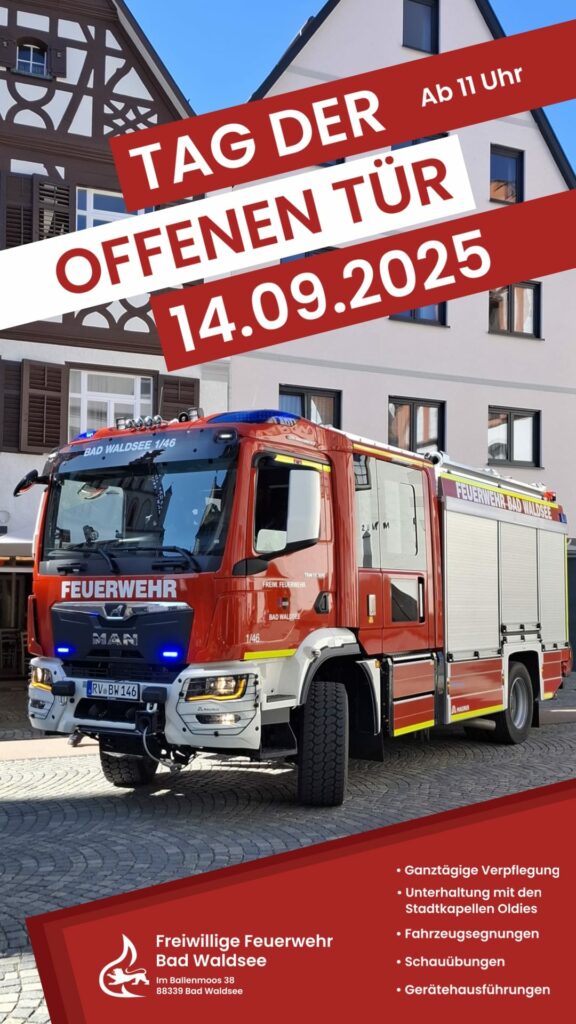 Bad Waldsee (dbsz) – Die Freiwillige Feuerwehr Bad Waldsee veranstaltet am 14. September einen Tag der offenen Tür im und am Feuerwehrhaus im Ballenmoos. Das Feuerwehrfest beginnt um 11.00 Uhr. Ein Höhepunkt ist die Segnung neuer Fahrzeuge. Es gibt Schauübungen und Gerätehausführungen. Natürlich wird ganztägig Verpflegung angeboten. Für die musikalische Unterhaltung sorgen die Stadtkapellen-Oldies. Mehr Infos zu gegebener Zeit.