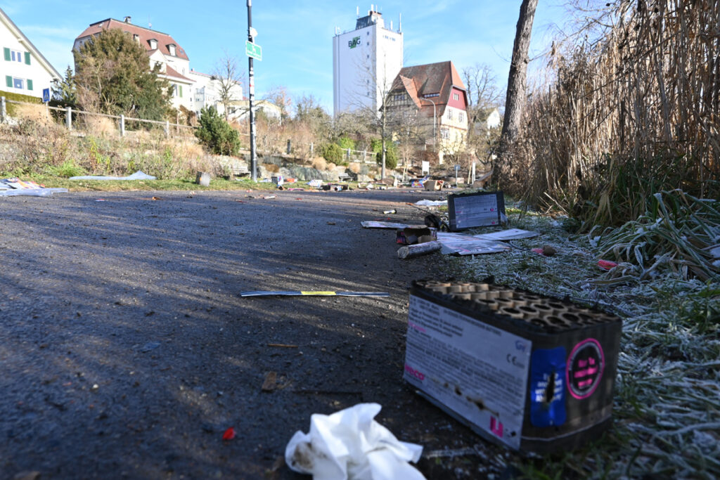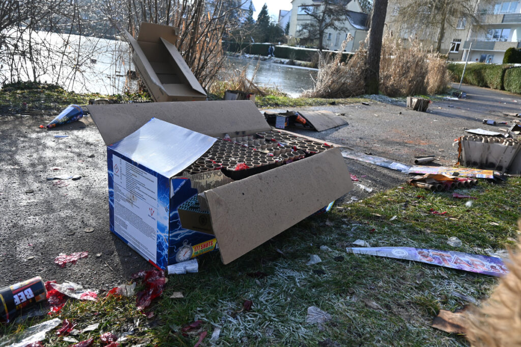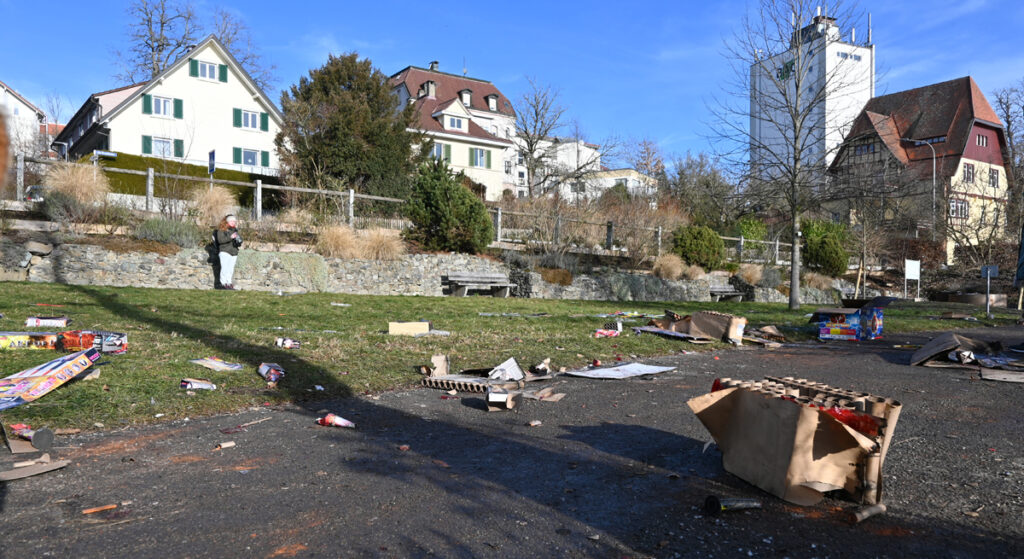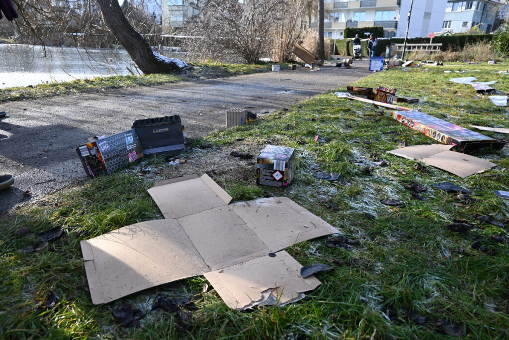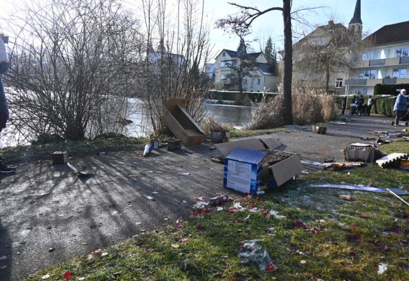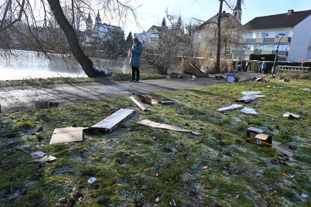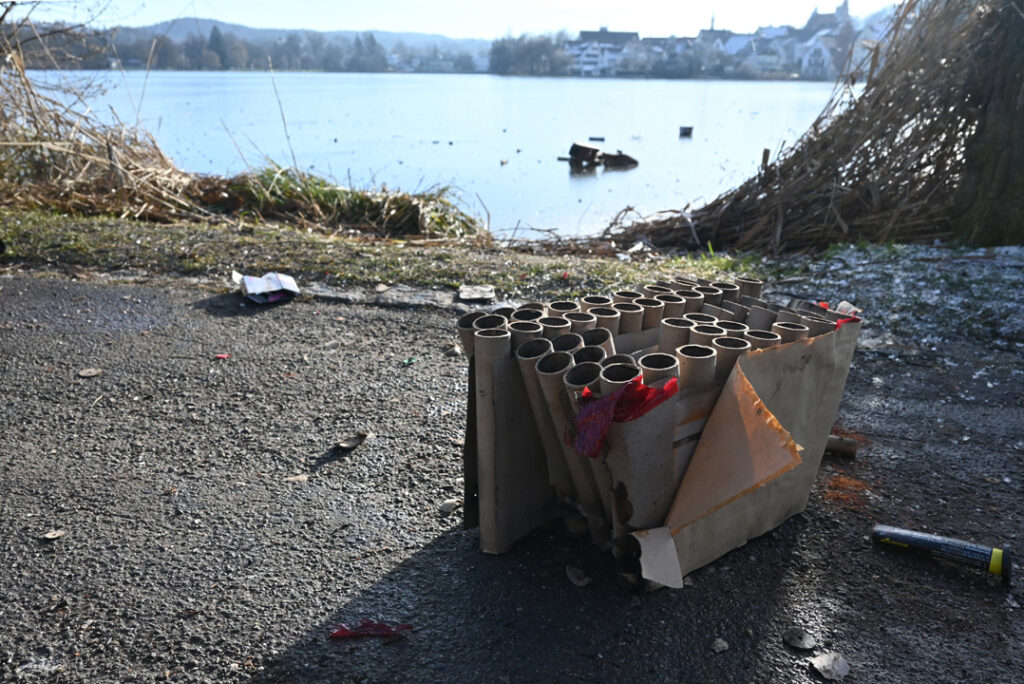 „Das ist doch eine Riesensauerei.“ „Sowas habe ich noch nie gesehen.“ „Am Haus am Stadtsee an auf der anderen Uferseite sieht’s genau gleich aus.“ Kopfschüttelnd gehen die Spaziergänger am Neujahrsmorgen an den Hinterlassenschaften des nächtlichen Silvesterfeuerwerks vorbei.