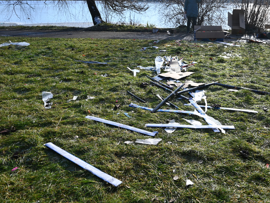 Bad Waldsee – Nein, das ist kein Silvesterspaß: Feuerwerker haben am Uferweg eine Riesensauerei hinterlassen. Der ganze Weg und die dazugehörige Grünanlage mit leeren Kartons und Plastikabfällen der Feuerwerksverpackungen übersät. Und weil das noch nicht ausreicht, leere Kartons auch auf dem Eis des Stadtsees.