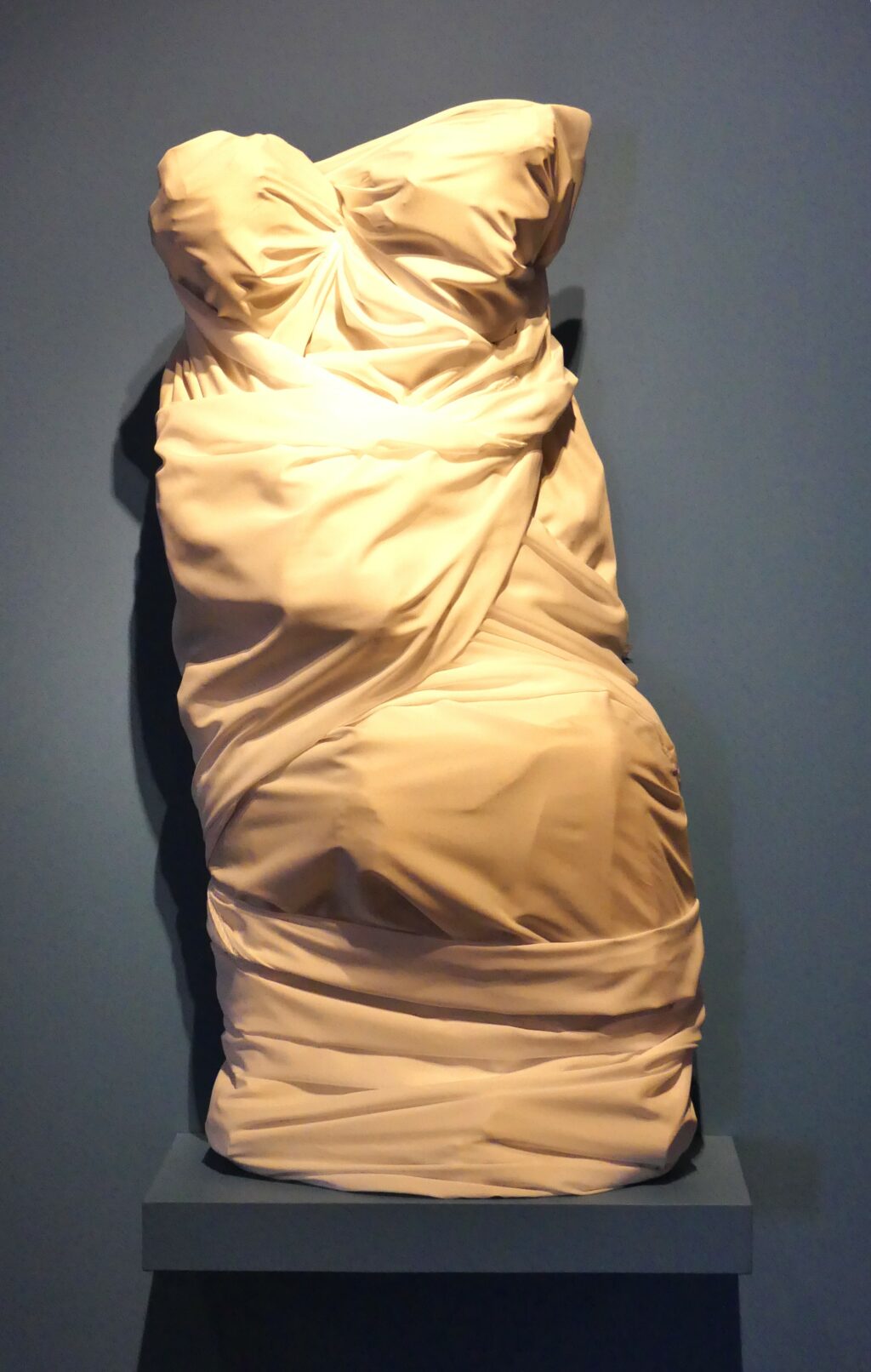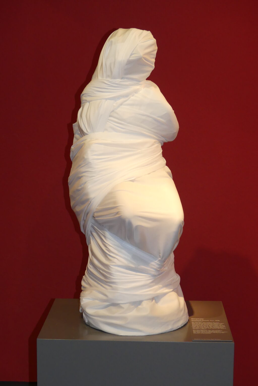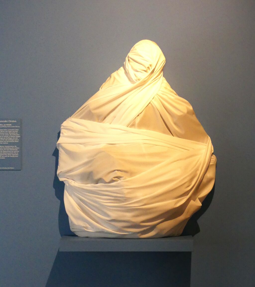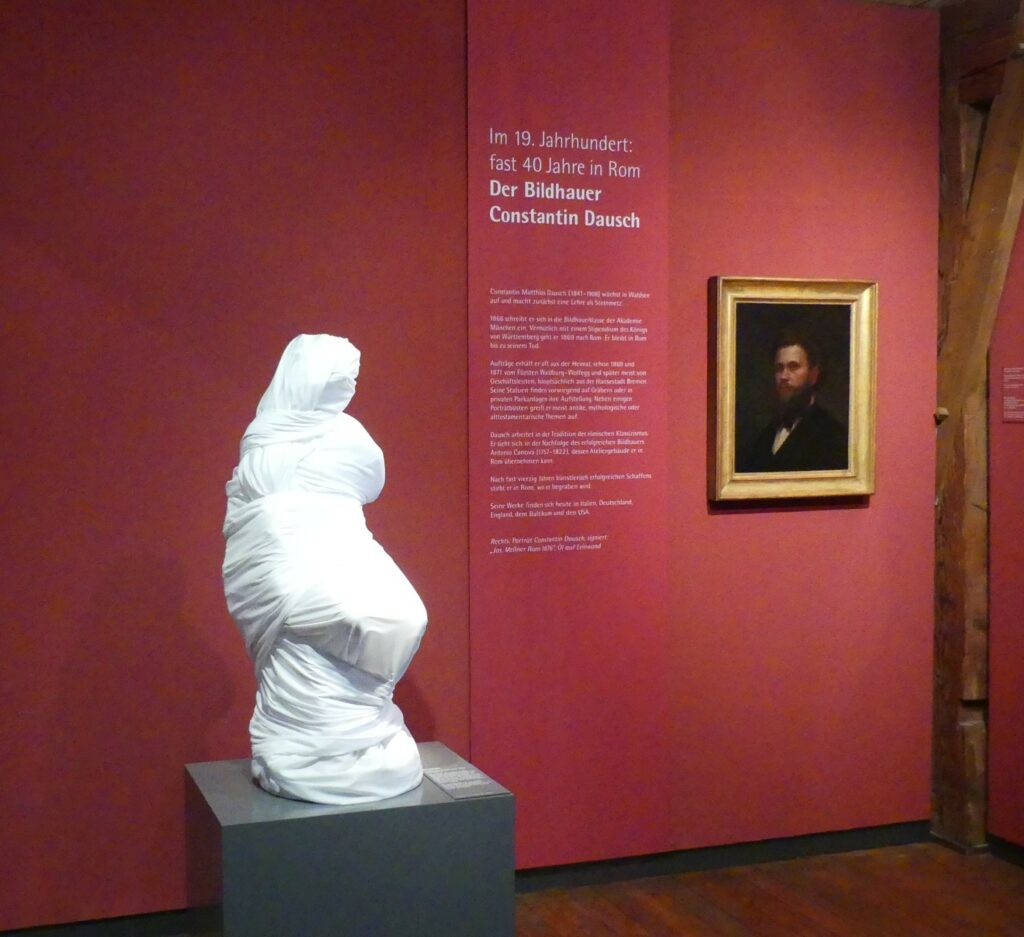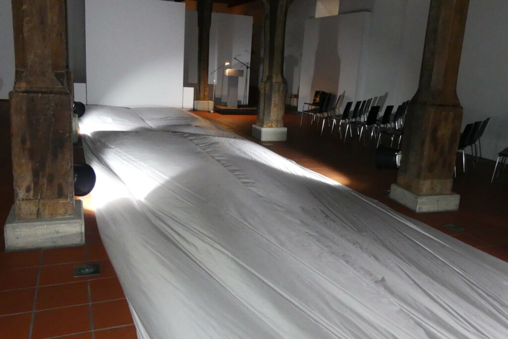 Der Installationskünstler Johannes Pfeiffer wird anwesend sein und gern Fragen zu seiner jetzigen Installation und allgemein zu seinen Arbeiten beantworten. Wer die Ausstellung noch nicht gesehen hat, sollte sich daher sputen. Besichtig werden können der „atmende“ Schlauch in der Pfeilerhalle, die sog. Blindzeichnungen im 1. OG und die verhüllten vier Skulpturen des 17. (holzsichtige Figuren der Bildhauer Zürn) und 19. Jahrhunderts (die Marmorskulptur der lydischen Königin Omphale von Constantin Dausch), die unsere Sehgewohnheiten auf eine Probe stellen. Zudem läuft ein kurzes interessantes Video in Dauerschleife über frühere Projekte des Künstlers.