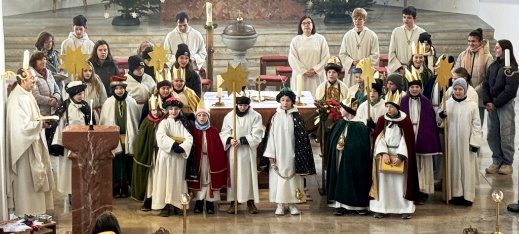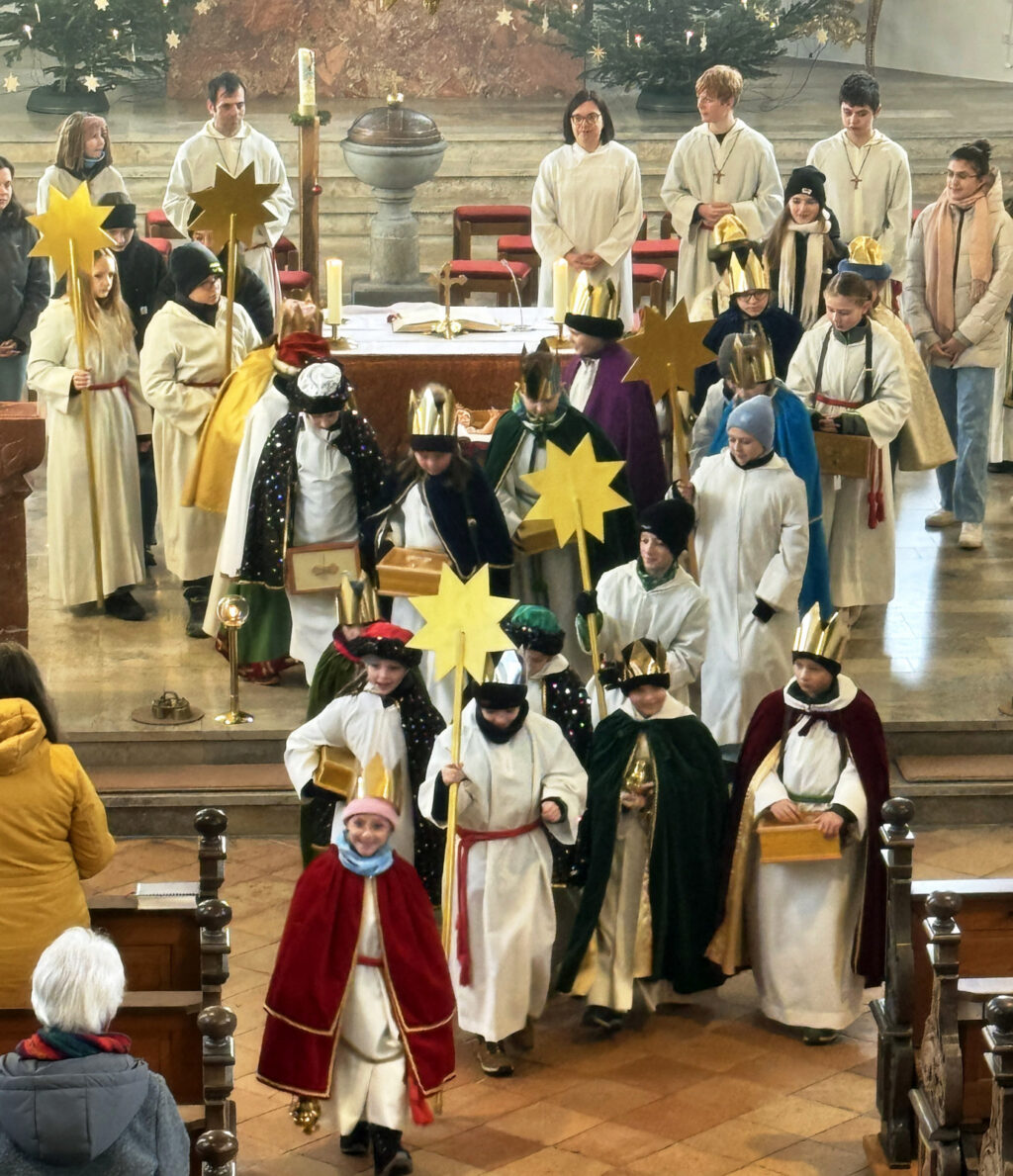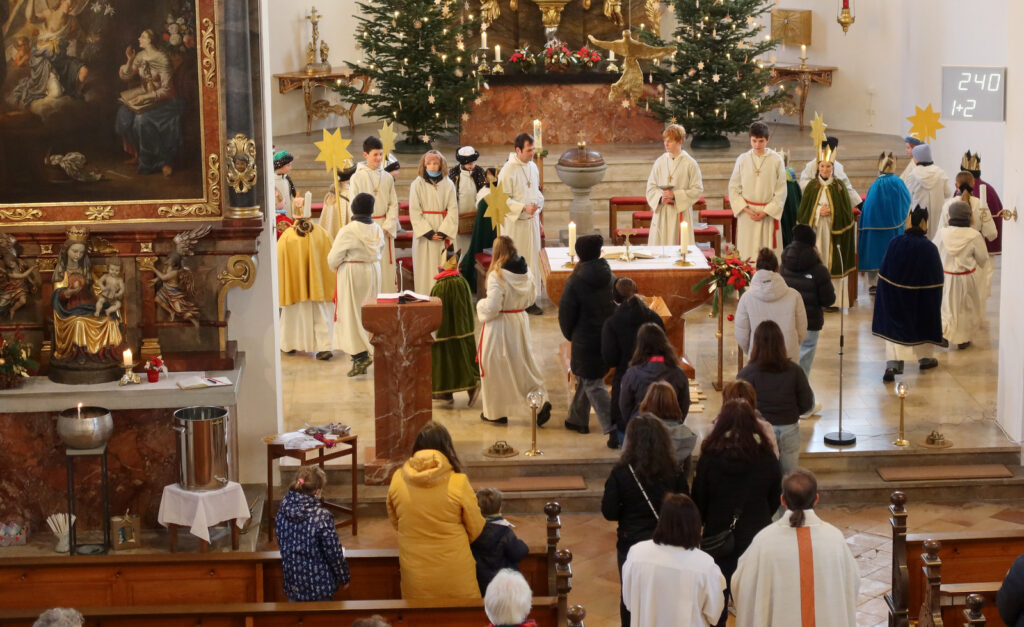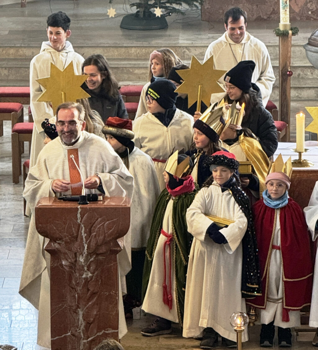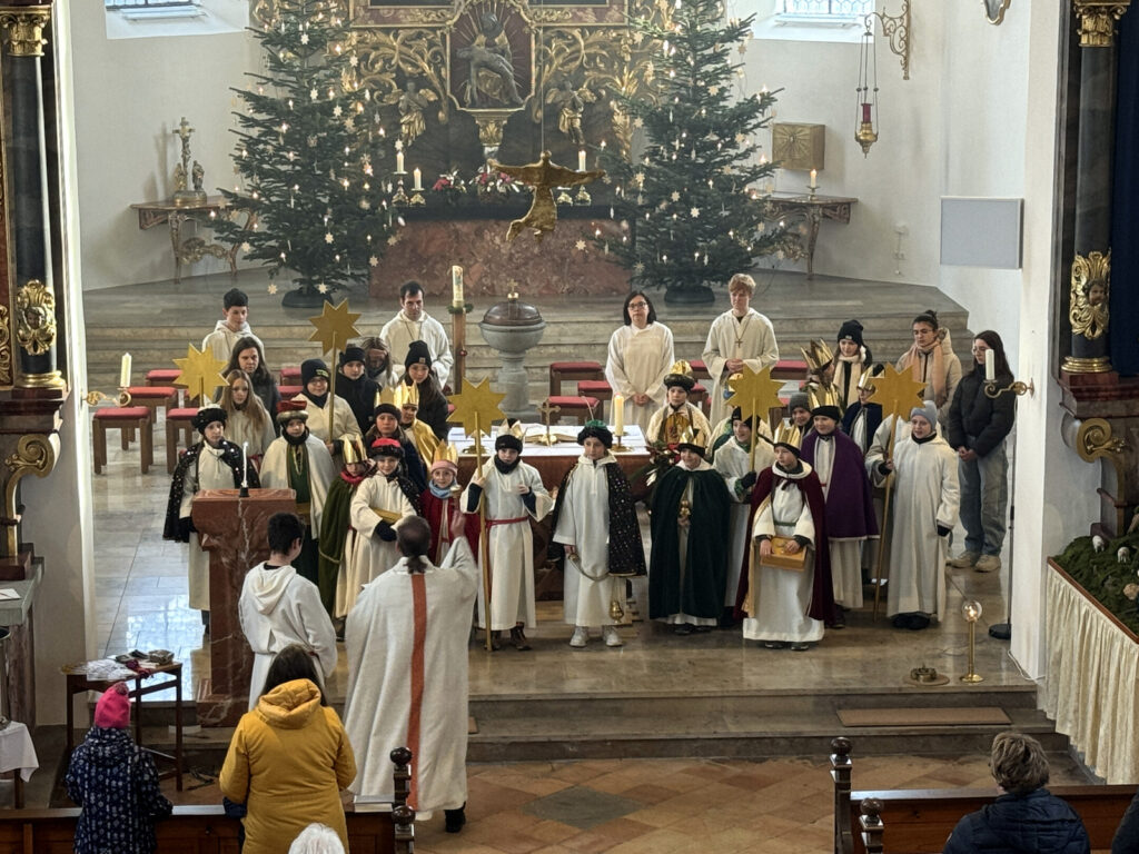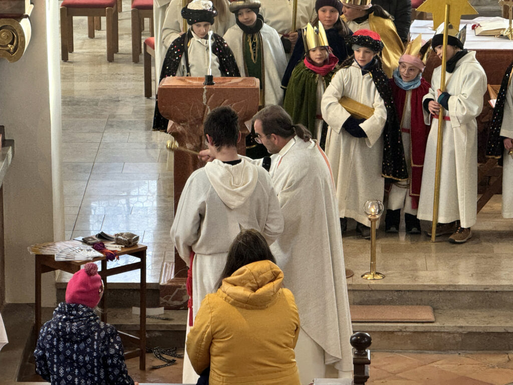 Die hiesigen 20 Sternsinger mit Begleitern wurden ermutigt, sich gemeinsam mit Gleichaltrigen aller Kontinente als Botschafter für Kinderrechte zu engagieren. Sternsinger trugen dazu auch Fürbitten vor. Zelebrant dieses festlichen Gottesdienstes war Pfarrer Stefan Werner. Für die feierliche Umrahmung mit Orgelklängen sorgte Leo Straßner, der auch den Gemeindegesang belebend unterstützte. Pfarrer Stefan Werner erbat dann den Segen Gottes für die Sternsinger, die Menschen im Gottesdienst und in all den Häusern, die am Dreikönigstag aufgesucht werden. Gesegnet wurden auch Kreide, Weihrauch, die Aufkleber für die Haustüren und auch das Dreikönigswasser. Pfarrer Stefan Werner bedankte sich besonders bei den Müttern und Organisatorinnen, die diese wertvolle Aktion hier ermöglichten.