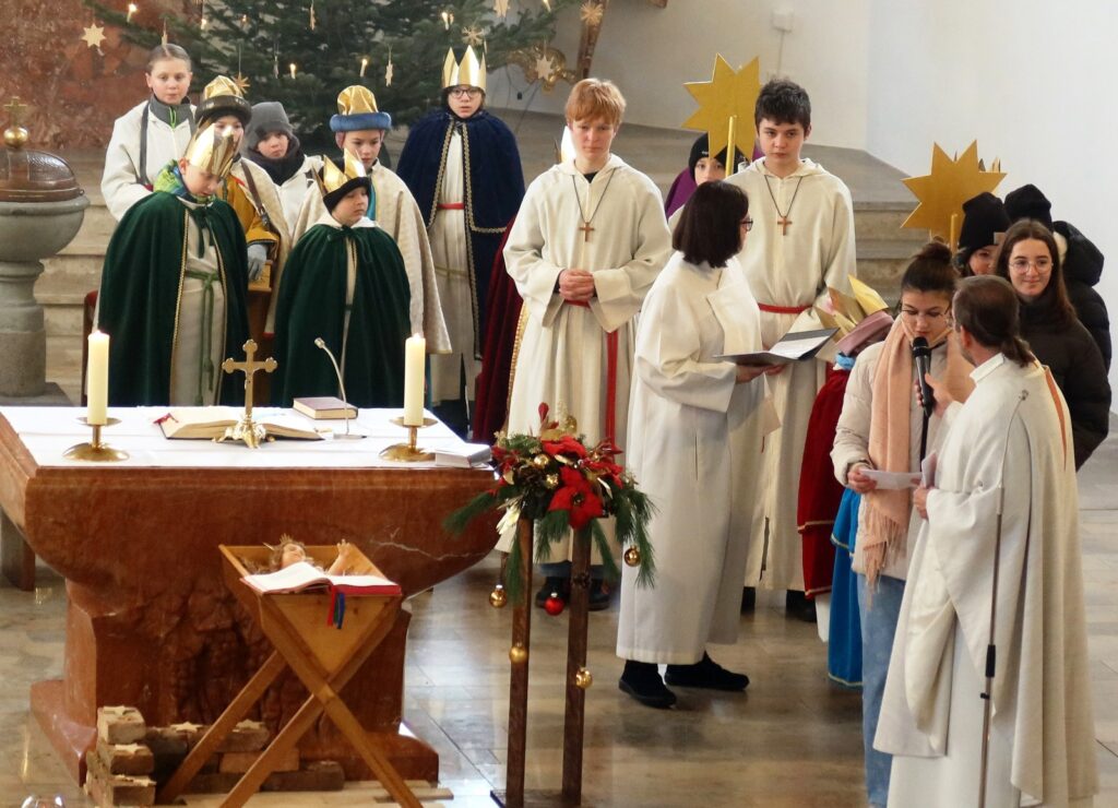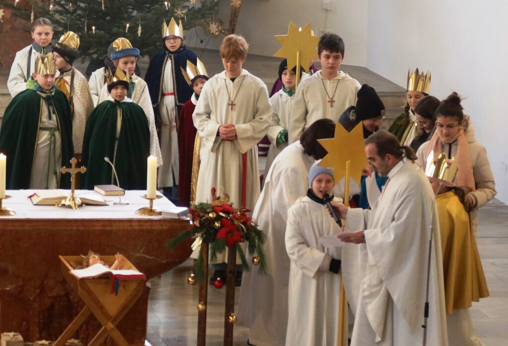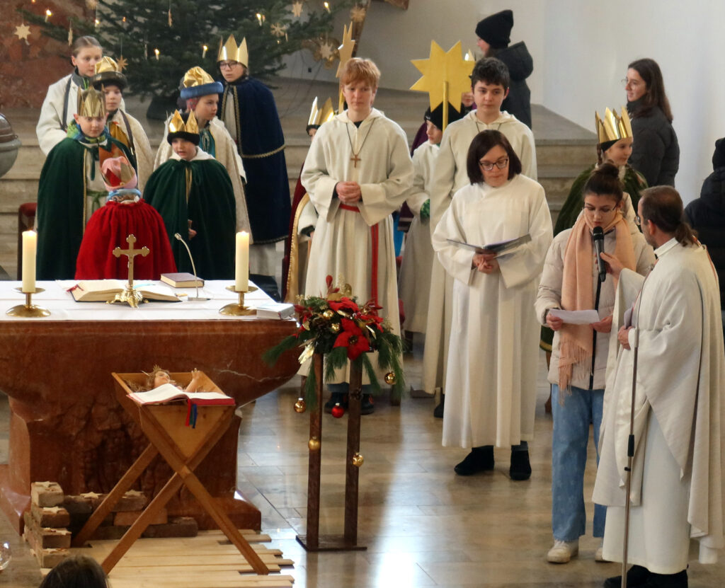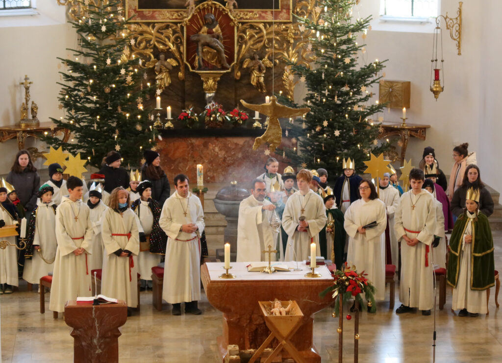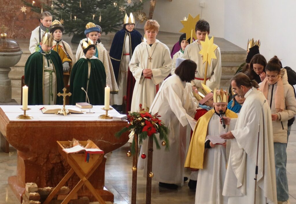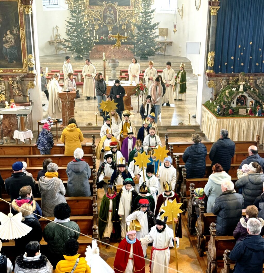 Die hiesigen 20 Sternsinger mit Begleitern wurden ermutigt, sich gemeinsam mit Gleichaltrigen aller Kontinente als Botschafter für Kinderrechte zu engagieren. Sternsinger trugen dazu auch Fürbitten vor. Zelebrant dieses festlichen Gottesdienstes war Pfarrer Stefan Werner. Für die feierliche Umrahmung mit Orgelklängen sorgte Leo Straßner, der auch den Gemeindegesang belebend unterstützte. Pfarrer Stefan Werner erbat dann den Segen Gottes für die Sternsinger, die Menschen im Gottesdienst und in all den Häusern, die am Dreikönigstag aufgesucht werden. Gesegnet wurden auch Kreide, Weihrauch, die Aufkleber für die Haustüren und auch das Dreikönigswasser. Pfarrer Stefan Werner bedankte sich besonders bei den Müttern und Organisatorinnen, die diese wertvolle Aktion hier ermöglichten.