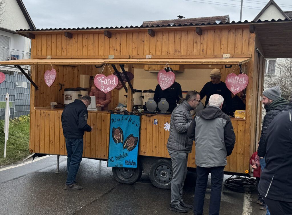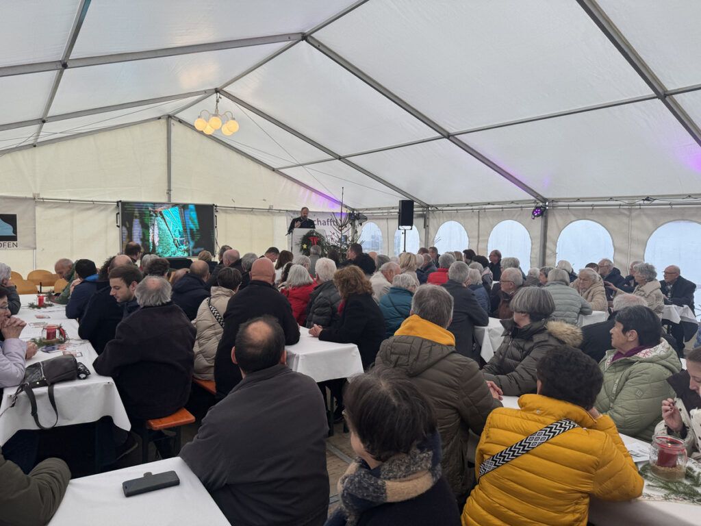 Nach dem Gottesdienst wurde das Festgeschehen im benachbarten Zelt fortgesetzt. Zum Auftakt wurde durch Böllerschützen aus Altshausen die Freude über die Wiedereröffnung unterstrichen und der offizielle Festakt eröffnet. Um die Mittagszeit war das Festzelt voll belegt. Platz gefunden hatten auf den aufgestellten Bänken 250 Personen. Manche mussten mit Stehplätzen vorlieb nehmen. Die Ansage hatte Ortsvorsteher Matthias Covic übernommen.