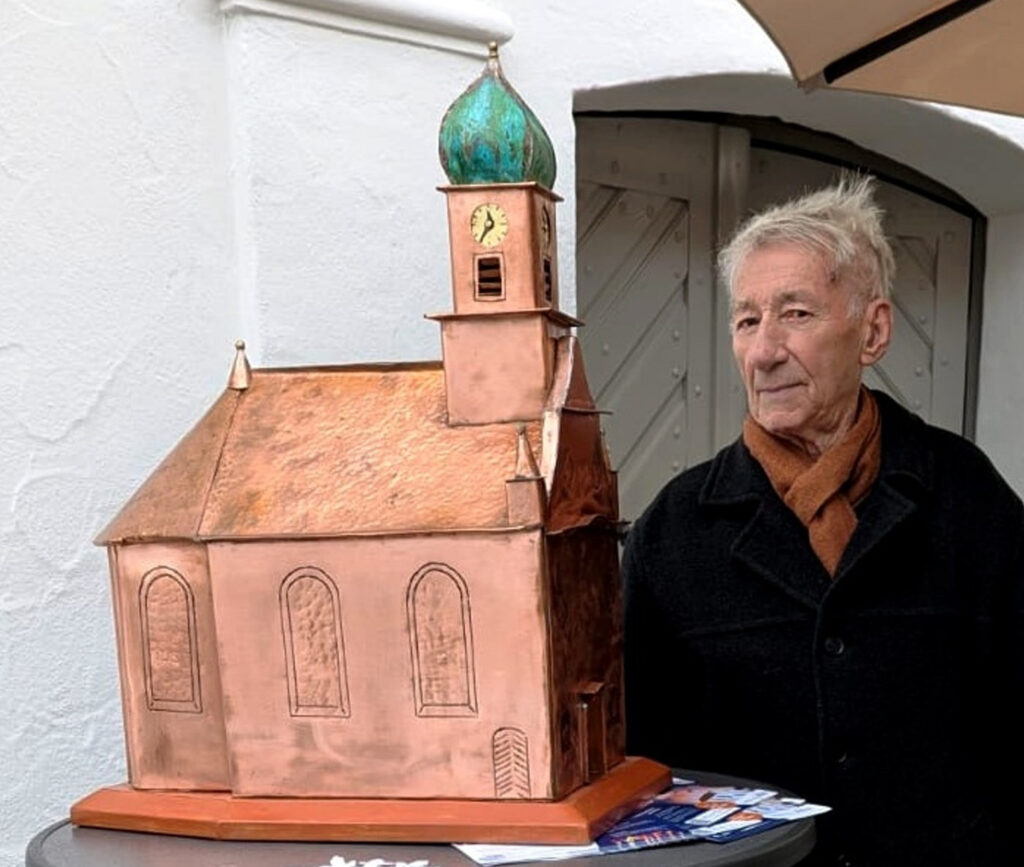 Hermann Kemmler mit seiner kupferner Nachbildung der Osterhofer Kapelle. Foto: Rosa Eisele