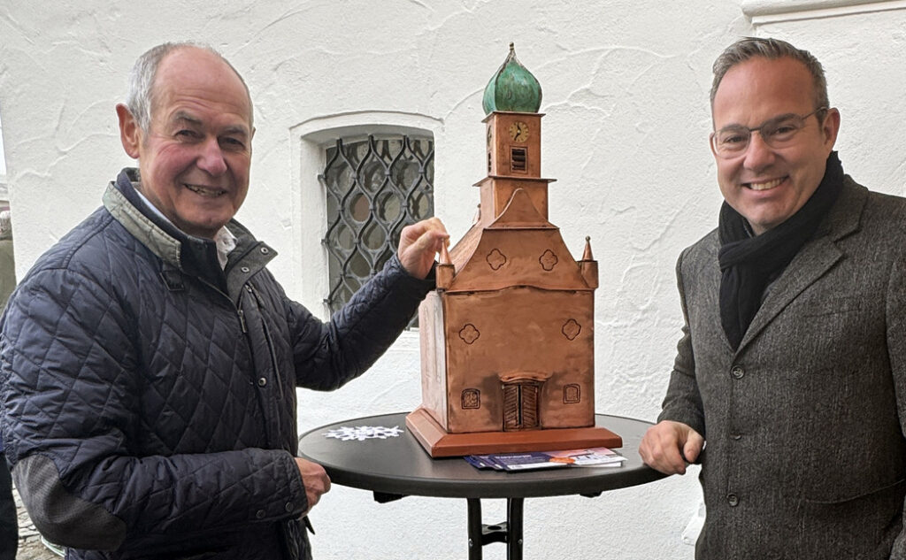 Rudolf Köberle, ehemaliger Landesminister, und Raimund Haser, aktueller Landtagsabgeordneter, vor dem kupfernen Modell der Osterhofer Kapelle.