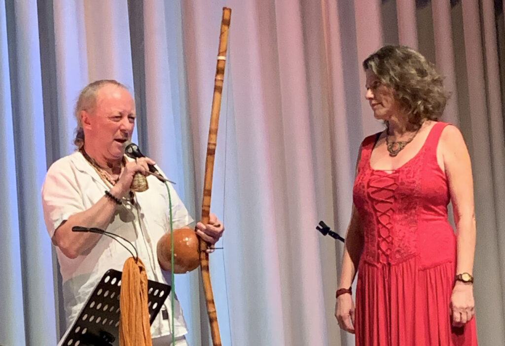 „Upside down“ erzählte von Höhen und Tiefen des Lebens, an der Geige zupfend, das Hang senkrecht gehalten, während Rhythmus und Stimme Mühsale des Lebens deutlich zeichneten. Nicht überraschend, dass das Publikum danach auch Zugaben forderte. So wurde ein Titel des Brasilianers Nana Vasconcelos, einem der „besten Drummer aller Zeiten“, gespielt. Fricker spielte nun das brasilianische Instrument Berimbau, eine Art Musikbogen, dessen Sehne angeschlagen verblüffend schöne Töne und Rhythmen erzaubert. Zu gerne hätte man dieses Instrument viel länger gehört!