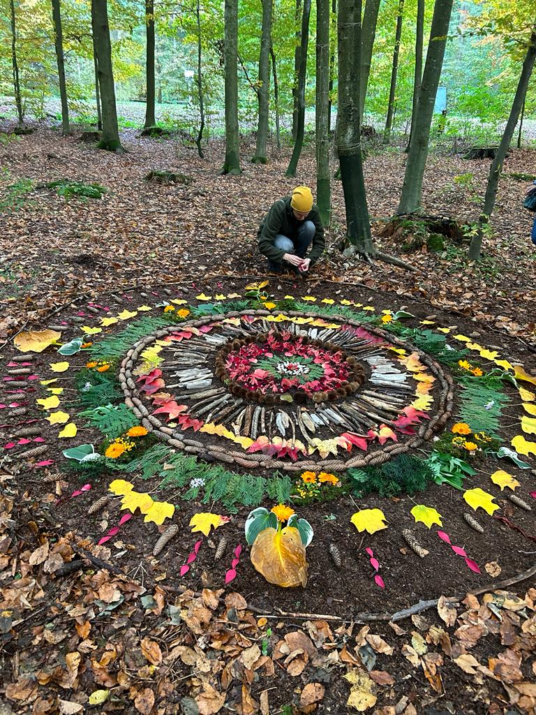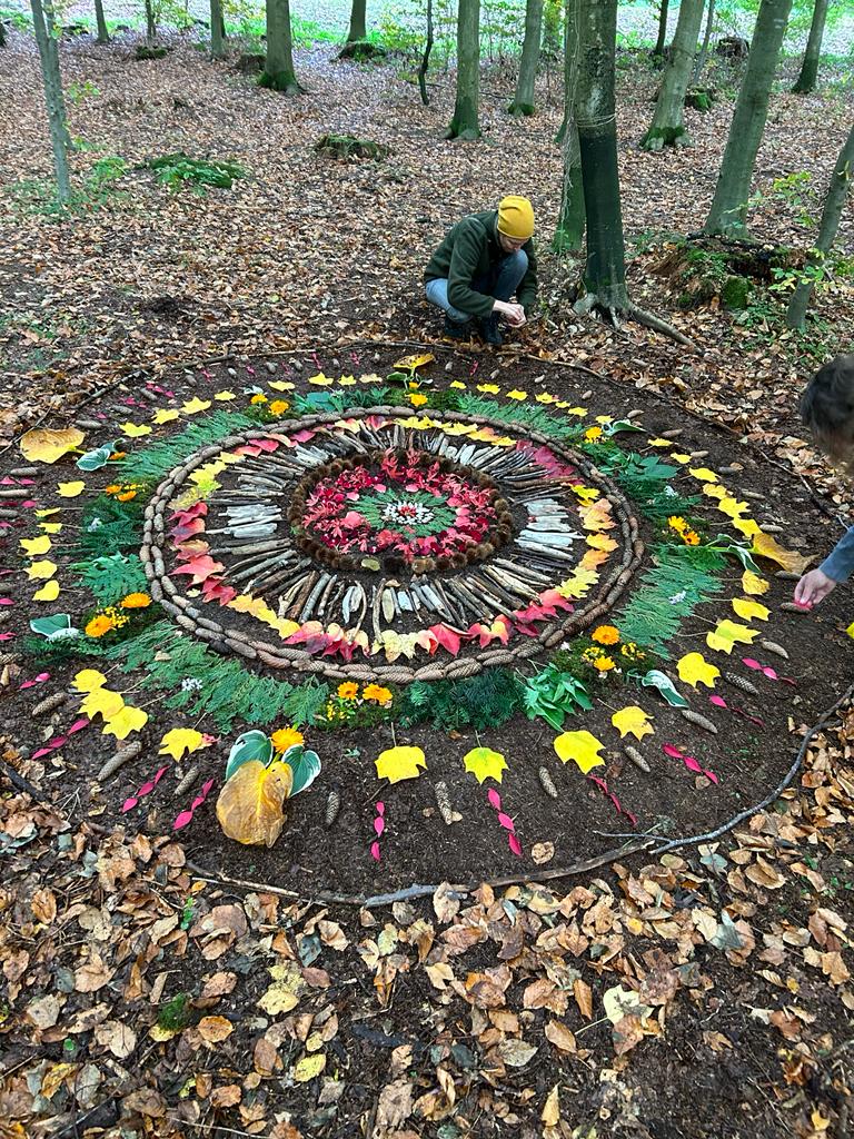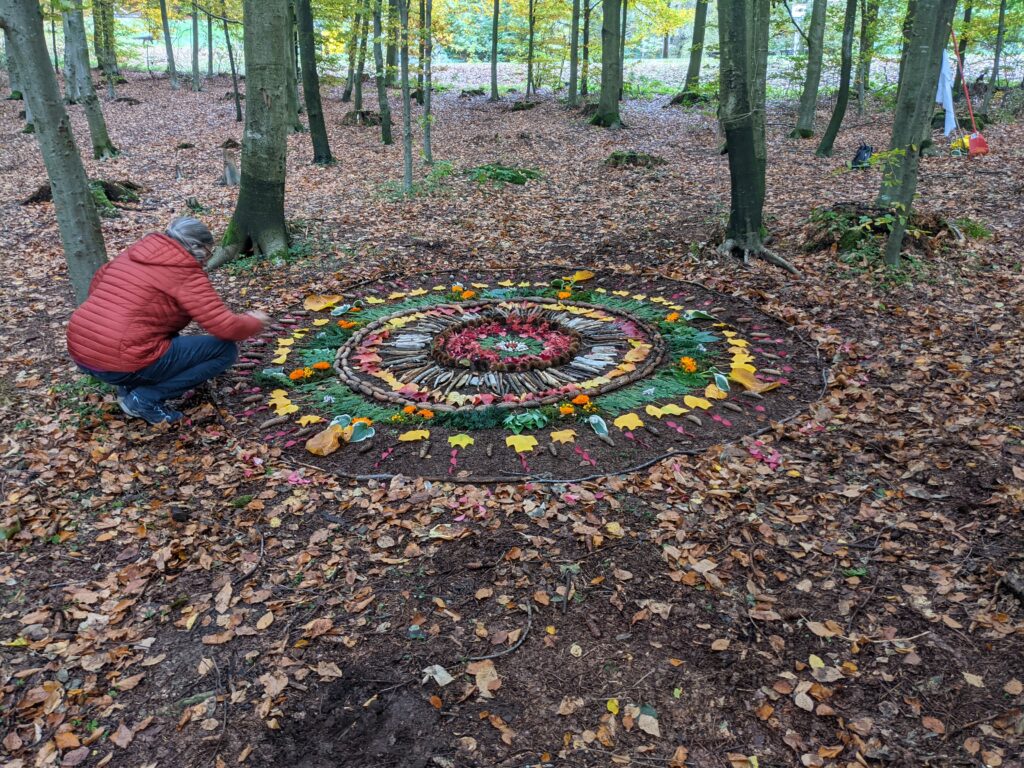 Bad Waldsee / Leutkirch – Die regionale Friedensgebetsgruppe hat sich am Feiertag Allerheiligen in Bad Waldsee getroffen. Im schönen lichten Tannenbühl wurde dazu ein Jahreskreis-Mandala aus natürlichen Materialen gelegt. Dabei spielten auch die Farben und alle Elemente eine Rolle.