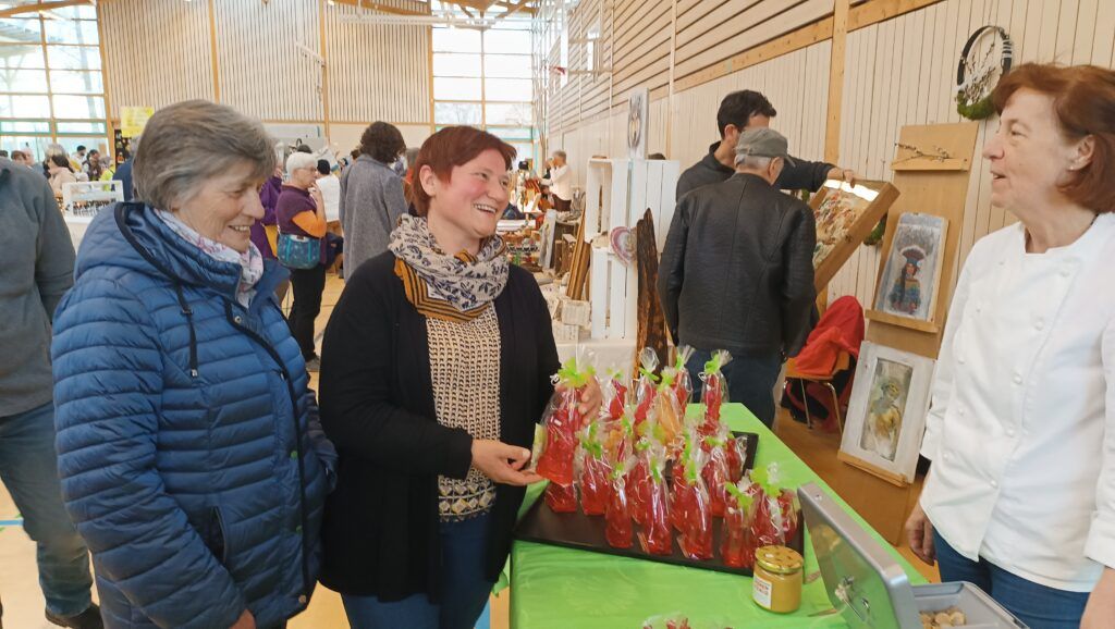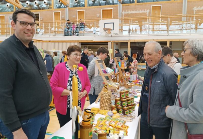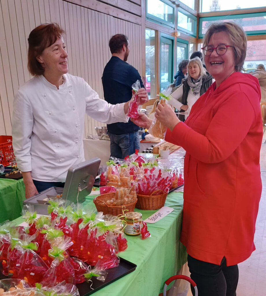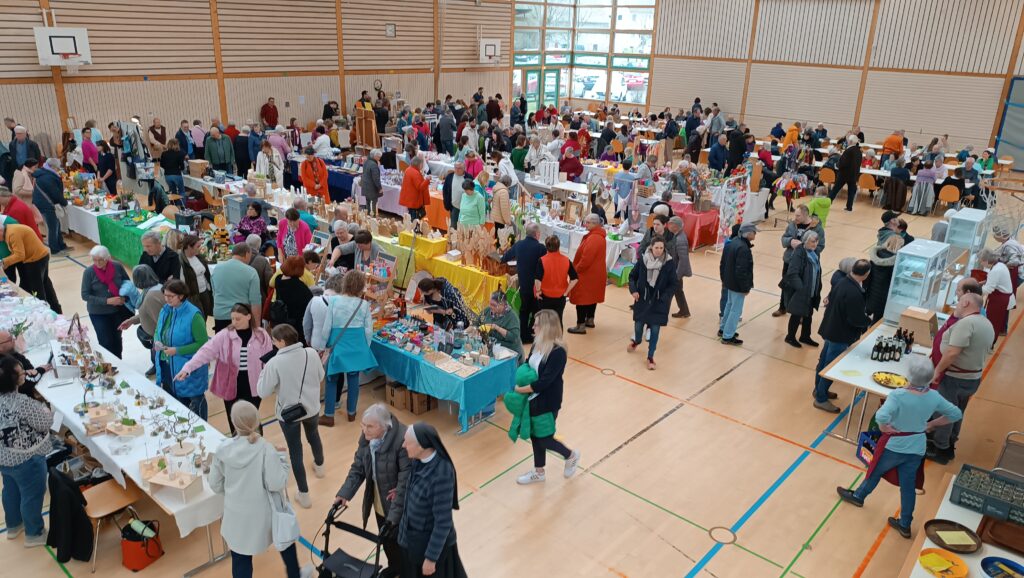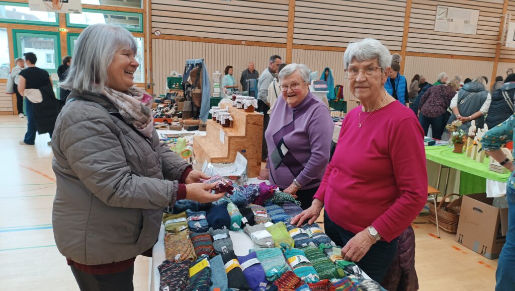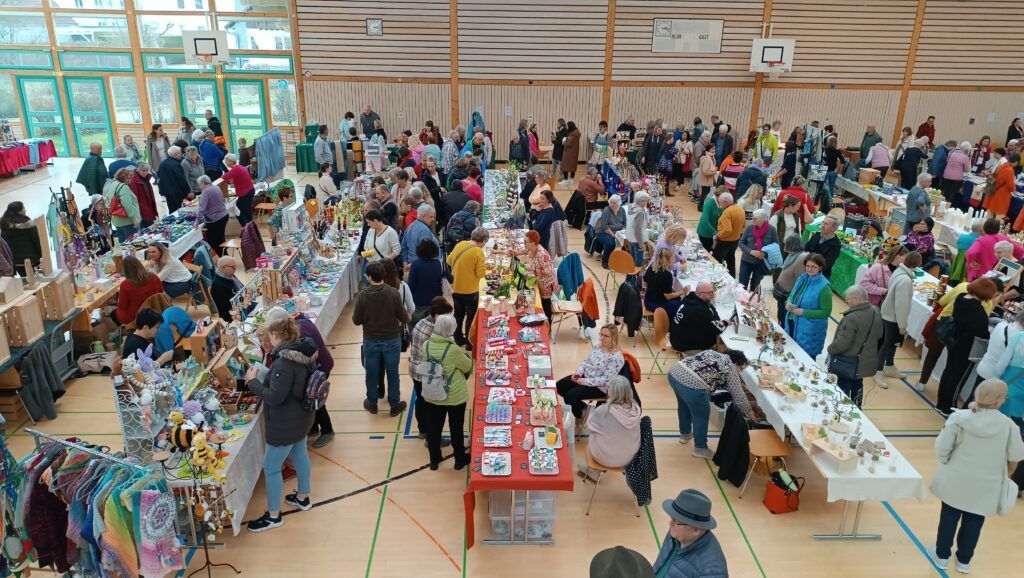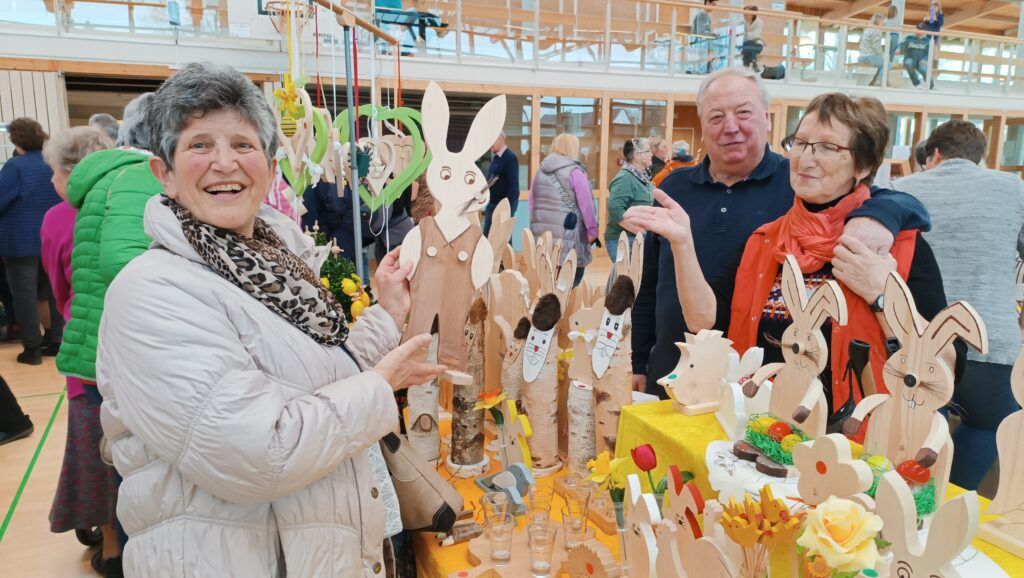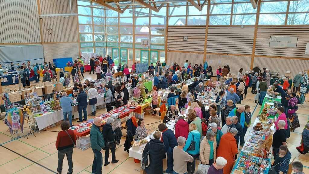 Etwa 40 Anbieter, überwiegend fleißige Bastler, Kunstwerker und Handarbeiterinnen aus der Region, präsentierten an 75 Tischen den interessierten Besuchern ihr buntgefächertes Angebot. Seit bereits 24 Jahren beschicken Roswitha Mayer und Edith Hörmann den hiesigen Ostermarkt. Jahr für Jahr ist der örtliche Strickkreis mit Elisabeth Fluhr, Anne Rose Zembrot und Brunhilde Linder beim Ostermarkt. Sie verkaufen neben leckerer Marmelade ihre warmen Handschuhe, Mützen und Socken. Sämtlicher Erlös fließt hier in die Missionsarbeit der Reutener Franziskanerinnen in Brasilien.