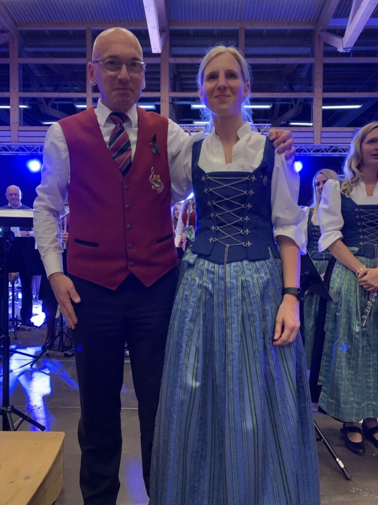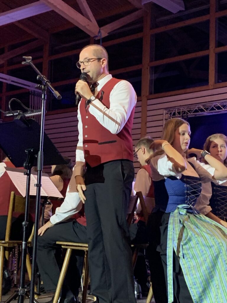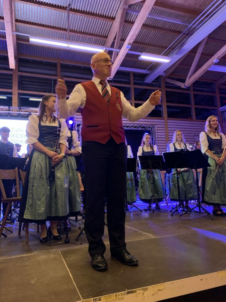 Dem folgenden „Highland Cathedral’ wurden Lebensstationen Martins durch Melanie vorangestellt. Schon als Bub mit zehn Jahren begeisterte er sich für Musik, nahm fleißig Unterricht, bildete später seine Rotweinclique, war von 2006 bis 2008 Jugendleiter im Verein, dirigierte gar mal in Bayerntracht auf dem Münchner Oktoberfest, von 2010 bis 2013 leitete er die Musikkapelle Boms, von 2013 bis 2018 den Musikverein Molpertshaus und ab 2018 die Stadtkapelle Aulendorf. Stets suchte er Neues, hatte unzählige Ideen, Energie und Humor und war stets Optimist. Die Highland Cathedral leitete Hermann Stehle eindrucksvoll, indem er insbesondere die Holzbläser forderte. Gleichzeitig waren viele Bilder zu sehen.