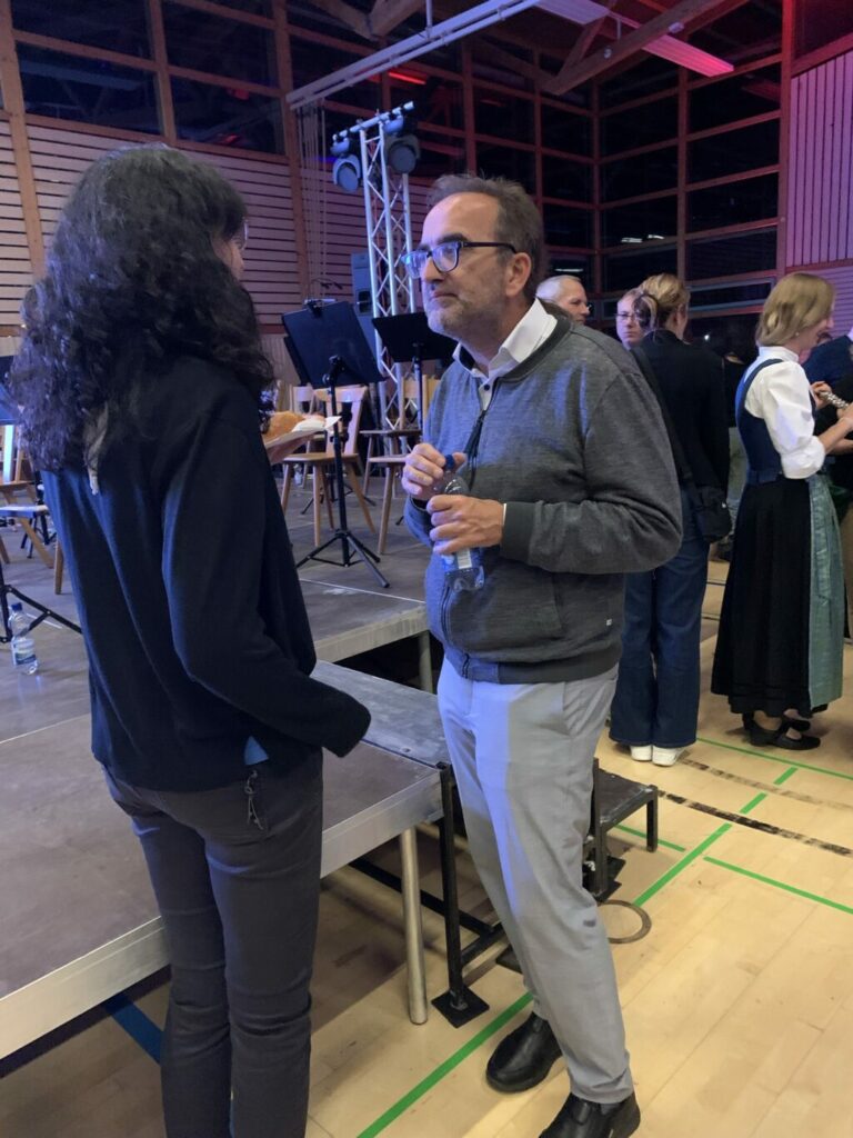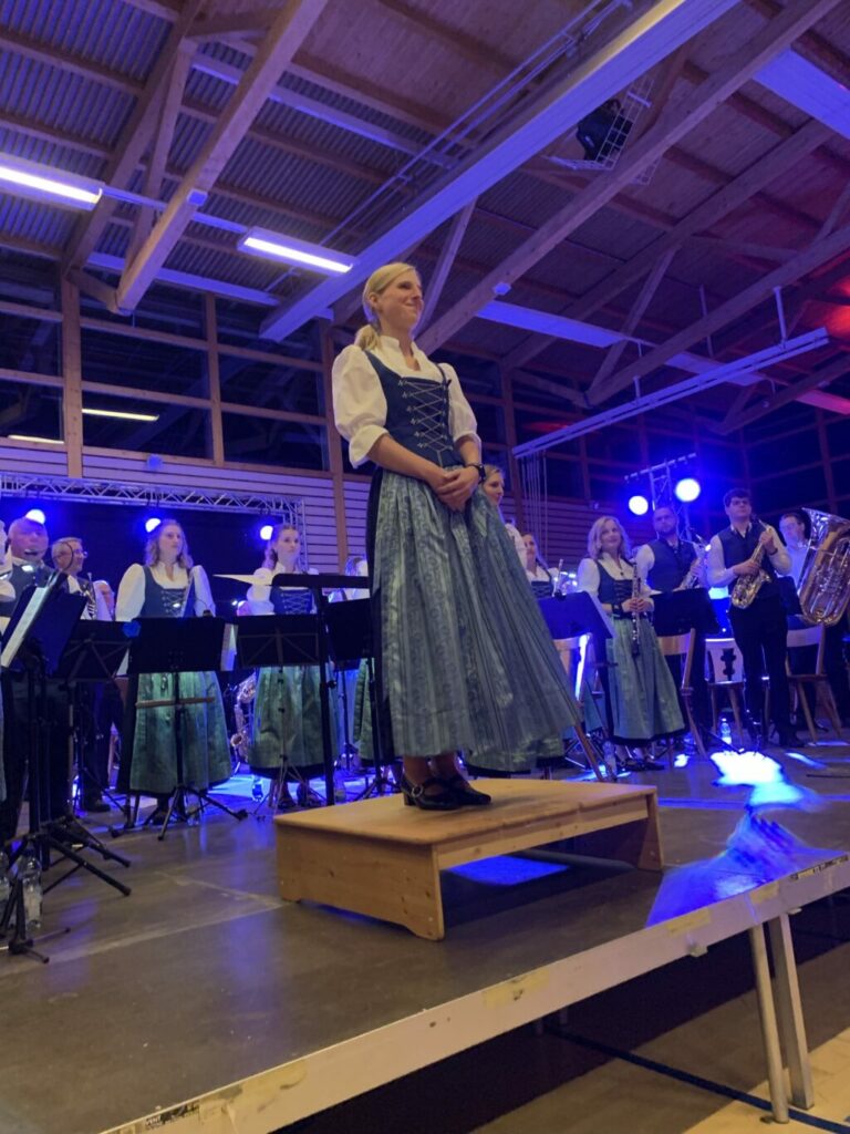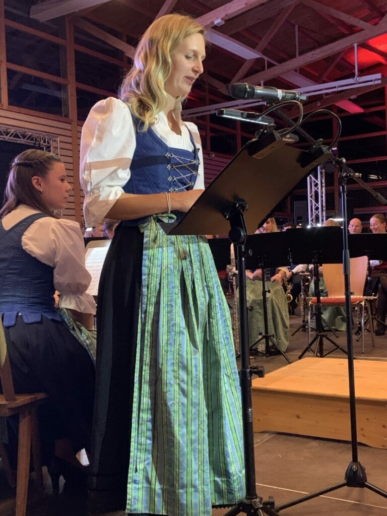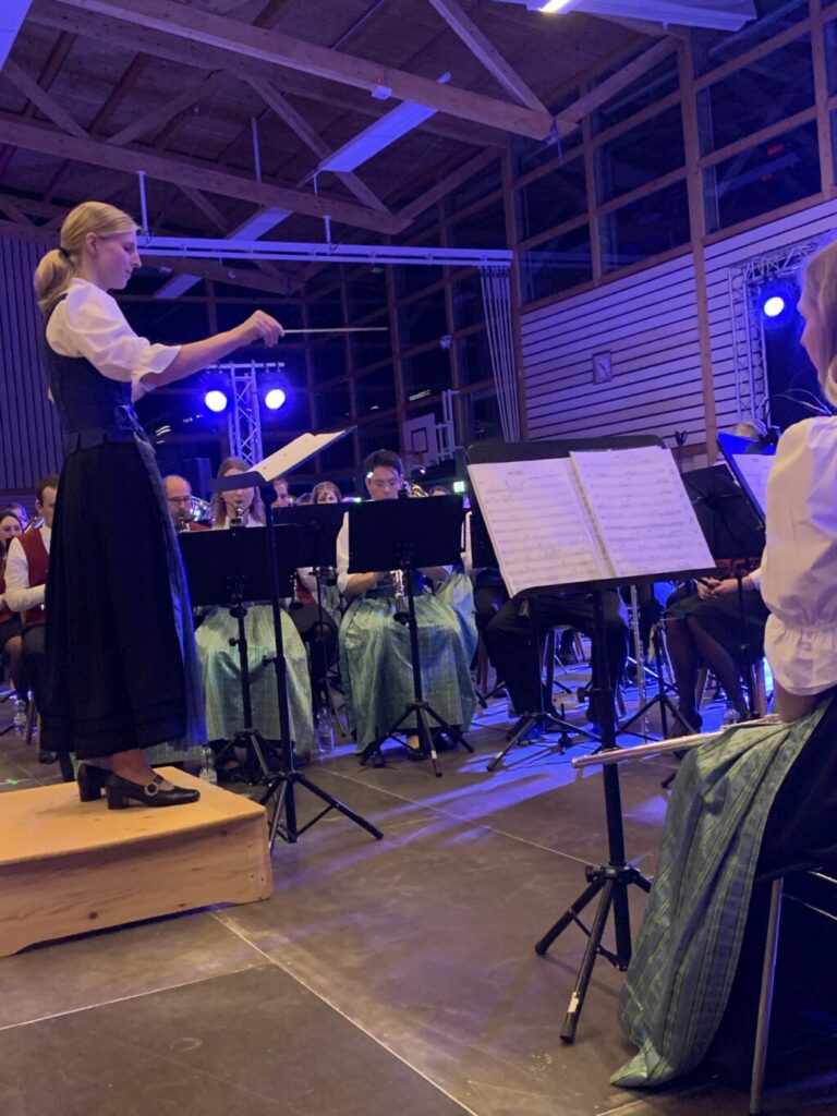 Die Musikkapelle Reute-Gaisbeuren brachte nun „Arabesque“ von Samuel R. Hazo zu Gehör. In ihrer Rolle als Ansagerin berichtete die Querflötistin Melanie Bosch von der Suche nach einem neuen Dirigenten im Frühjahr 2024, die schließlich erfolgreich mit der Verpflichtung Carina Wachters abgeschlossen werden konnte. Beim Frühlingskonzert des Musikvereins Eglofs beobachtete Martin gemeinsam mit einem Expertenteam Carina Wachter und war besonders vom Dirigat der Arabesque beeindruckt. Die Umsetzung durch Wachter überzeugte. In Melanies Einführung zu Arabesque waren tolle Bilder aus dem Morgenland zu sehen, Bilder von arabischen Festen, Moscheen oder typischen Traditionen. Martin hatte diesen Titel mit den Aulendorfern zum Neujahrskonzert 2024 einstudiert. Hervorragend gelang dies auch Carina Wachter am Abend des Brückenschlags! Insbesondere ein Querflötensolo oder das Schlagwerk zauberten einen Hauch von Orient in den Saal, den der gesamte Klangkörper unterstrich. So entstand ein Brückenschlag zwischen Morgen- und Abendland.