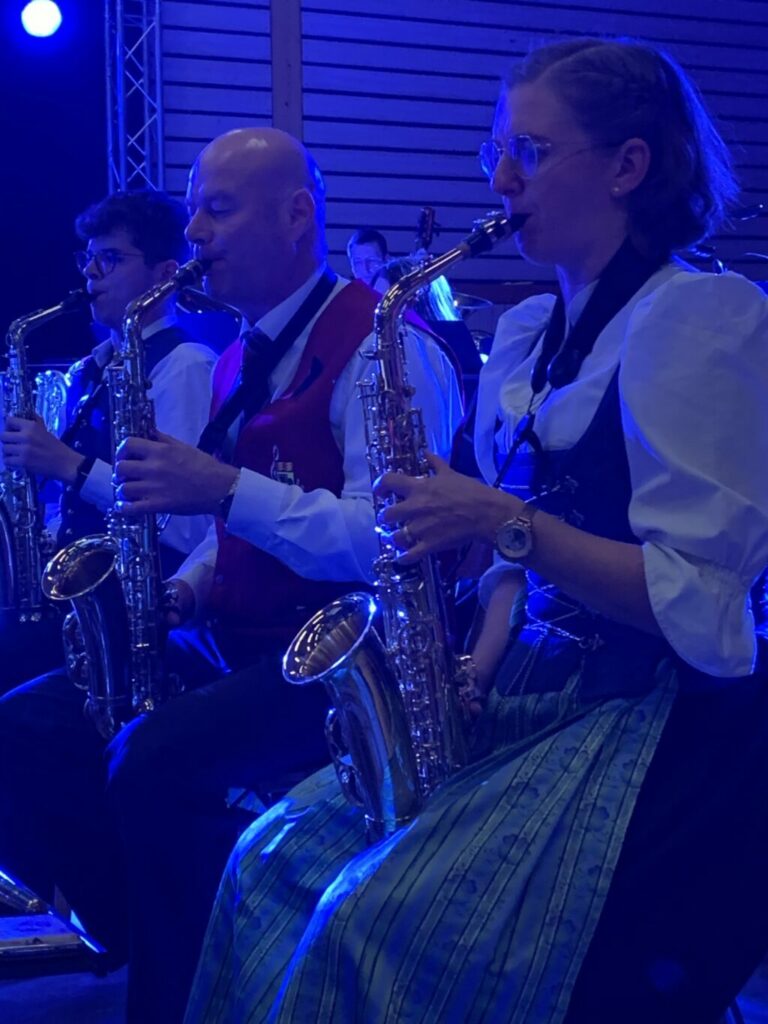 Saxophonisten aus beiden Kapellen nebeneinander.