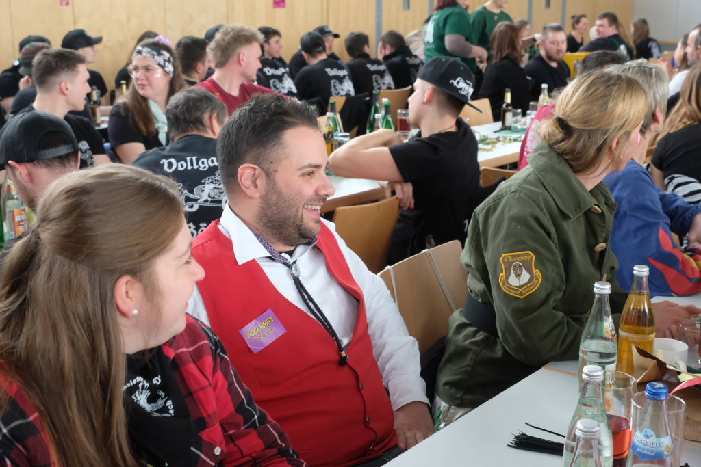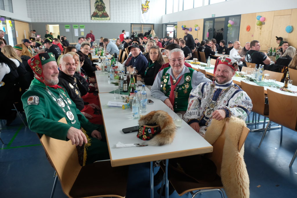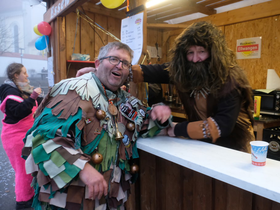 Zum Umzug trugen alle Vereine des Ortes ihren Teil bei, um die zahlreichen Narren und Gäste zu versorgen. So gab es bei der Feuerwehr Kaffee und Kuchen, in der Halle und um die Halle sorgte die Zunft für die Verpflegung. Bei der Grundschule versorgte der Musikverein Ellwangen die Narren und Zuschauer mit Leberkäs-Wecken, die so gut mundeten, dass „Neandertaler“ Walter Engeser schon während des Umzugs den Ausverkauf vermelden musste. Aber Flüssignahrung – zwei Bier ersetzen eine ganze Mahlzeit – half dem einen oder anderen über diesen Schmerz hinweg.