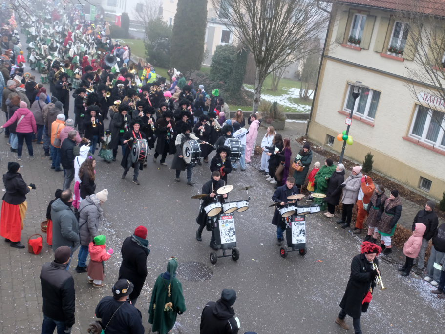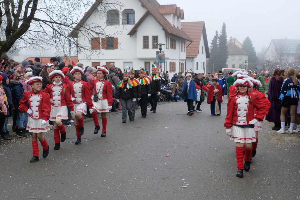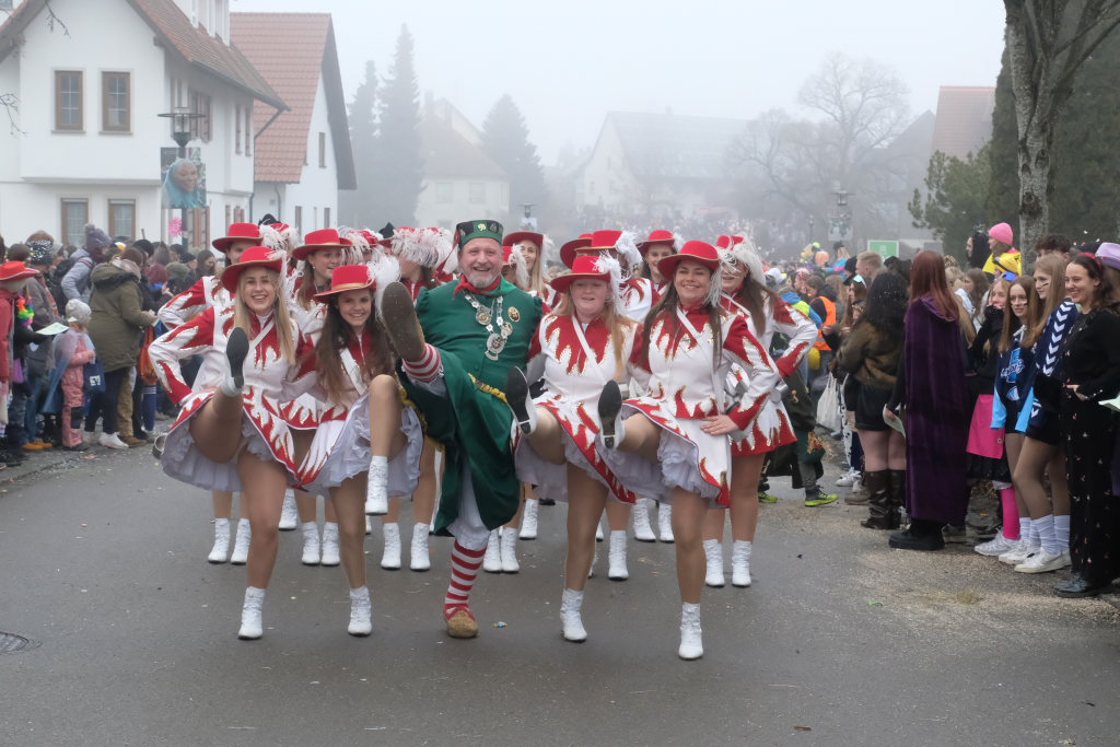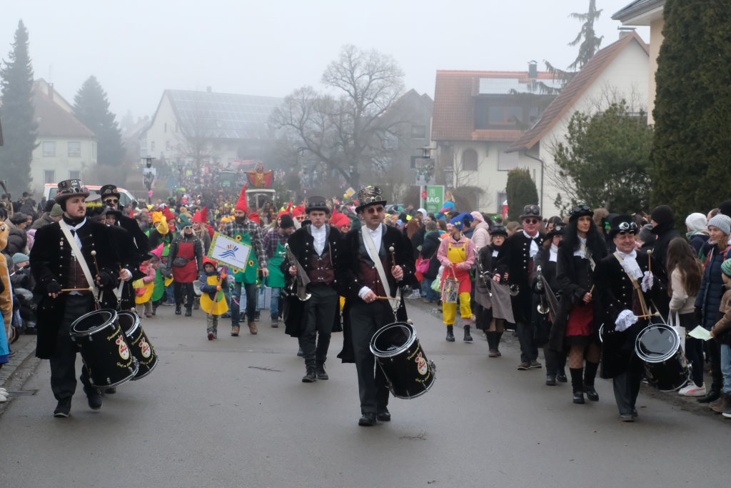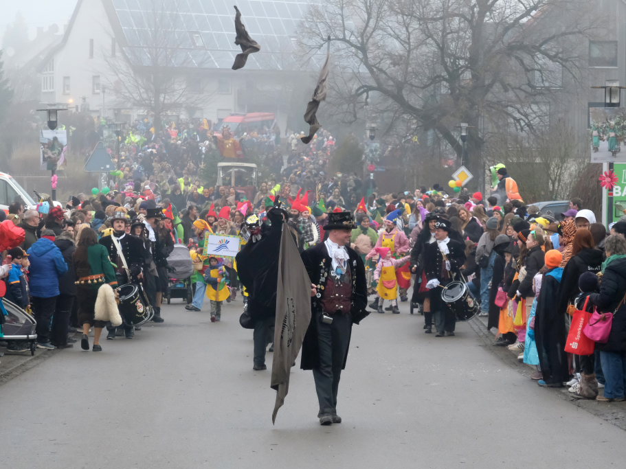 Die Hauerzer Baadgoischdr durften natürlich als Nachbarn nicht fehlen. Und D´Langjupp Seibranz hatte sich im Gefolge der Vollgasbänd die Dienste eines ganz prominenten Däfeles-Bua gesichert: der Seibranzer Zunftmeister Willi „WilliBu“ Butscher höchstpersönlich kündigte seine Narrenzunft mit der überdimensionalen Langjupp-Figur an. Einen ganz besonderen „Chef“ hatten auch die Schalmeien d`Riedspatza dabei: Wolfgang Lahl ist im Hauptberuf Bürgermeister von Weil im Schönbuch. Die dritte „Musik“ war der Fanfarenzug Bad Wurzach, der im vergangenen Jahr seinen 60er feierte und sich dafür fasnetlich neu einkleidete, mit topmodischer Leo-Hose und Lila Kunstpelz-Jacke.