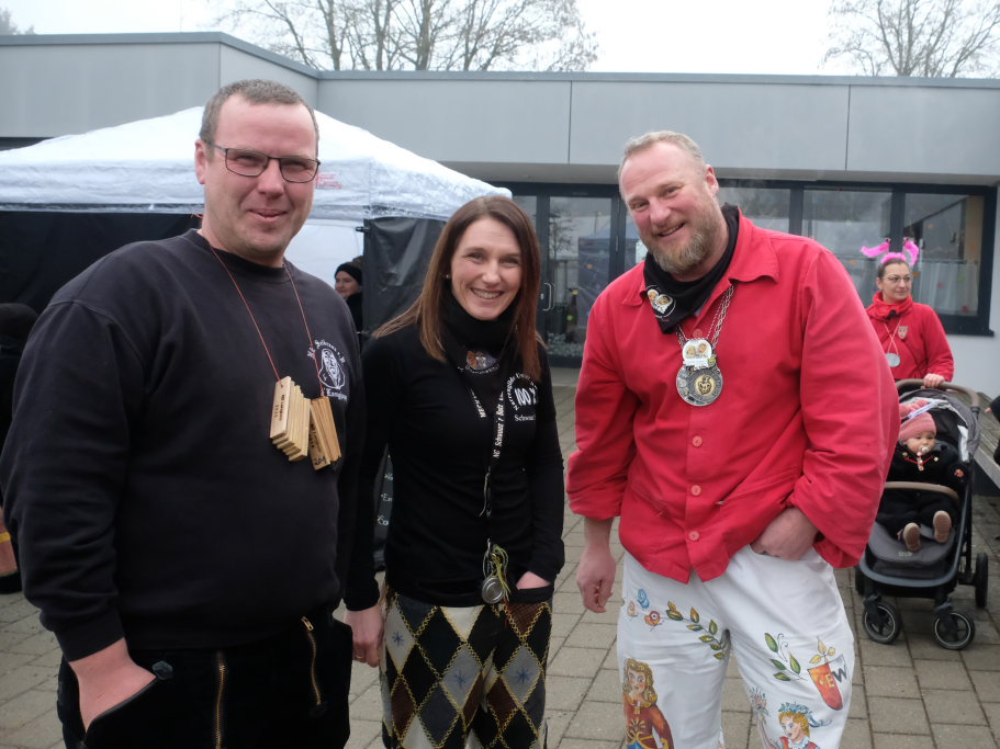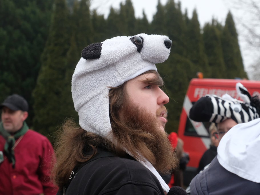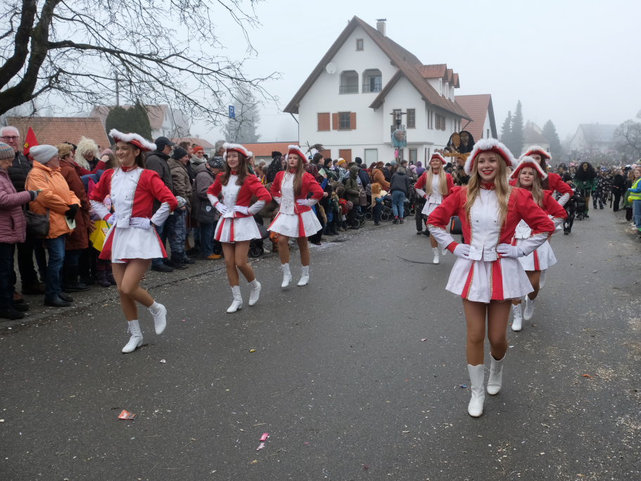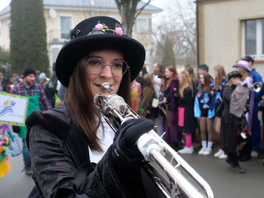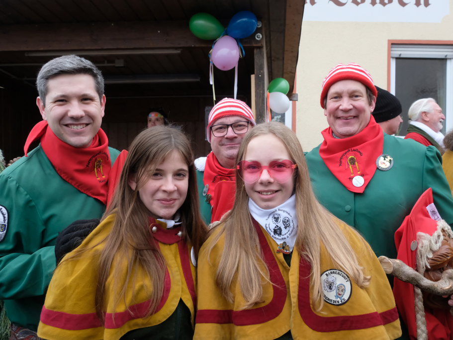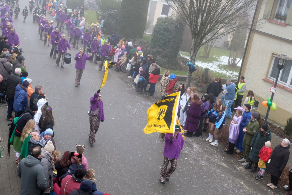 Die Hauerzer Baadgoischdr durften natürlich als Nachbarn nicht fehlen. Und D´Langjupp Seibranz hatte sich im Gefolge der Vollgasbänd die Dienste eines ganz prominenten Däfeles-Bua gesichert: der Seibranzer Zunftmeister Willi „WilliBu“ Butscher höchstpersönlich kündigte seine Narrenzunft mit der überdimensionalen Langjupp-Figur an. Einen ganz besonderen „Chef“ hatten auch die Schalmeien d`Riedspatza dabei: Wolfgang Lahl ist im Hauptberuf Bürgermeister von Weil im Schönbuch. Die dritte „Musik“ war der Fanfarenzug Bad Wurzach, der im vergangenen Jahr seinen 60er feierte und sich dafür fasnetlich neu einkleidete, mit topmodischer Leo-Hose und Lila Kunstpelz-Jacke.