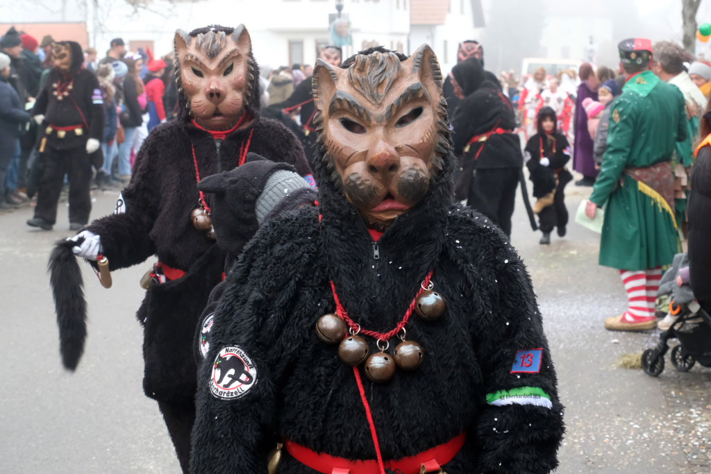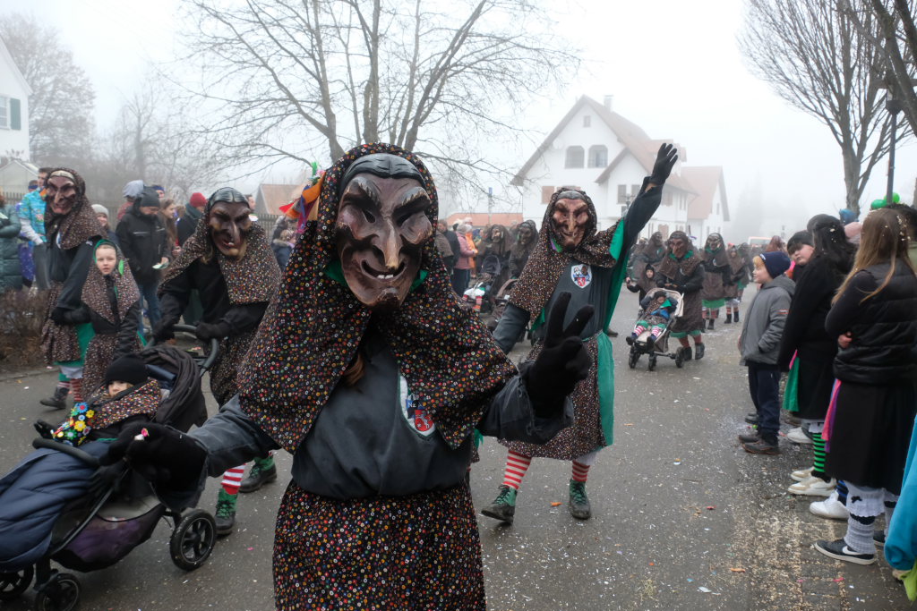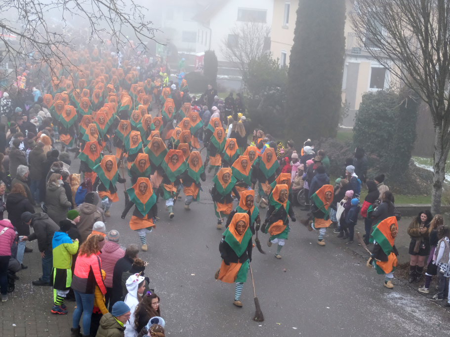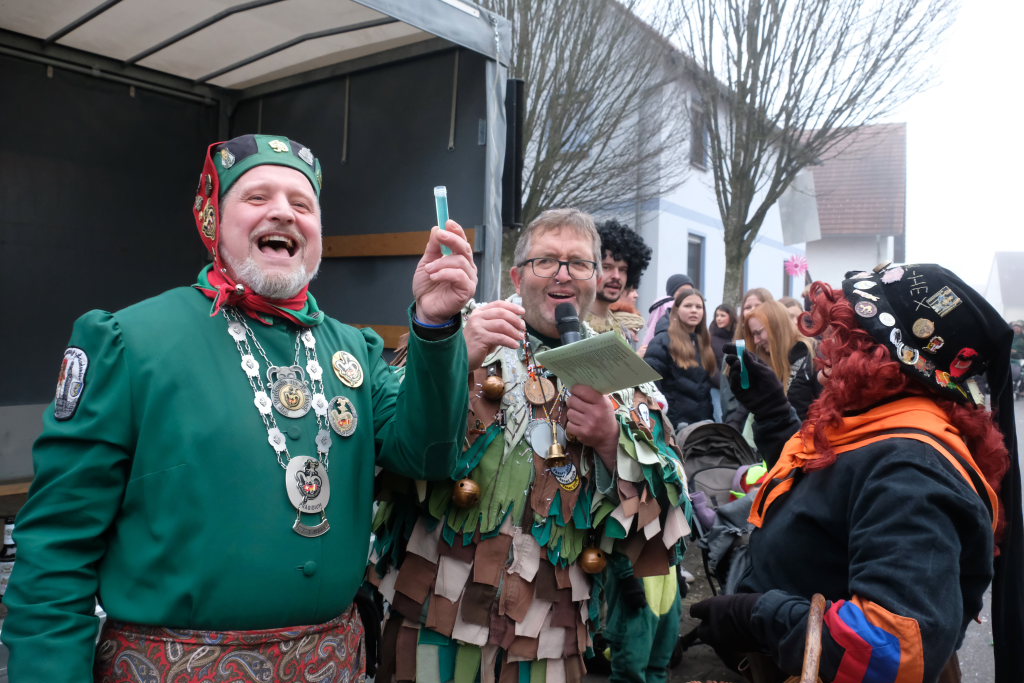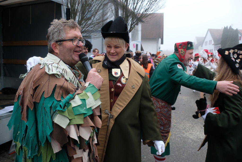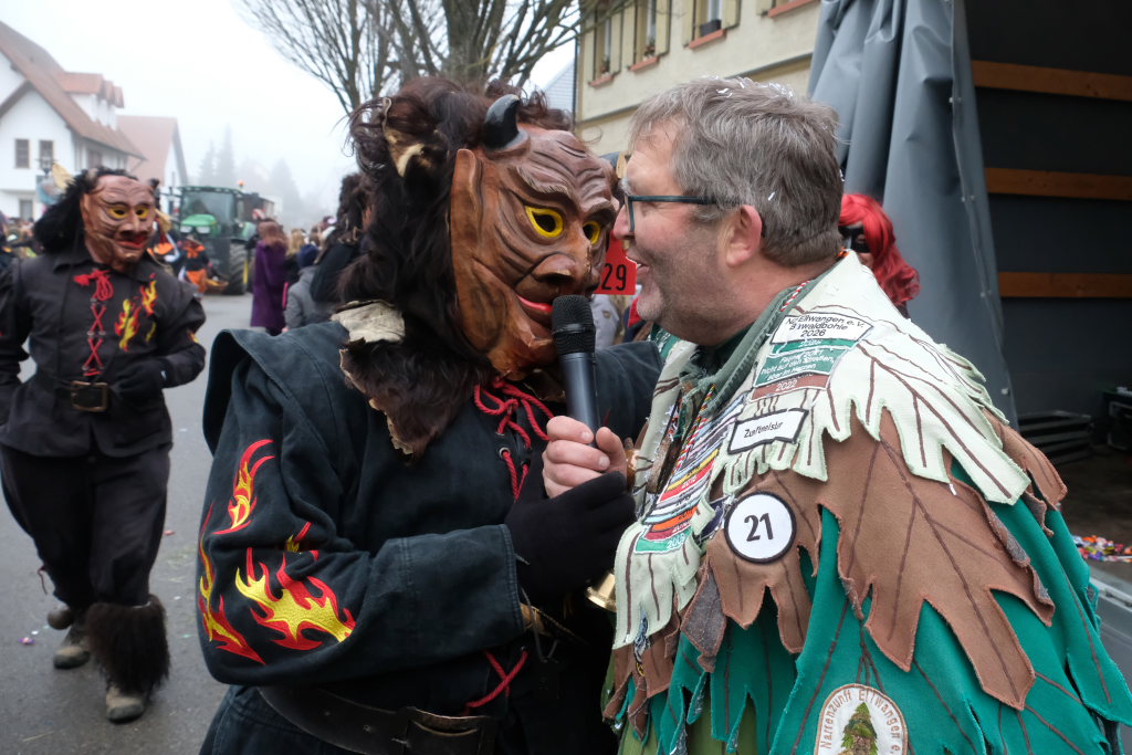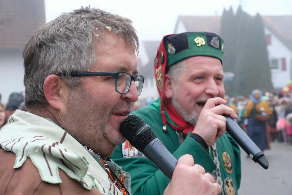 Und es gab für das „Dreamteam“ viel zu kommentieren: Etwa die riesige Narrenschar, die sich vom benachbarten Eberhardzell mit allen Masken in das kleine Dorf am Ellbach aufgemacht hatte. Egal ob schwarze Katz, Hansel oder Neideck Hexe, alle waren sie gekommen um mit den Ellwangern deren Straßenfasnet zu feiern.