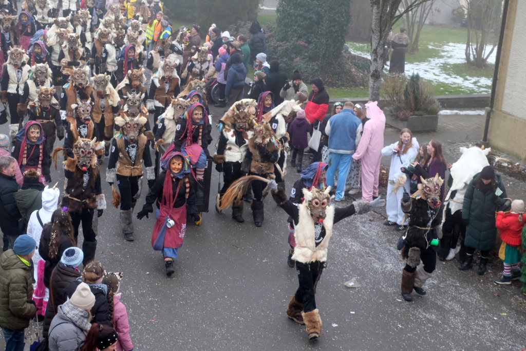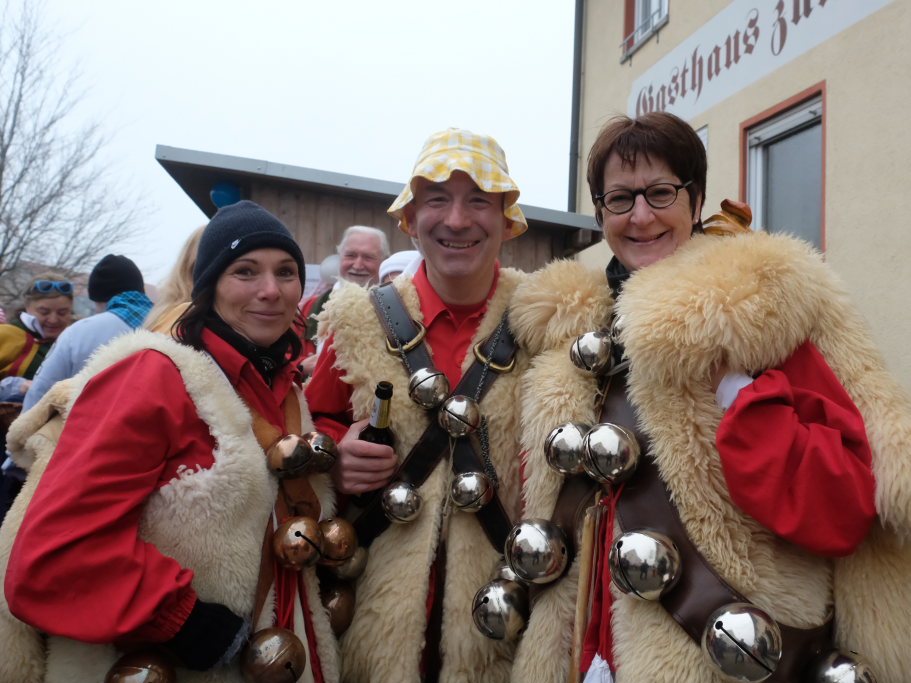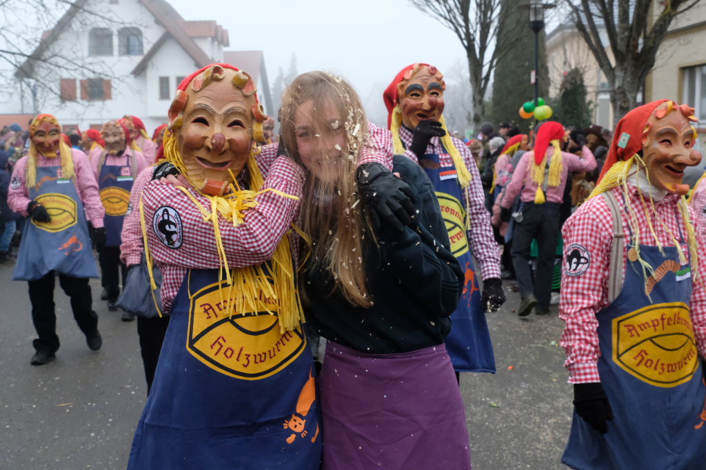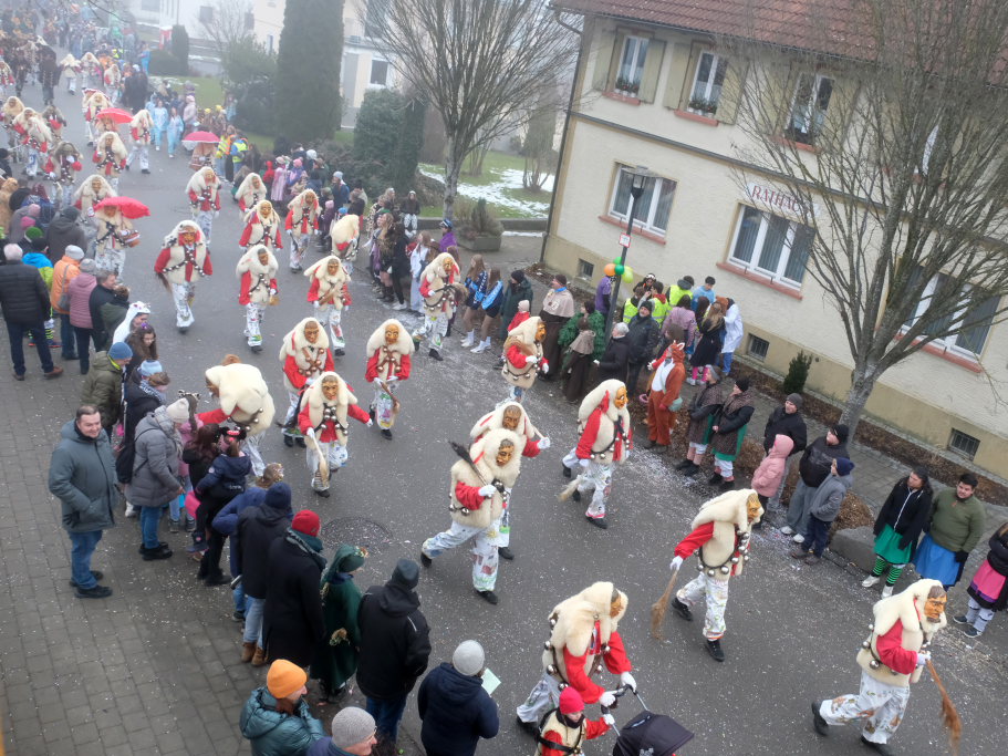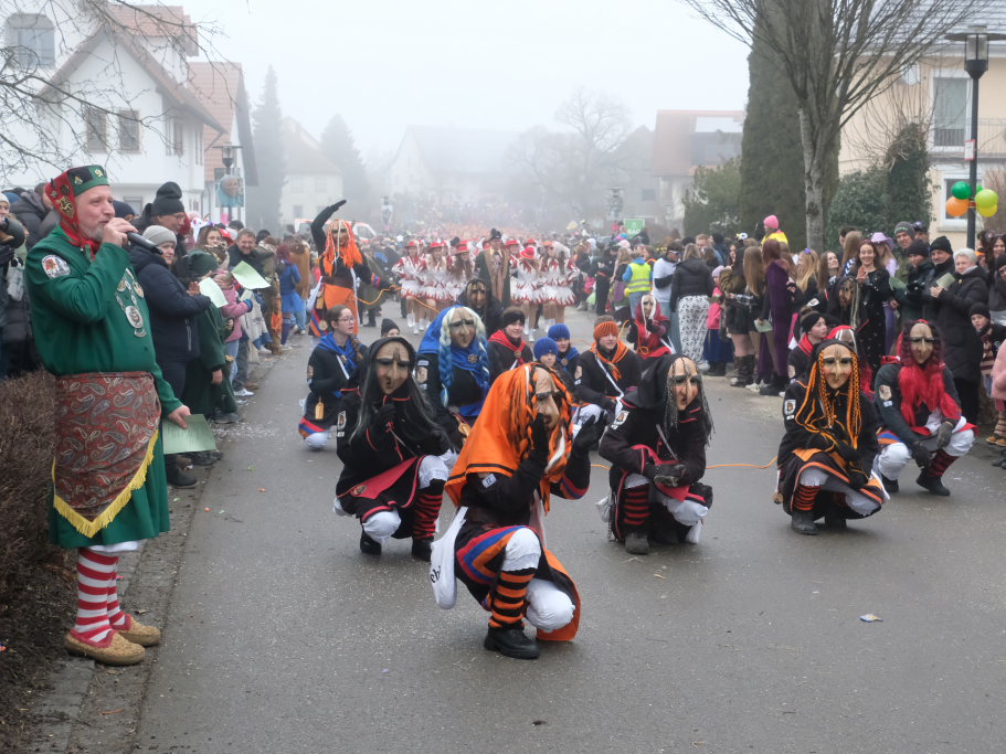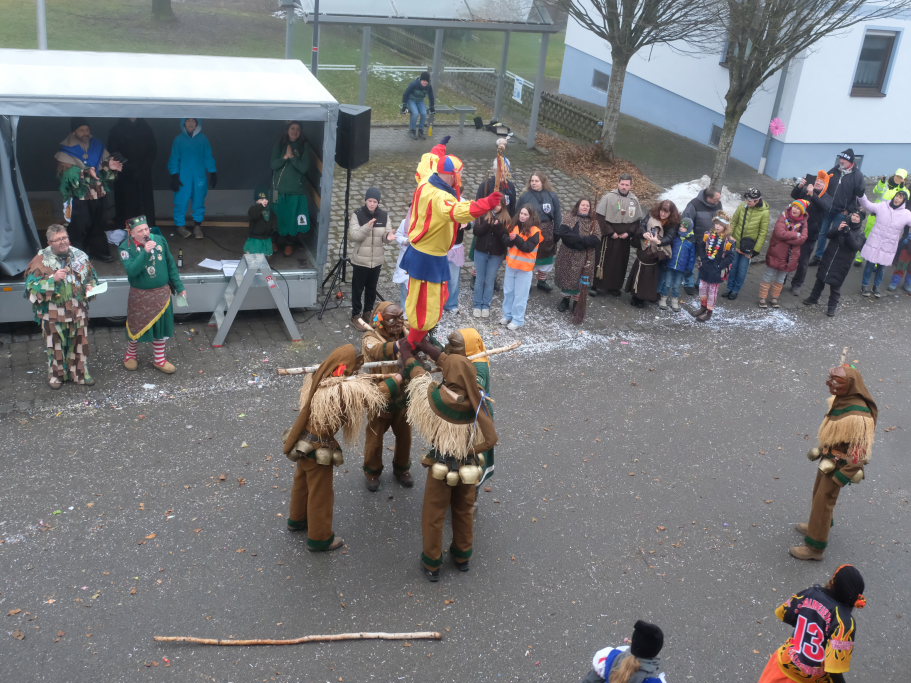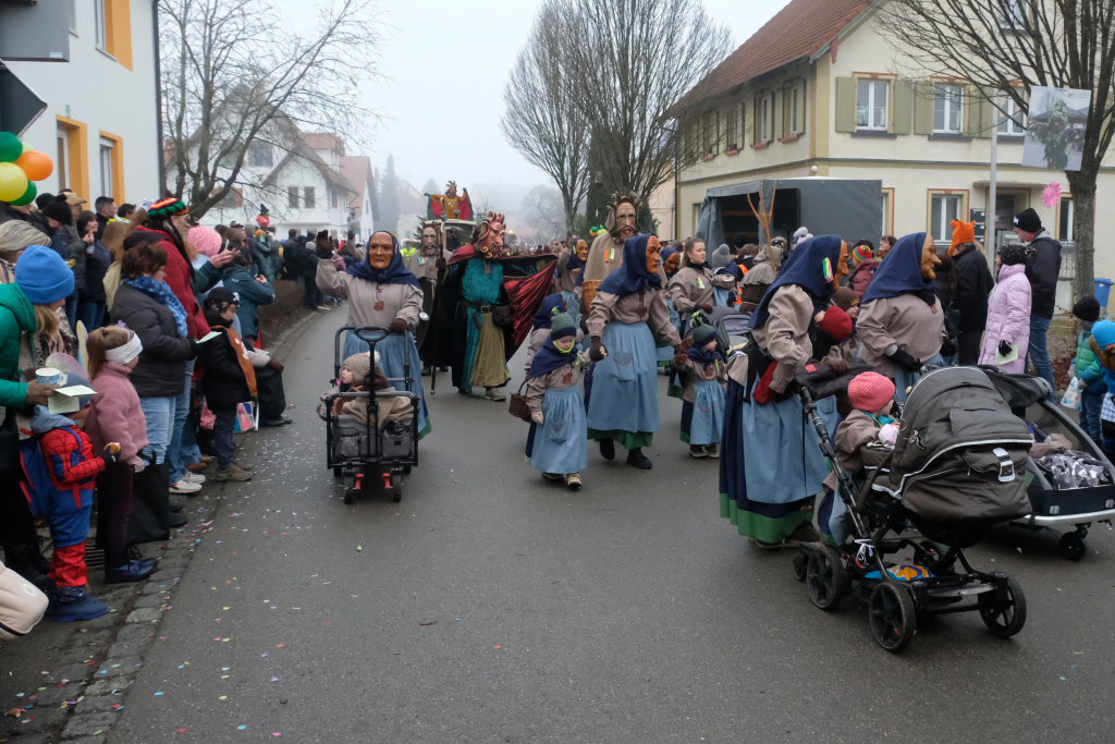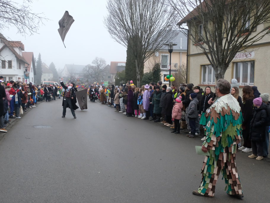 Und es gab für das „Dreamteam“ viel zu kommentieren: Etwa die riesige Narrenschar, die sich vom benachbarten Eberhardzell mit allen Masken in das kleine Dorf am Ellbach aufgemacht hatte. Egal ob schwarze Katz, Hansel oder Neideck Hexe, alle waren sie gekommen um mit den Ellwangern deren Straßenfasnet zu feiern.
