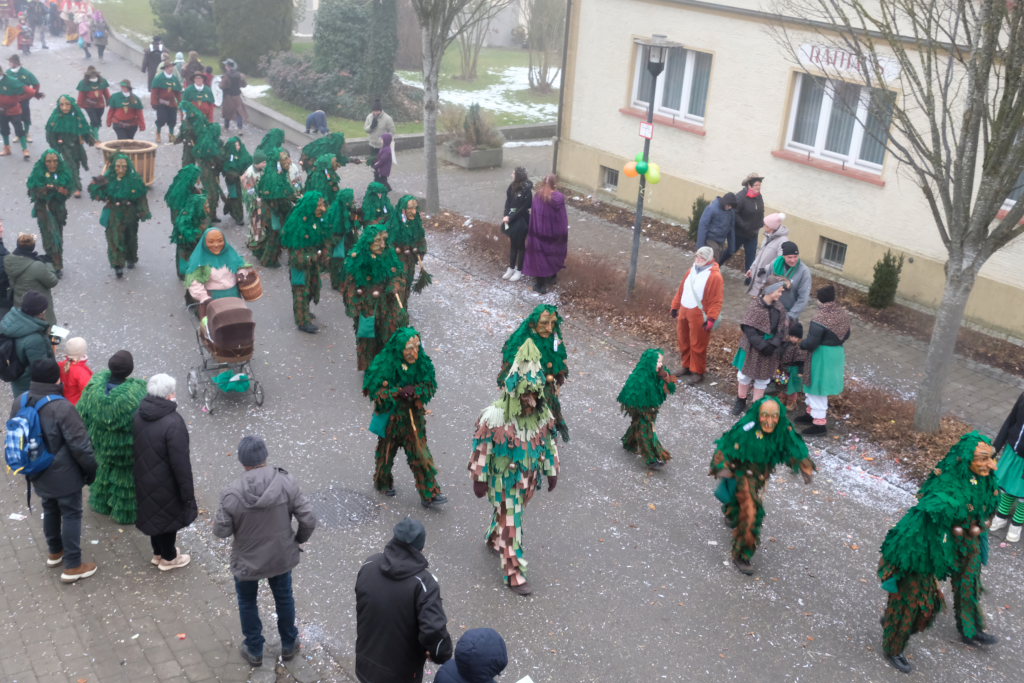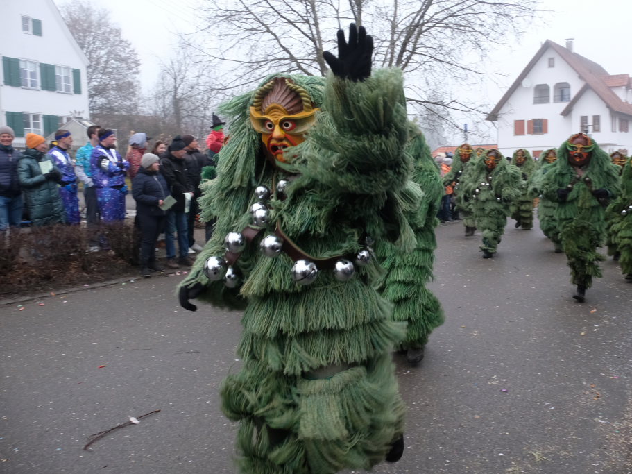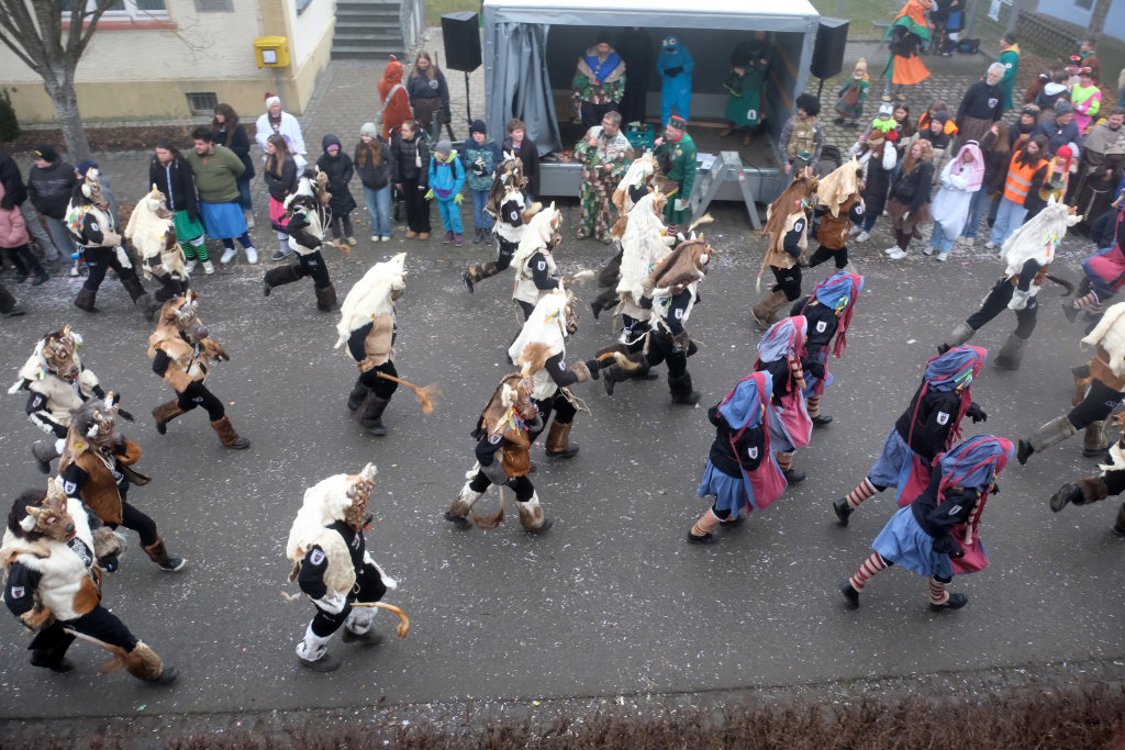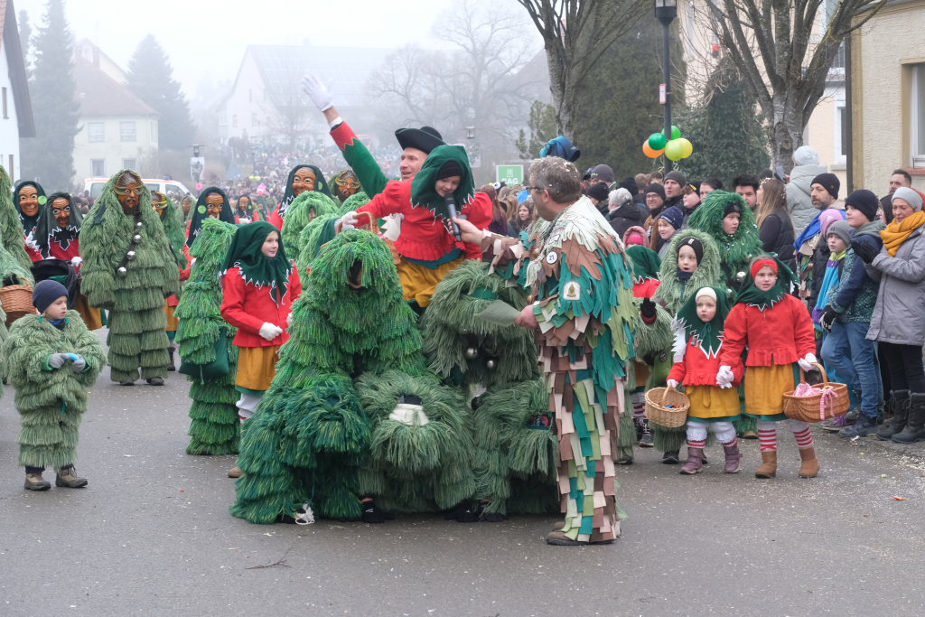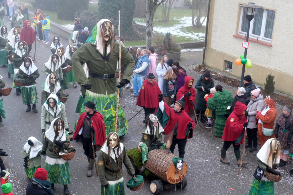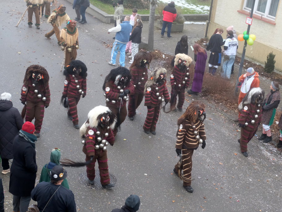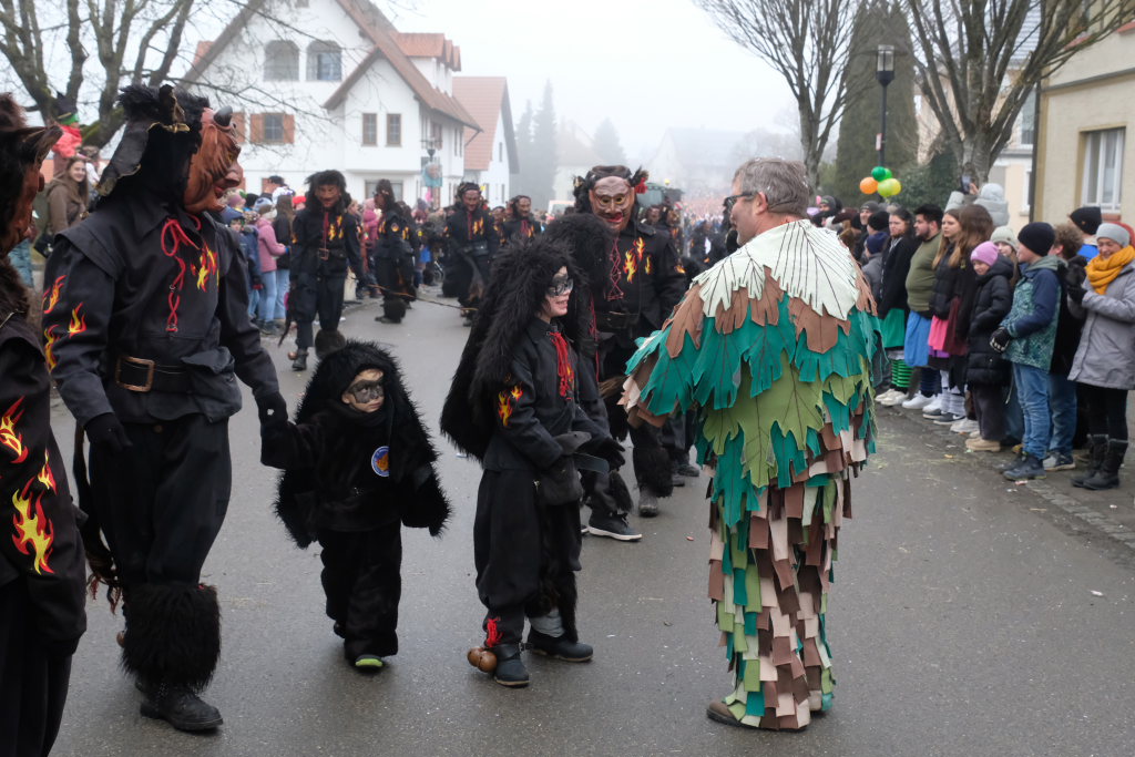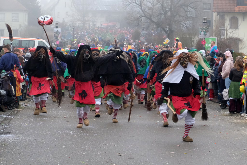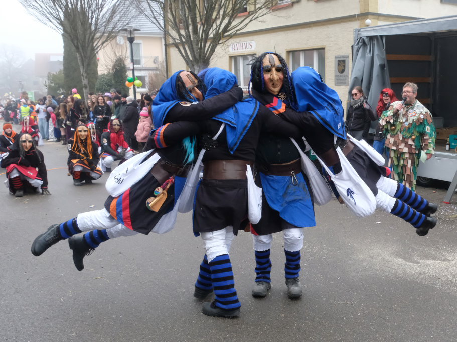 Mit den weitesten Weg auf sich genommen hatten die Lauinger Hexen, die Heimatzunft von Alex Wild sowie die beiden Ulmer Zünfte mit Gauga Ma und Hagelhex. Den Abschluss des Zuges bildete dann der „Mischwald“ bestehend aus einigen Bahwaldbohle und den Baindter Rasplern.