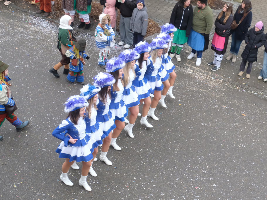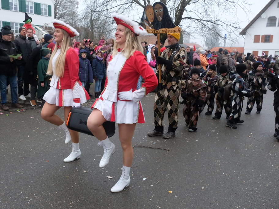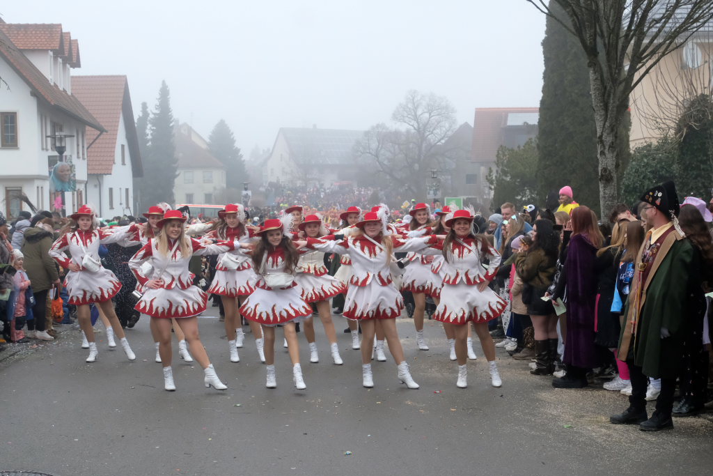 „Siesch dr Butz gucka – mit ra Zahlucka“ schallte es unter den Masken der Unterschwarzer Butza hervor. Wobei die Zähne der jungen Gardemädchen durchaus – dank ihres Lächelns –ganz ansehnlich waren. Ansager Alex Wild fragte angesichts der beiden einen Ghettoblaster schwingenden Gardemädchen aus Unterschwarzach, ob man die jetzt wohl als Boxenluder bezeichnen dürfe? Als „Buße“ durfte der durchaus fitte Wild – bei guter Tagesform schafft er auch einen Spagat – danach gemeinsam mit den Gardemädchen aus Eberhardzell einen flotten Can-Can auf die Ellwanger Hauptstraße zaubern.