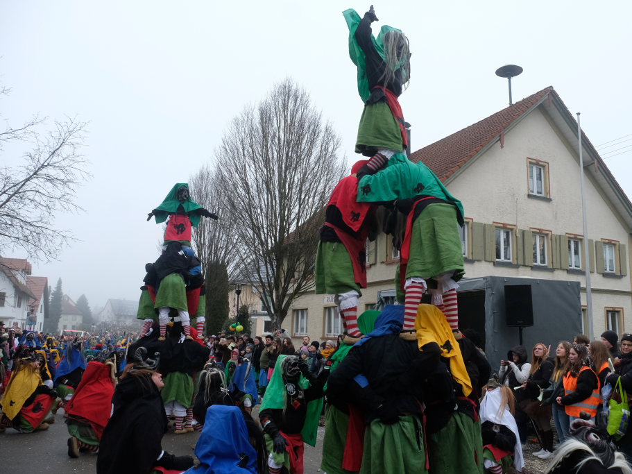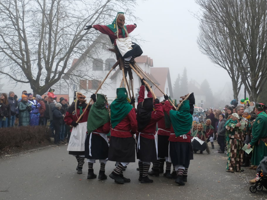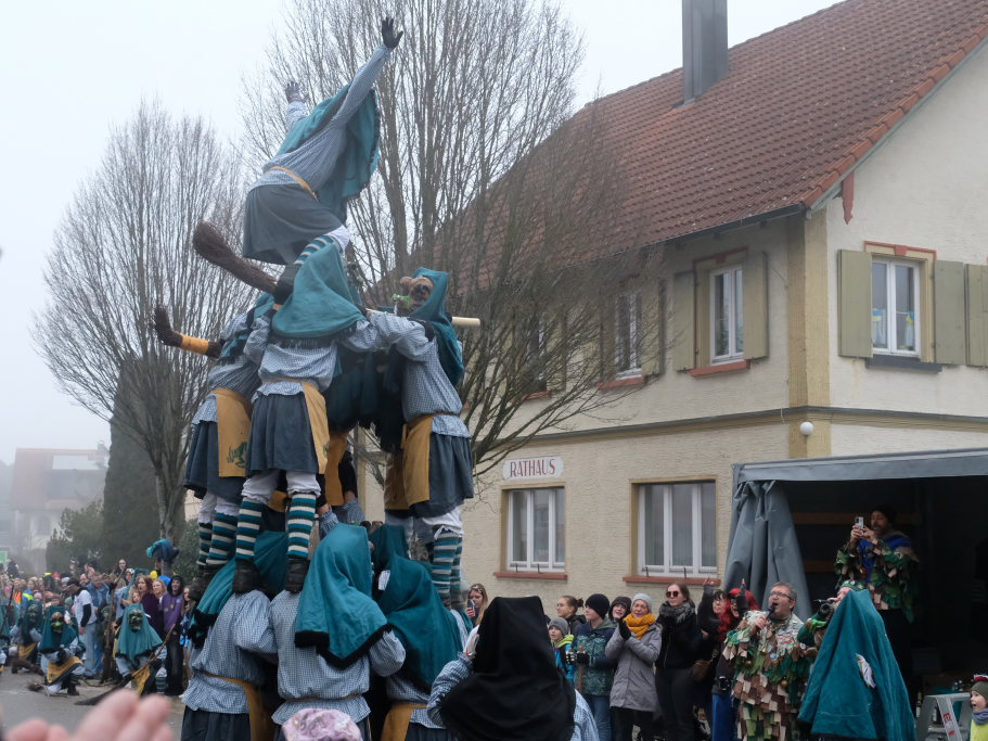 Ob die Bad Wurzacher Riedmeckeler wohl noch den Bürgerentscheid gegen den Turm im Hinterkopf hatten? Auf jeden Fall bauten sie einen solchen, auf dessen Spitze sich der Hopeditz präsentierte. Die Großgemeinde war mit fünf Zünften und drei Musiken vertreten. Neben den Wurzachern selbst und Schwaazer Butz waren natürlich die Haidgauer Chadaloh mit dabei, die seit Urzeiten den Ellwangern freundschaftlich verbunden sind.