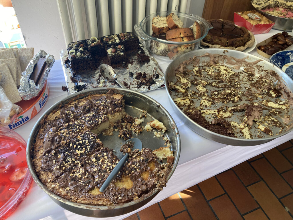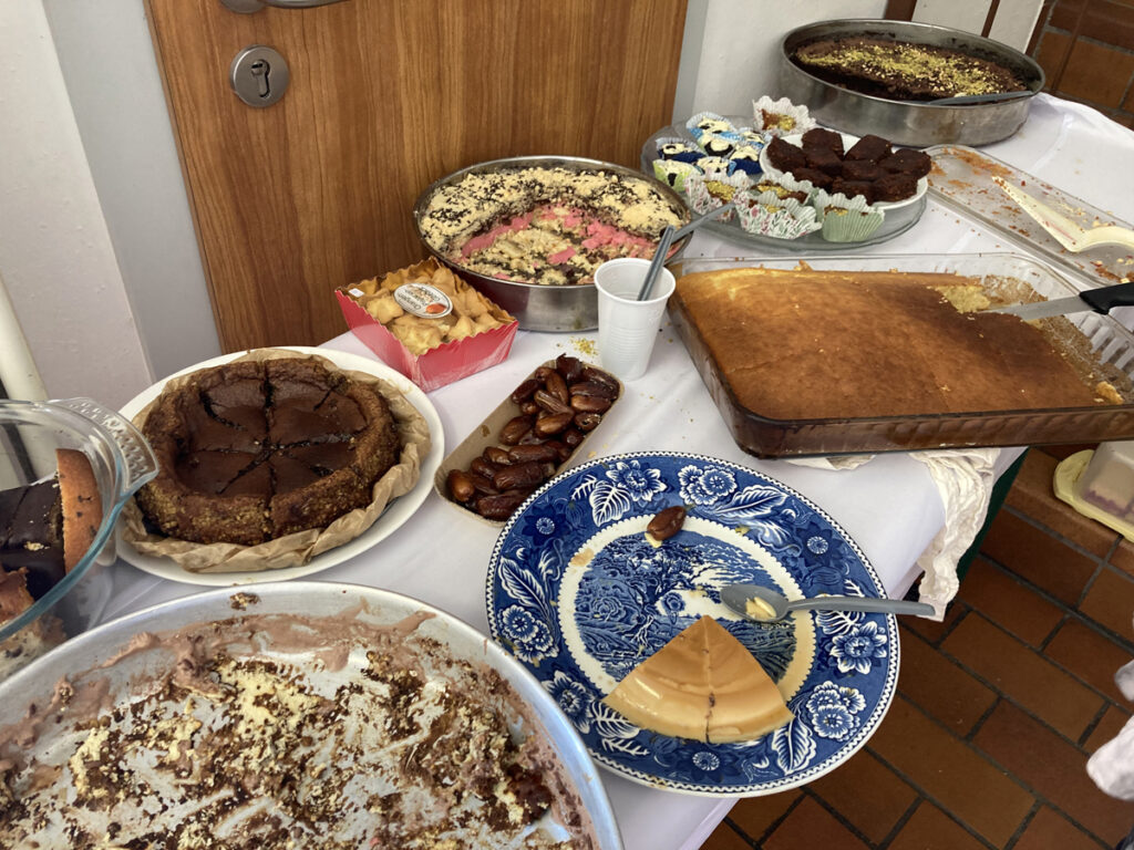 Trotz des gleichzeitig stattfindenden Ölmühlenfests fanden viele Gäste den Weg zur Unterkunft. Dort erwartete sie ein liebevoll aufgebautes Buffet mit kulinarischen Spezialitäten – vorwiegend von den Bewohnern der Unterkunft in Reute selbst zubereitet. In den frühen Morgenstunden hatten sich auf beiden Etagen der Unterkunft etwa fünf „Küchenkenner“ an die Zubereitung gemacht: Auf der einen Etage entstanden süße Köstlichkeiten – liebevoll angerichtet in Papierförmchen, unter Anleitung zweier syrischer Köche. Auf der anderen Etage gab es Pikantes: frisch gerollte Weinblätter, Falafel mit Joghurt-Dip und viele weitere Spezialitäten aus der syrischen Küche.