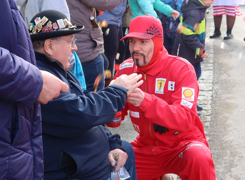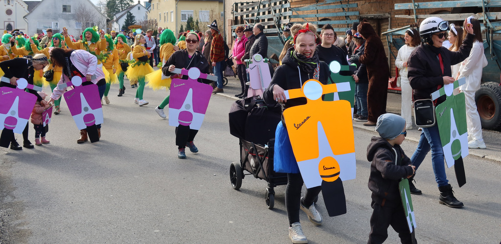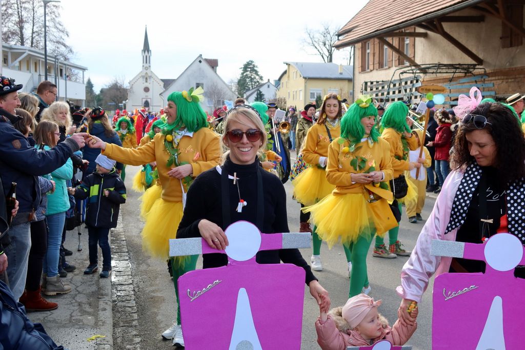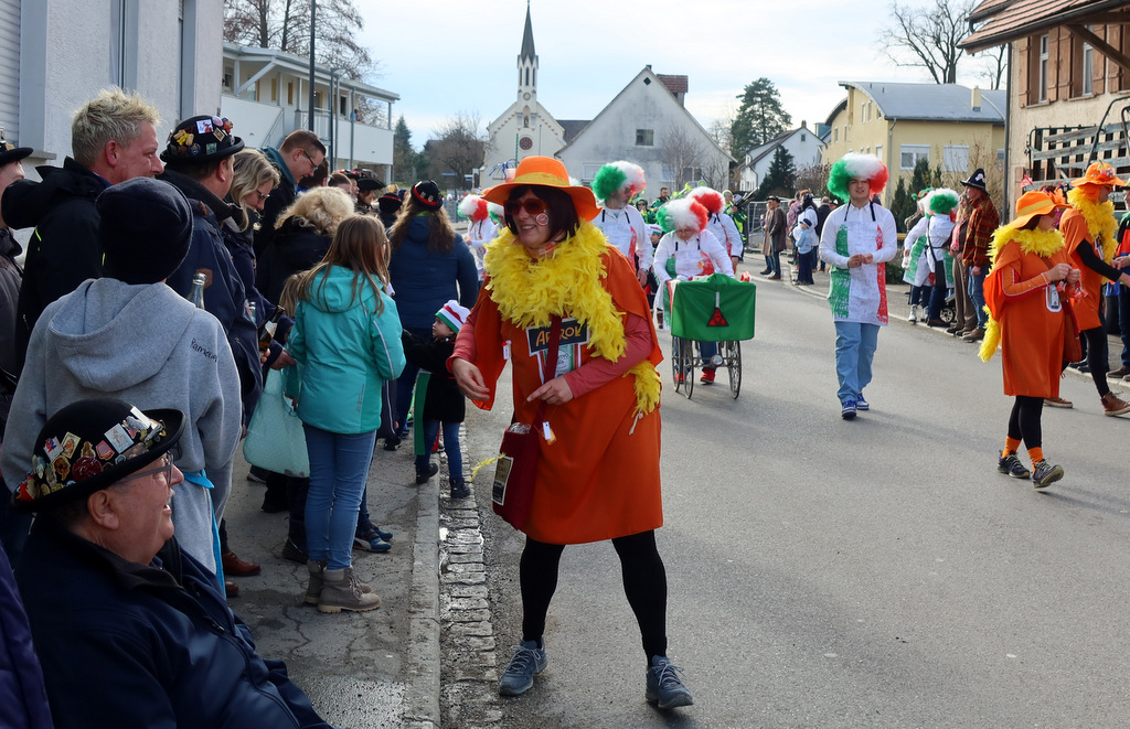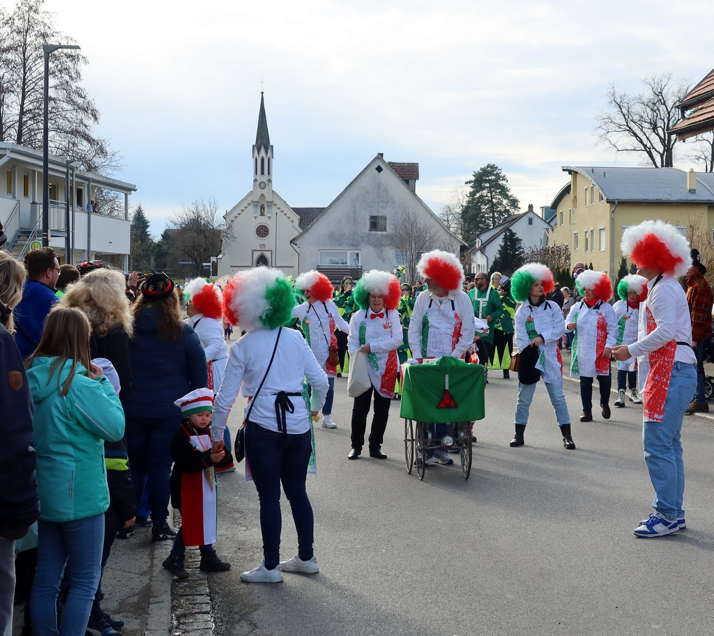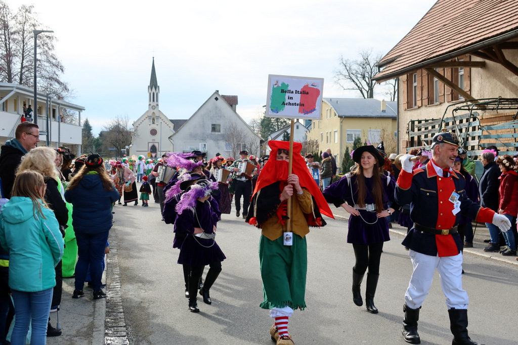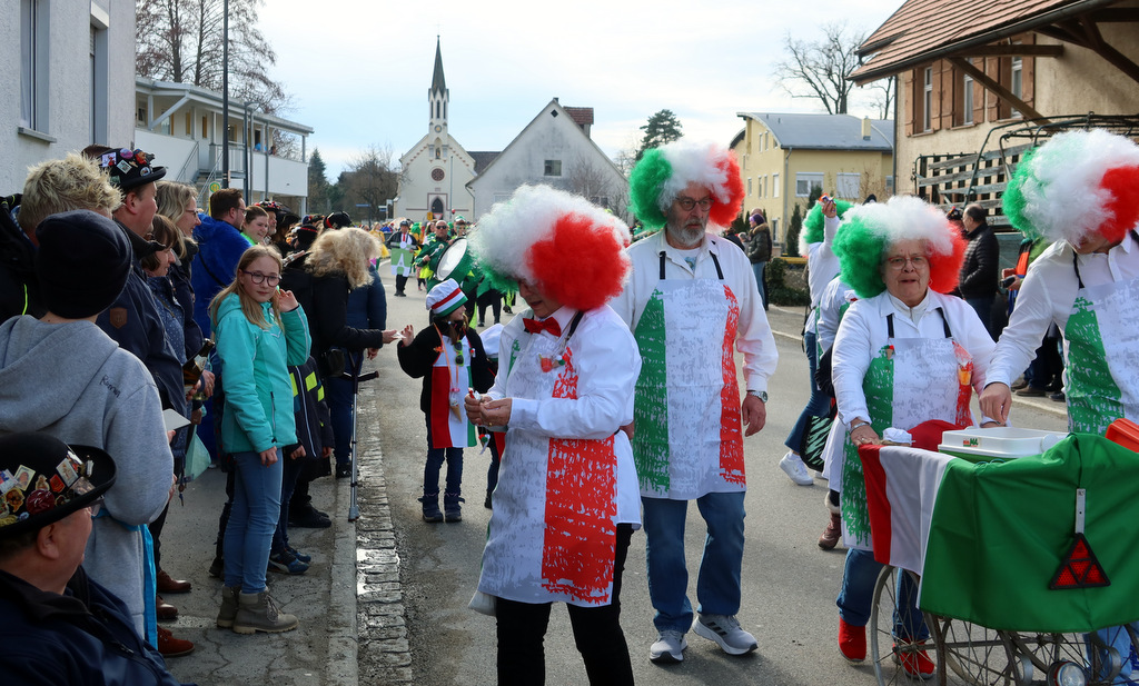 Angeführt wurde der närrische Umzug der „Achsteiner“ durch den Büttel Armin Sauter, gefolgt von den Steinacher Gardedamen. Die bunt gemischten Gruppen mit italienischem Outfit schwärmten aus und trieben ihren Schabernack mit den Zuschauern. Da waren Mafiosi dabei, genauso wie nett kostümierte mit Citrusfrüchten behängte Ausschenkerinnen von Aperol und Limoncello. Natürlich durften die Nationalfarben, wunderschön dargestellt in Grün-Weiß-Rot Trikolore-Kostümierungen nicht fehlen. Auch spezielle Vesperangebote mit italienischen Pizza-Nationalgerichten wie auch Parma-Schinken machten „Buon appetito“ zum Leitwort.