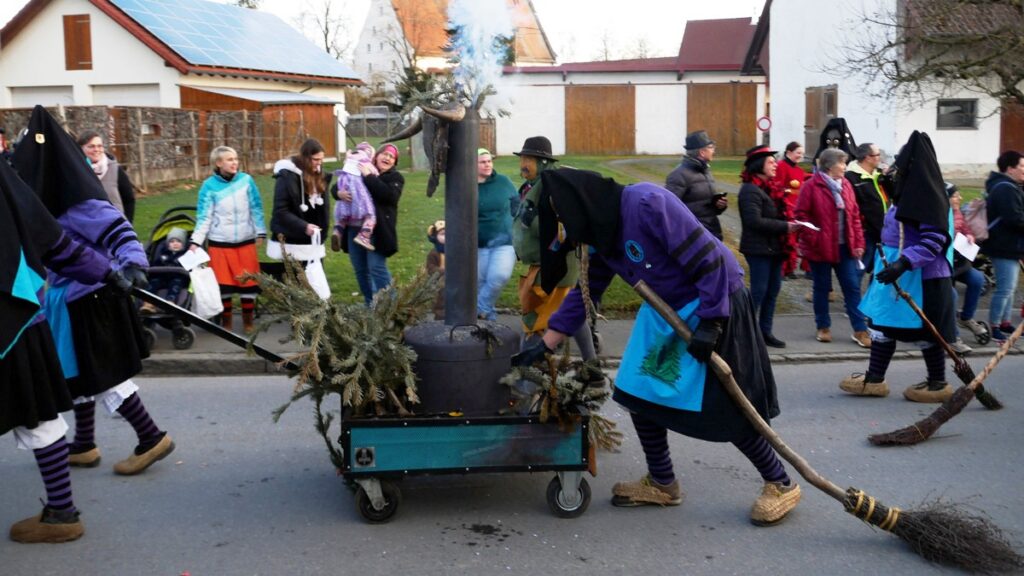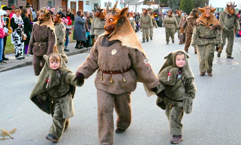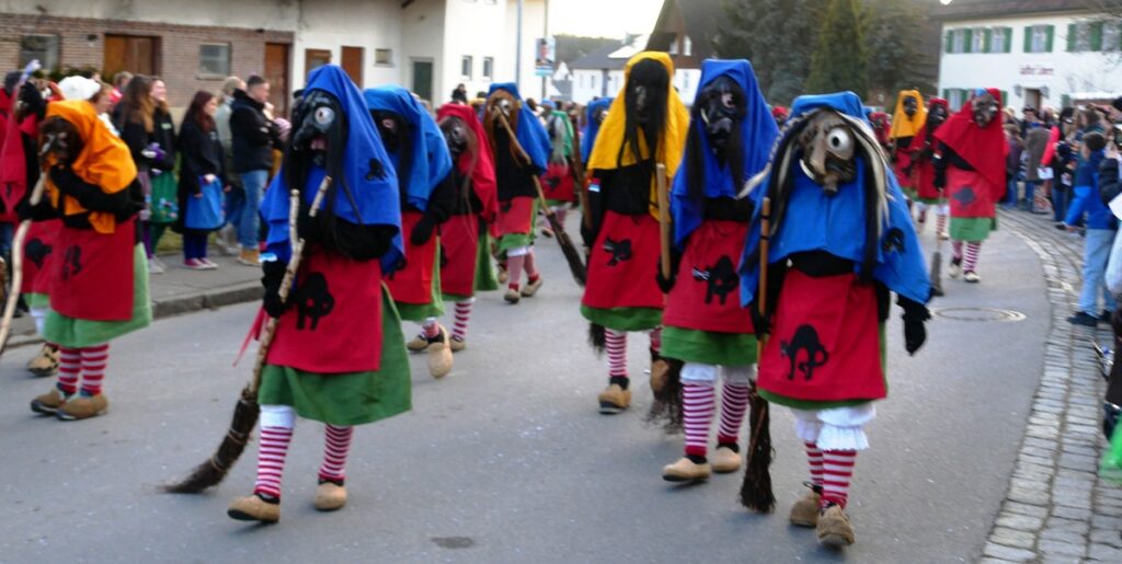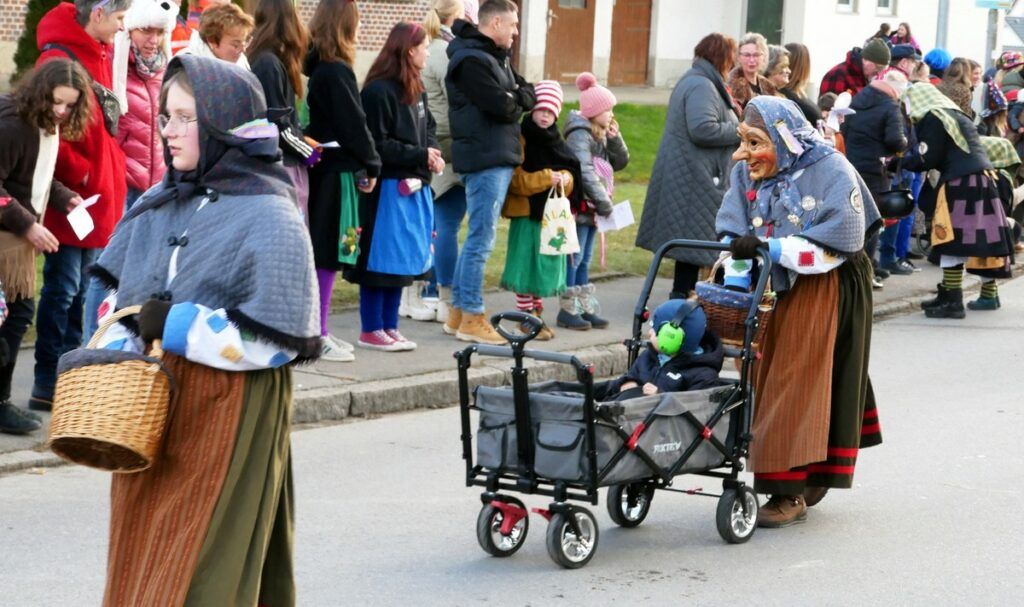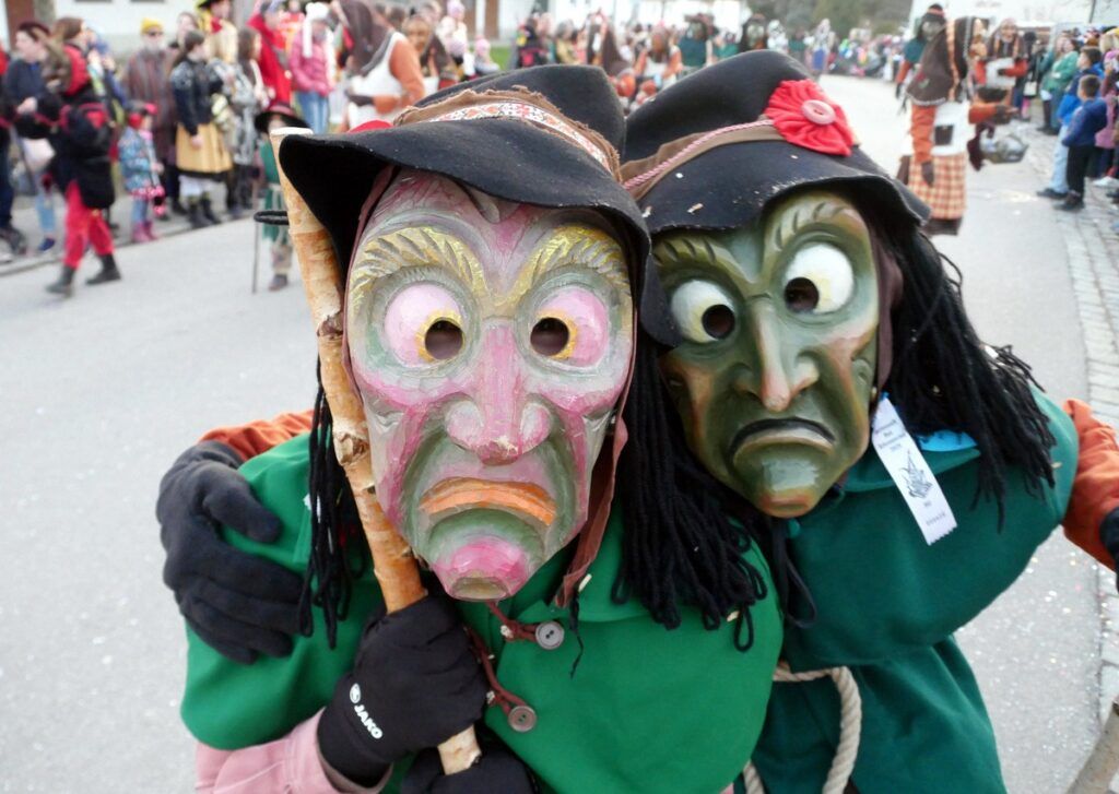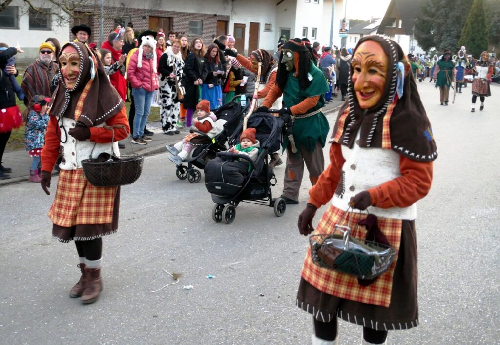 Die Maskenträger und die in auffallend großer Anzahl sie begleitenden Kinder zeigten sich recht freigebig und verteilten Süßigkeiten und versprühten närrischen Geist richtig freudvoll. Beim Start des Umzugs war es noch hell, aber schon eine Stunde später bei beginnender Dämmerung wirkten vor allem die Hexen noch schaurig schöner als bei Tageslicht.