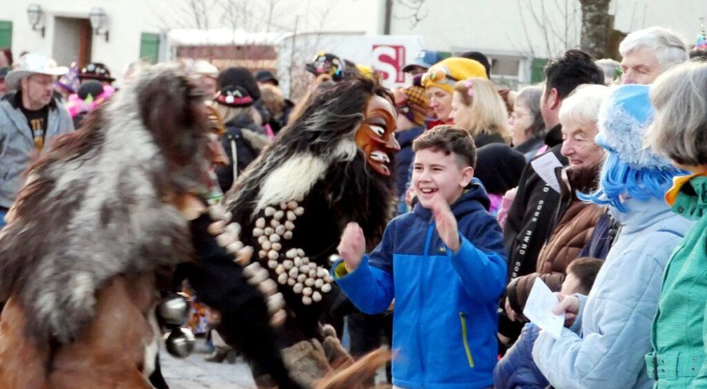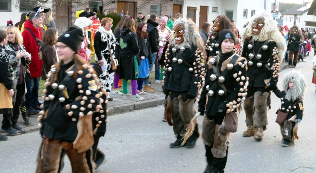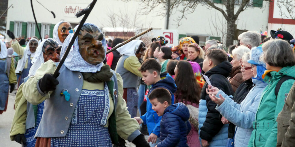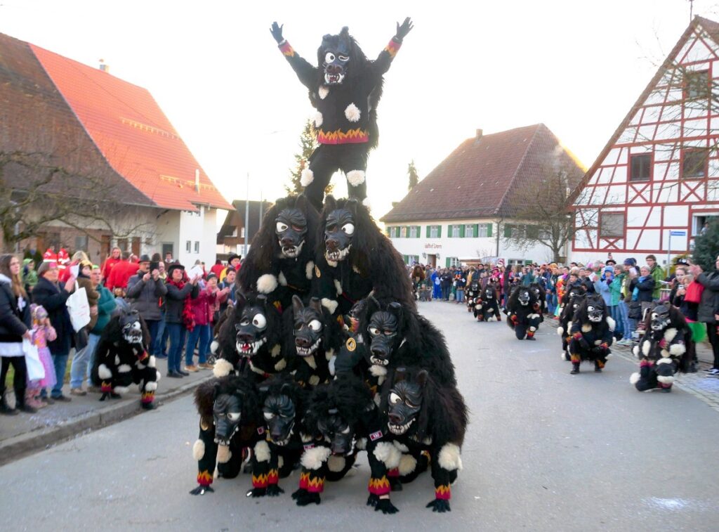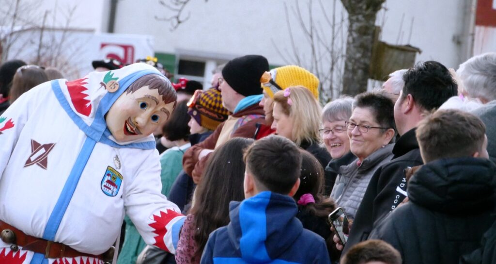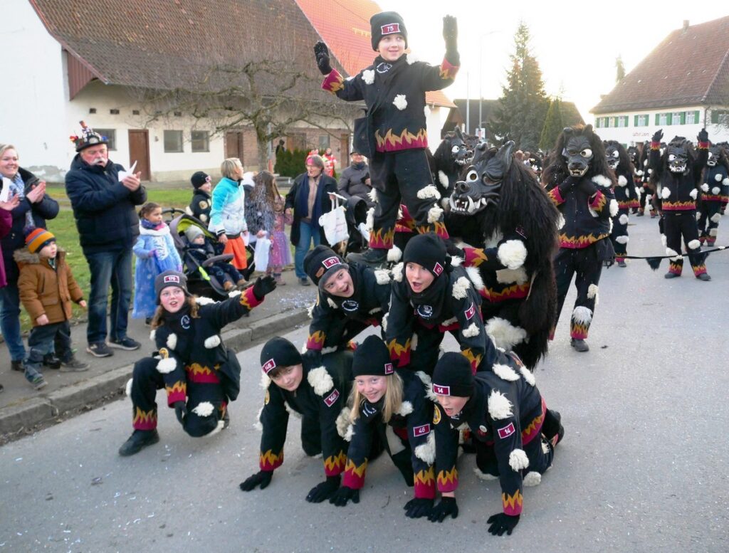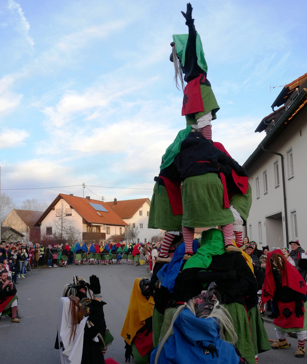 Immer wieder brandete Sonderbeifall auf, wenn sich Narrengruppen sportlich akrobatisch zeigten und ihre Künste beim Pyramidenaufbau zeigten. Besonders kräftig war der Applaus für den närrischen Nachwuchs. Am Ende des Umzugs mit insgesamt 28 teilnehmenden Gruppen hatten sich etliche Maskenträger der einheimischen Narrenzunft eingereiht und präsentierten ihre Masken „Bulla-Rätze“ und „Brunnenhölzler, denn die große Schar der Michelwinnader Maskenträger war als Helferinnen und Helfer im Einsatz.