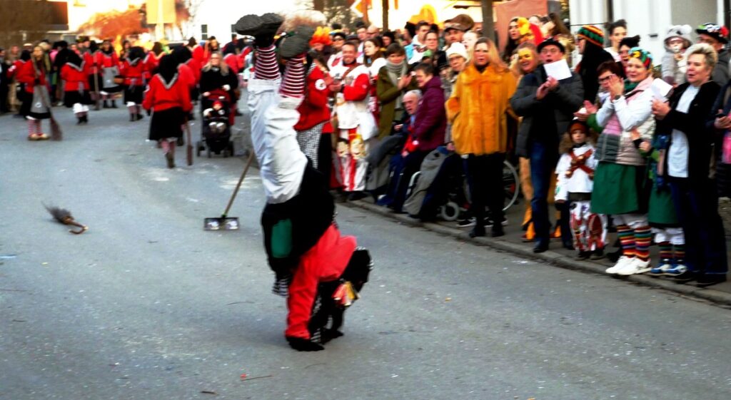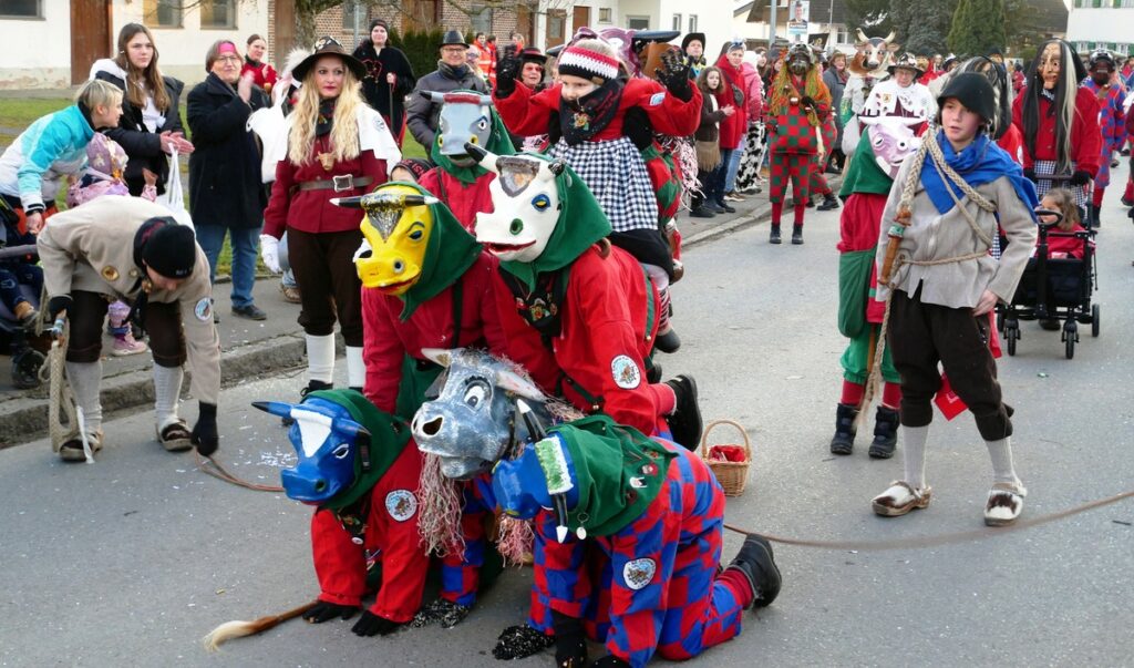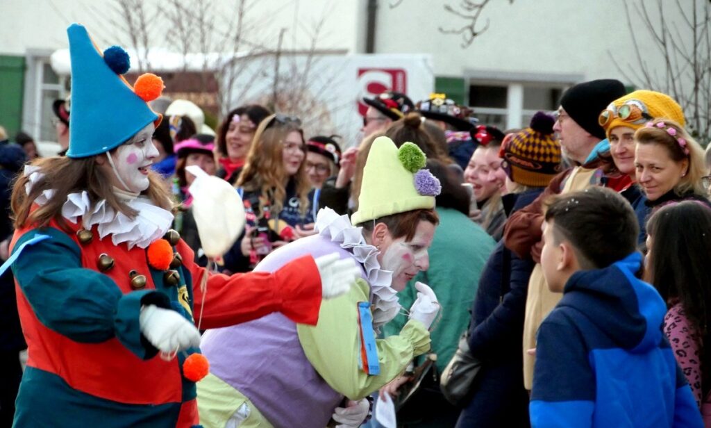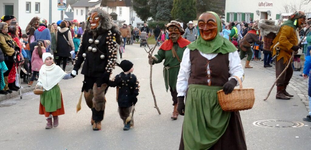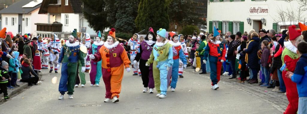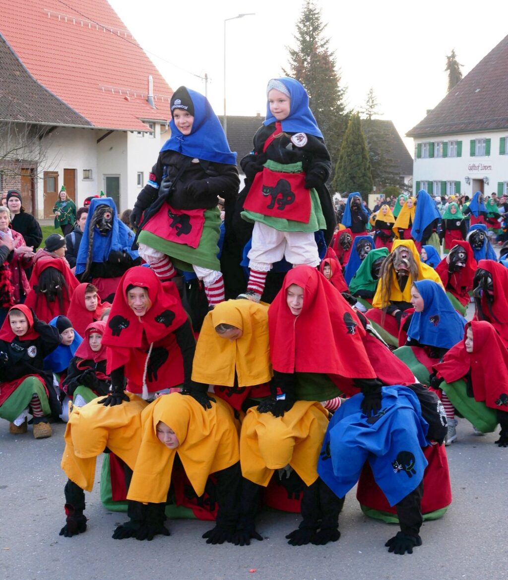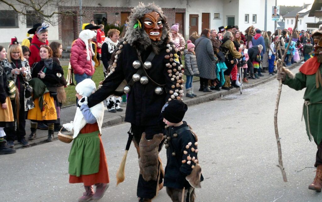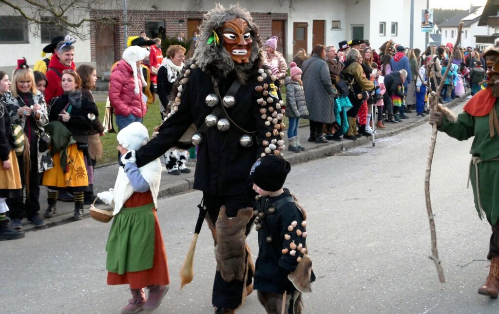 Immer wieder brandete Sonderbeifall auf, wenn sich Narrengruppen sportlich akrobatisch zeigten und ihre Künste beim Pyramidenaufbau zeigten. Besonders kräftig war der Applaus für den närrischen Nachwuchs. Am Ende des Umzugs mit insgesamt 28 teilnehmenden Gruppen hatten sich etliche Maskenträger der einheimischen Narrenzunft eingereiht und präsentierten ihre Masken „Bulla-Rätze“ und „Brunnenhölzler, denn die große Schar der Michelwinnader Maskenträger war als Helferinnen und Helfer im Einsatz.
