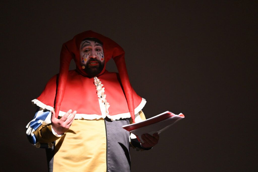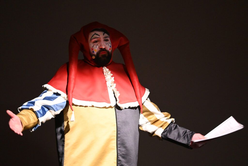 Dann kam die Stunde des Hofnarrren. Kinder und Narren tun die Wahrheit kund, sagt der Volksmund, und nur der Hofnarr kann seinem Souverän ungeschminkt die Wahrheit ins Gesicht sagen. Maximilian Klingele meisterte seinen Part sehr souverän. Chapeau für dieses Gedicht, das im Versmaß stimmig und vom Inhalt zwischen lustig und grimmig von Anfang bis zum Ende die Zuhörer in seinen Bann schlug. Der Narr fand die richtige Balance zwischen Witz (über sein neues Häs für vollschlanke Männer und die Reproduktion der Prinzengruppe) und Ernst mit seinem Ausblick auf die unfriedliche Welt und wurde mit seinem Appell an die Demokraten recht politisch. Er fand dann auch wieder zurück ins Lokale und nahm genüsslich die Fehler und Versäumnisse im Städtle aufs Korn.