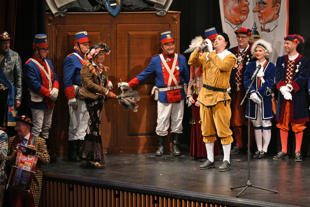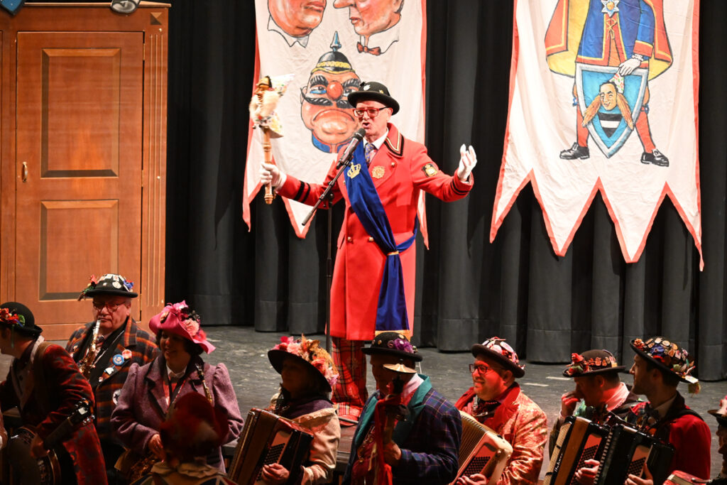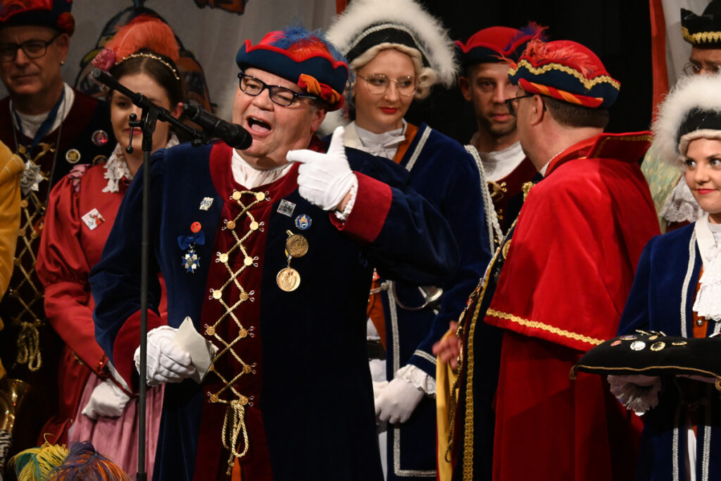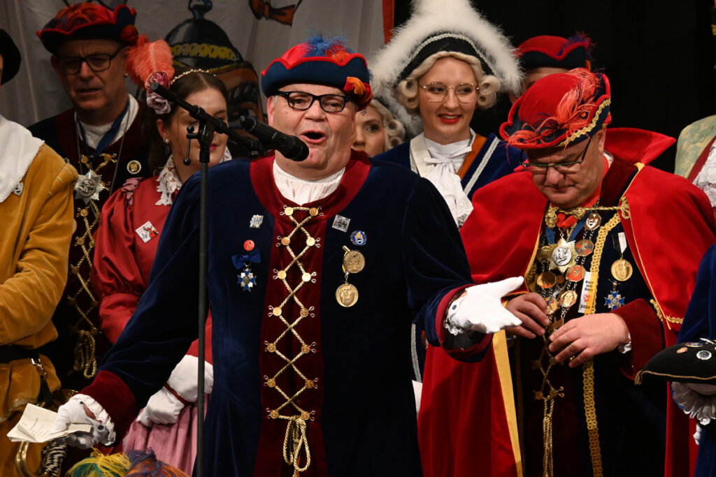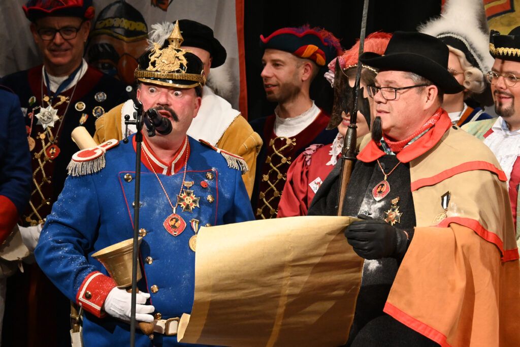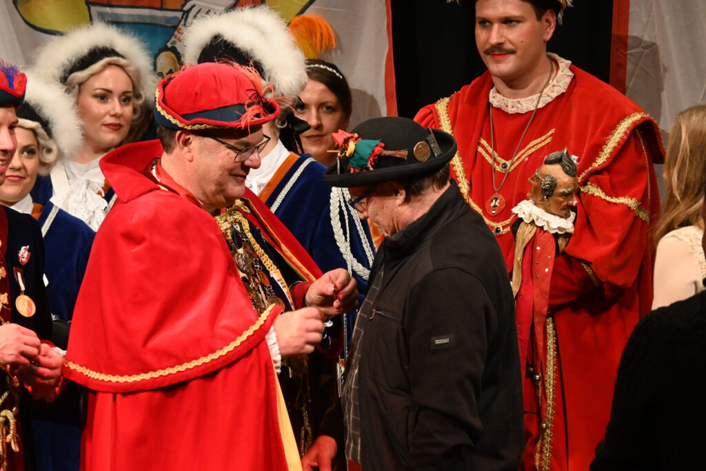 Nach ein paar Schunklern kommt der große Augenblick für Elmar Kibler, den Ordenskanzler. Er macht seine Sache gut und bringt mit seiner witzigen Moderation die Orden an Mann und Frau. So kurzweilig wie in diesem Jahr war die Ehrung selten. Nur das Sammlervölkle musste etwas darben. Denn laut Regieanweisung müssen die Sammlerinnen und Sammler als bunte Staffage völlig trocken rechts vor der Bühne stehen.