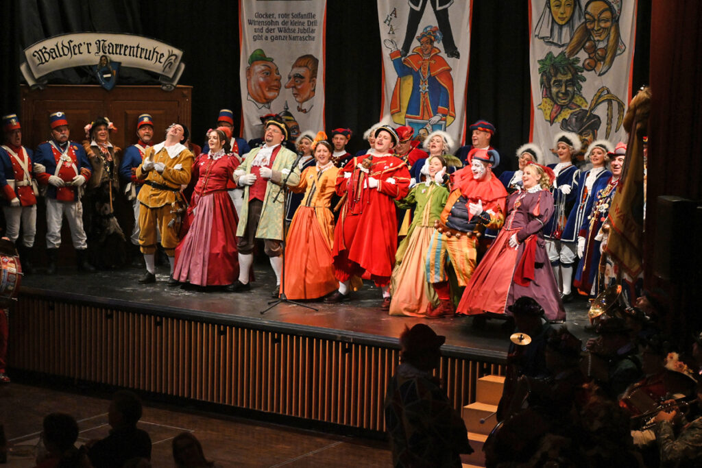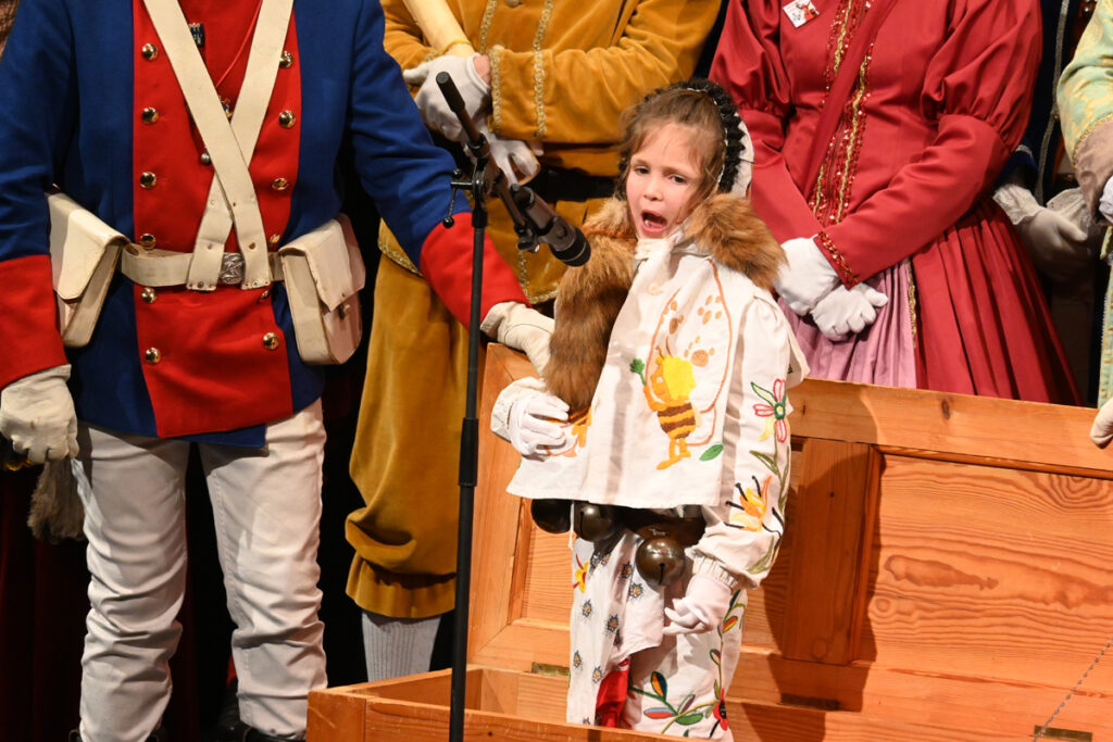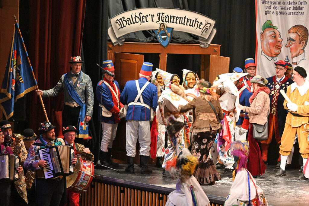 Dann, ein berührender Moment, wenn das kleine Mäschkerle aus seiner Kiste steigt, mit zarter Kinderstimme sein AHA ruft. Darauf der Büttel von der kleinsten, aber sympathischsten Randgruppe der Waldseer Fasnet. Von Franz Müller, stimm- und wortgewaltig, wird ausgeschellt, was die Waldseer angestellt. Dann dürfen die Masken aus der Truhe. Das Federle macht den Anfang, gefolgt von Narro und Faselhannes, Schorrenweible und zum guten Schluss das Schrättele. Jetzt ist alles auf der Bühne, was Waldsee an Narren aufzubieten hat.