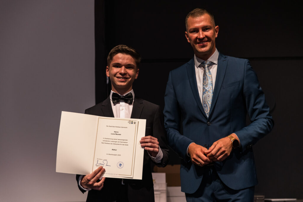 Den Scheffelpreis erhielt in diesem Jahr Caroline Kopf, die eine würdige Preisträgerinnenrede hielt. Schulleiter Mark Overhage unterhielt die Gäste mit der Würdigung der Abiturienten in Anspielung auf ihr Motto „Abierle“ und auch Oberbürgermeister Henne, der dem besten Abiturienten Luca Neuner mit einem 1,0 Schnitt (rechnerisch sogar besser) den Preis der Stadt Bad Waldsee überreichte, hielt eine Rede zu Ehren der 13er, von denen insgesamt 16 Schülerinnen und Schüler Leistungspreise erhielten (im Anschluss mit Schnitt vermerkt). Das Abiturzeugnis, einmal auch das Fachabitur, erhielten: