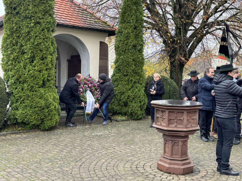 Die Musikkapelle Haisterkirch unter Leitung von Daniel Maucher intonierte zu Beginn der Gedenkveranstaltung Choralweisen und zum Ende der Gedenkfeier das Lied „Ich hatt´ einen Kameraden“, während zwei Angehörige des Ortschaftsrats (Markus Bohner und Matthias Covic) das Trauergebinde der Ortschaft vor der Kriegsopfer-Gedenkstätte niederlegten.